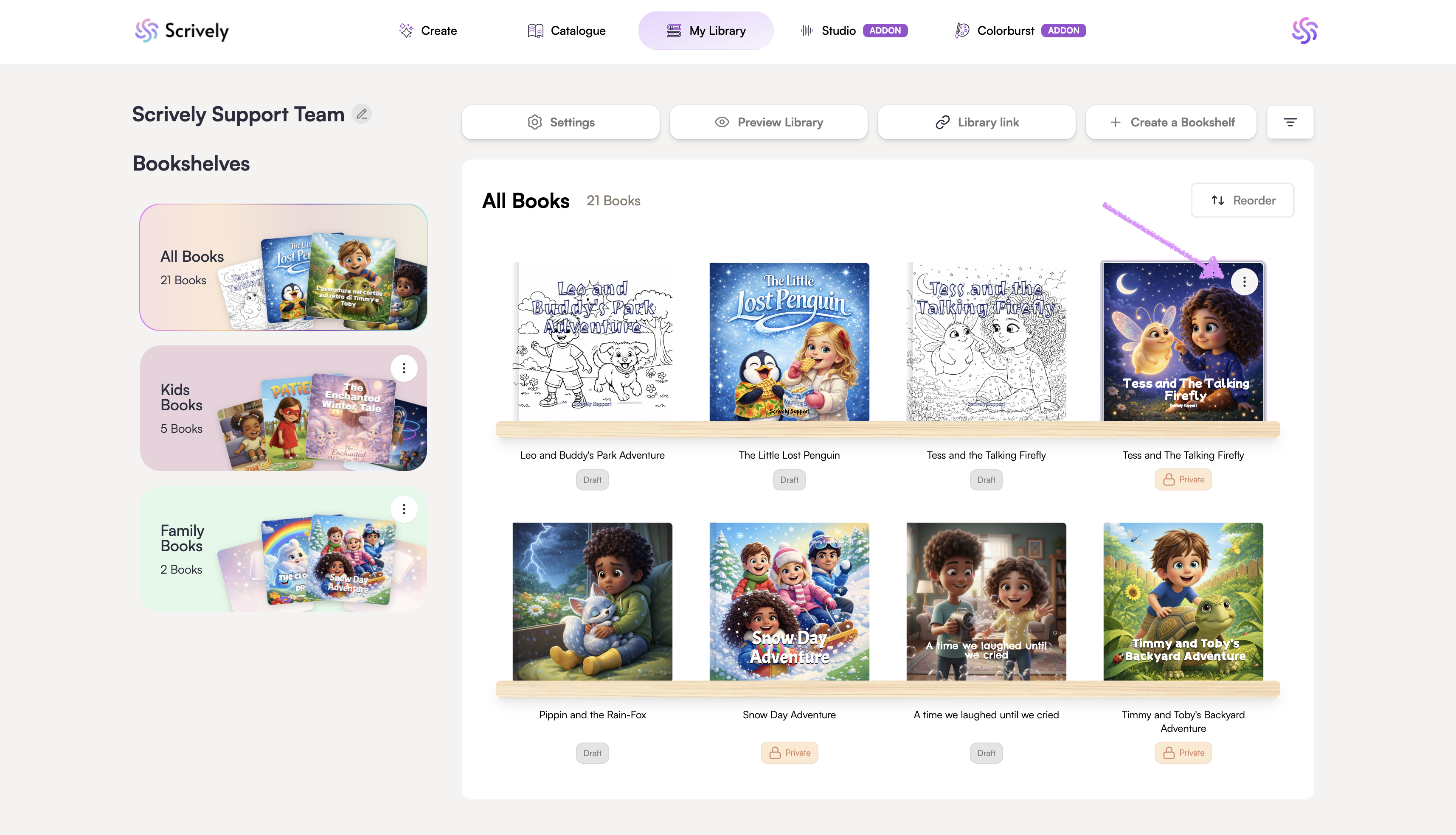Your "Bookshelves" are your library within Scrively, where you can easily access, manage, and continue working on all of your books. Whether you’re editing a recent draft, reviewing a completed title, or preparing for print, this section gives you a streamlined view of everything you’ve created.