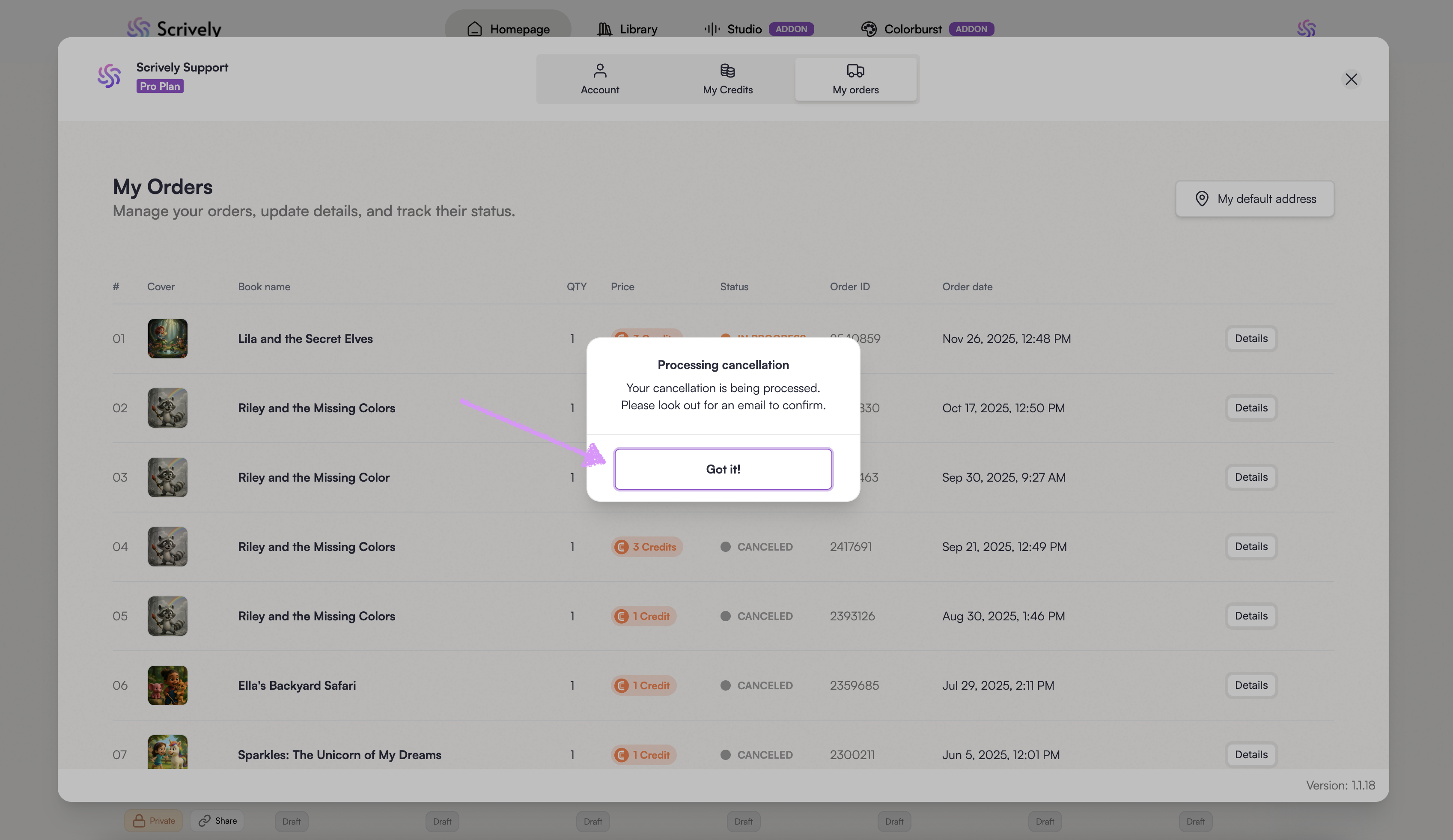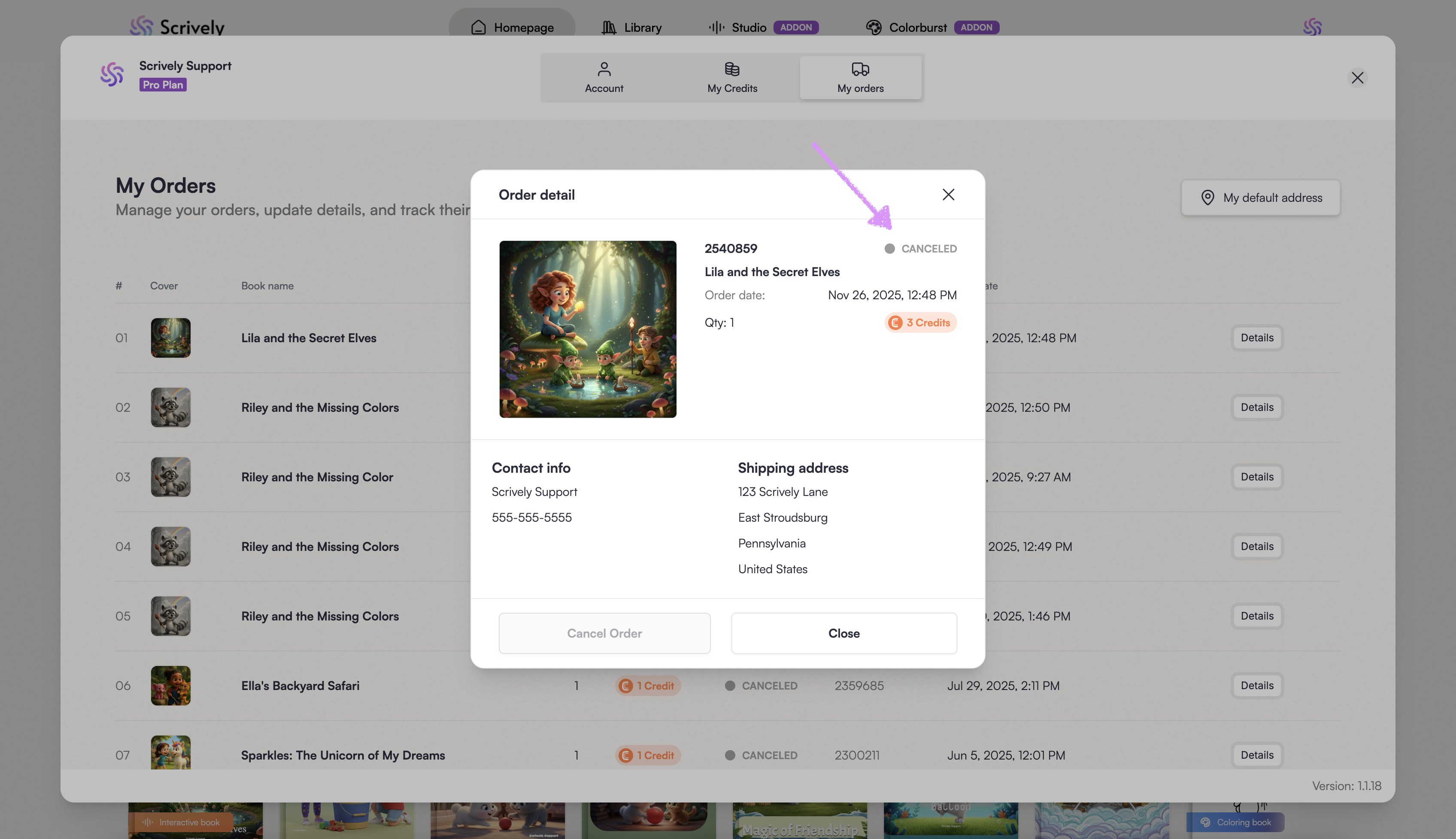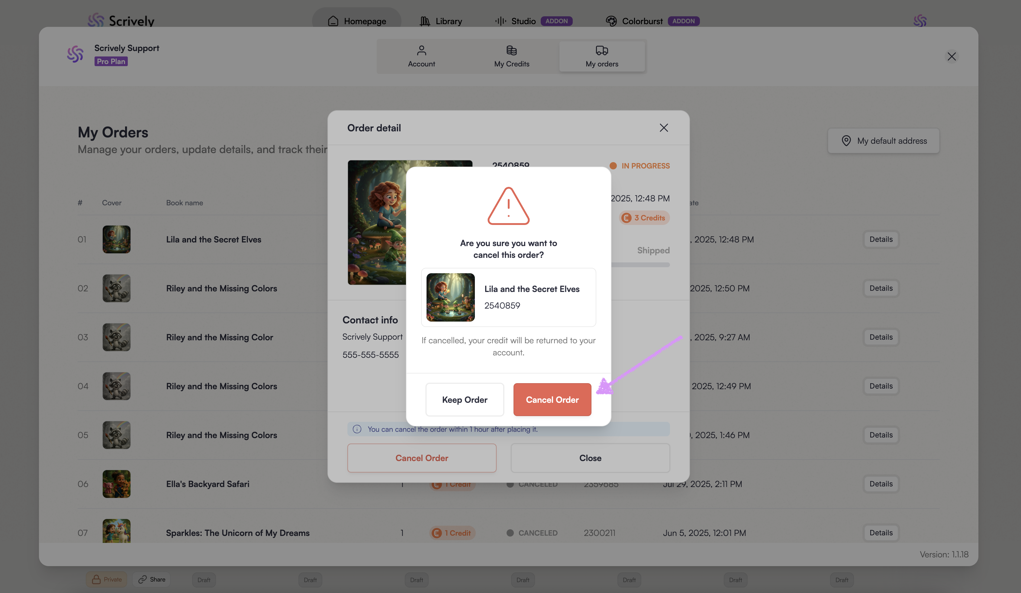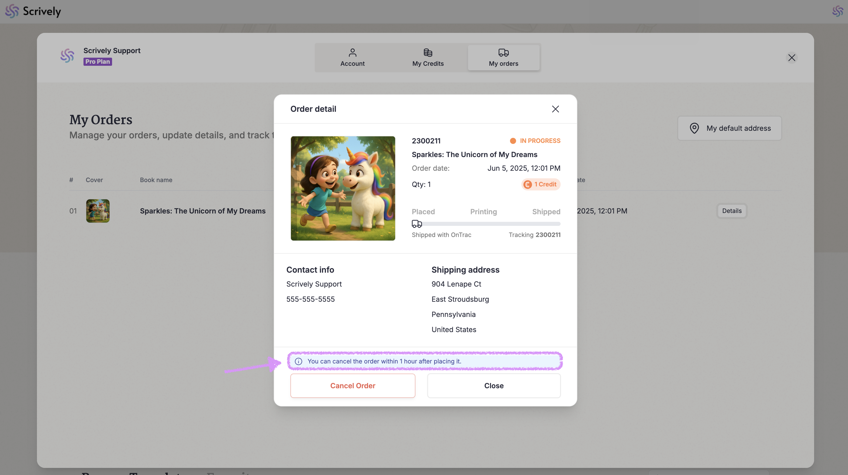 Need to make a change after placing a book order in Scrively? No problem. Scrively allows you to cancel an order within one hour of placing it.
