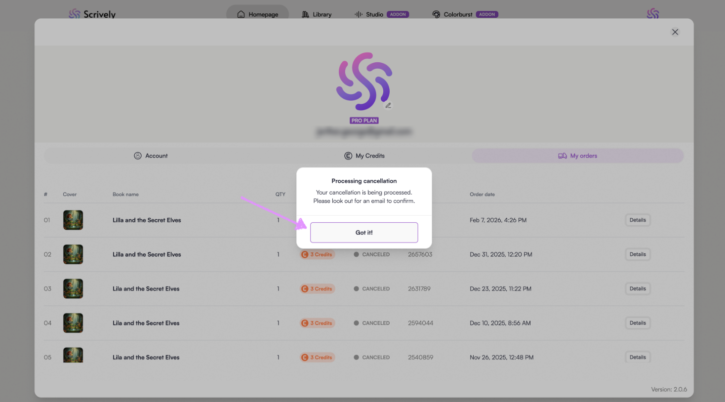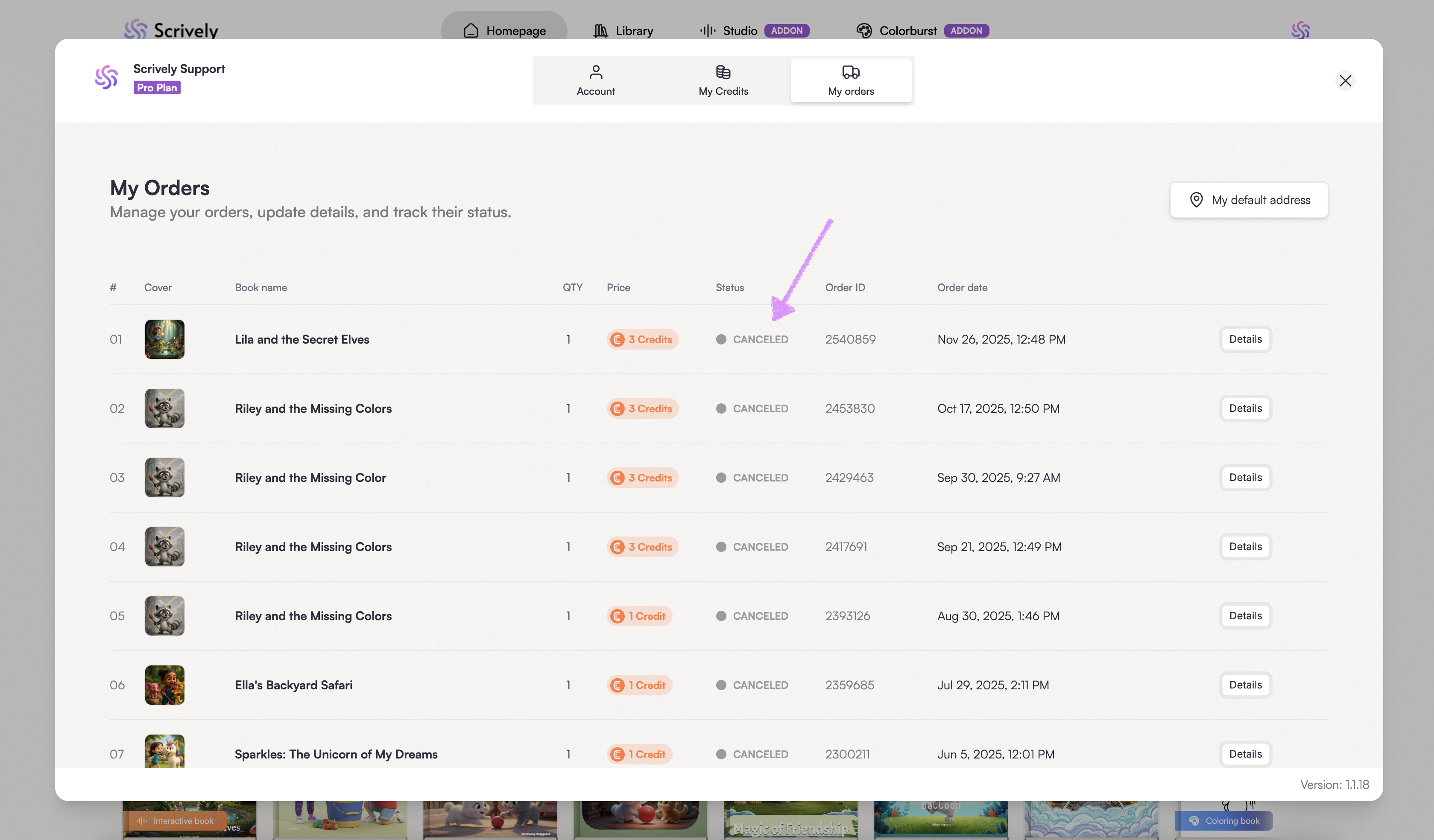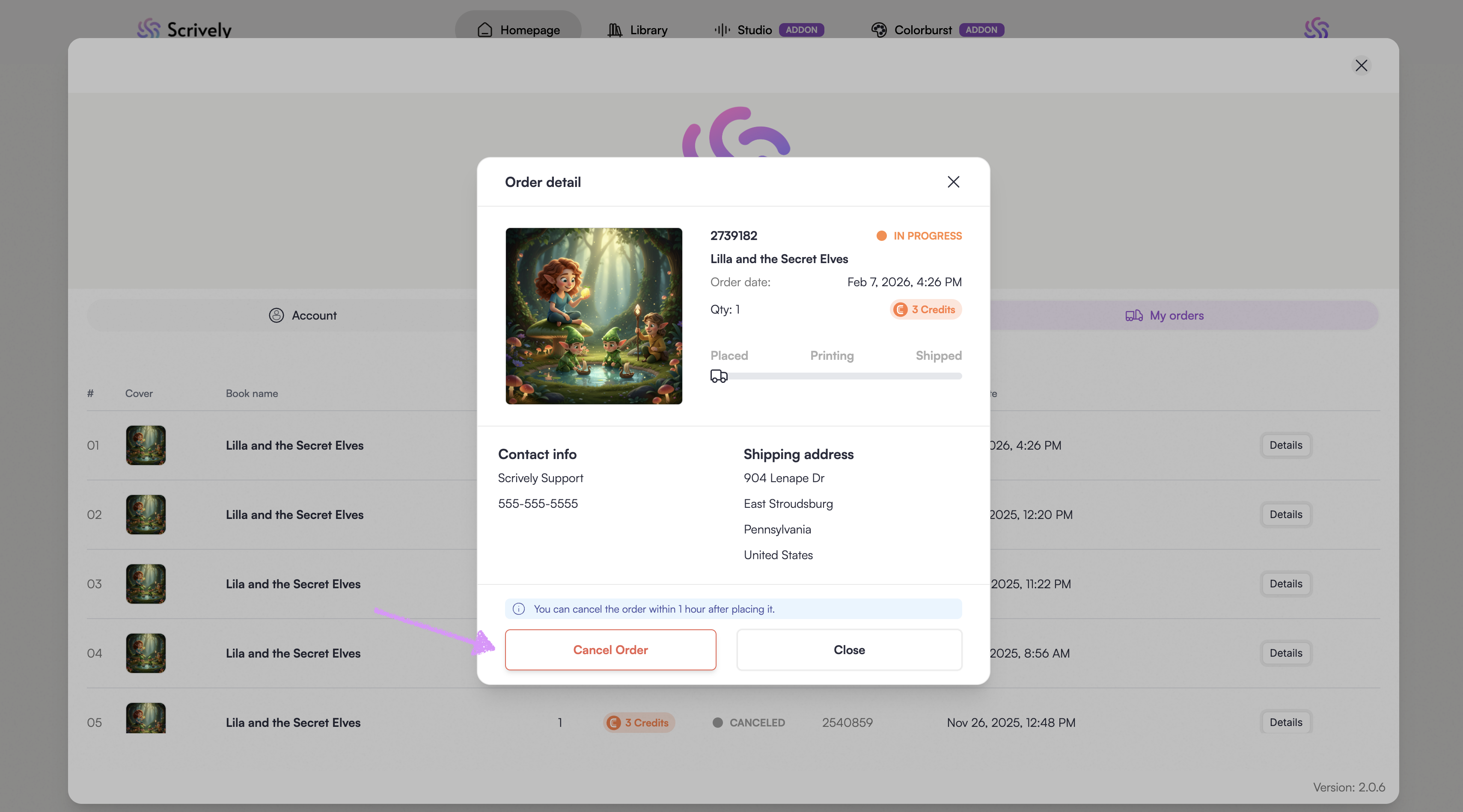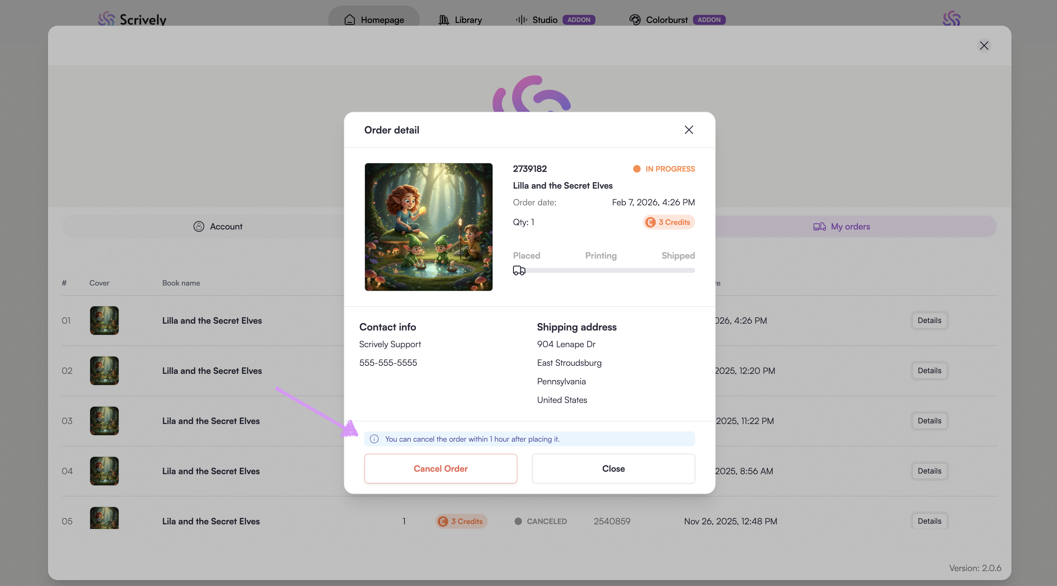 Need to make a change after placing a book order in Scrively? No problem. Scrively allows you to cancel an order within one hour of placing it.