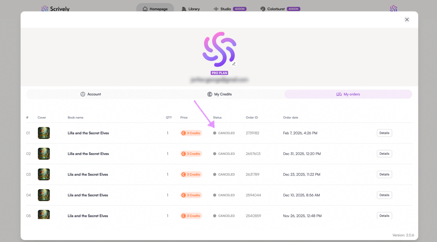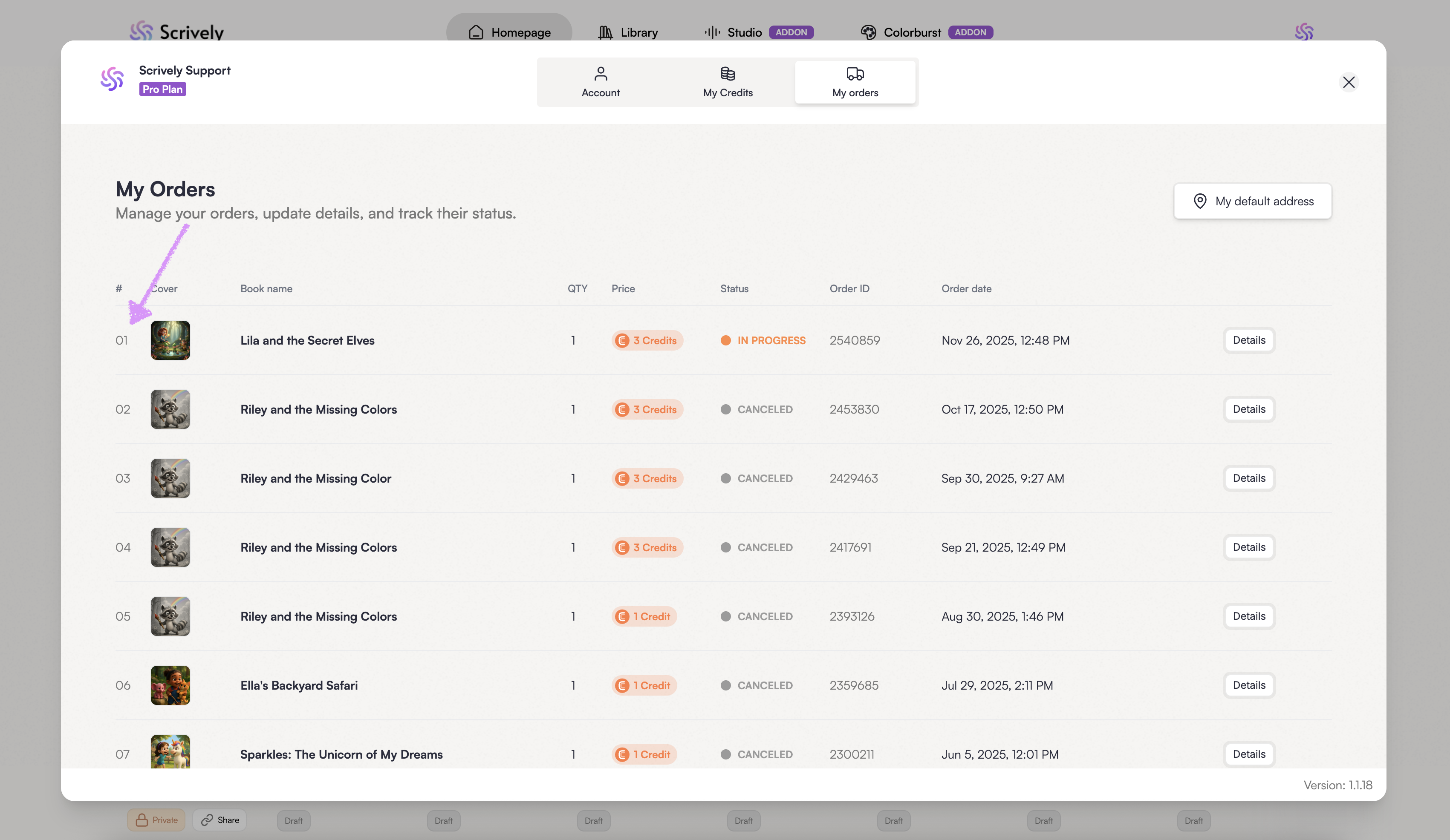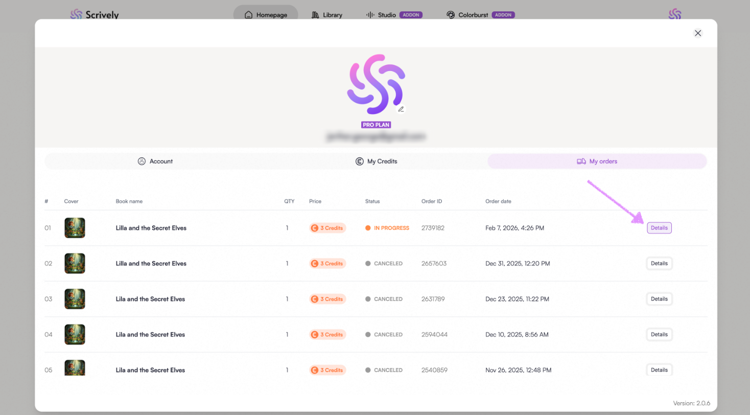 In the "My Orders" view, you’ll find detailed information about your orders, including the order number, cover image, book title, quantity ordered, credits used, order status, order ID, and the date the order was placed.