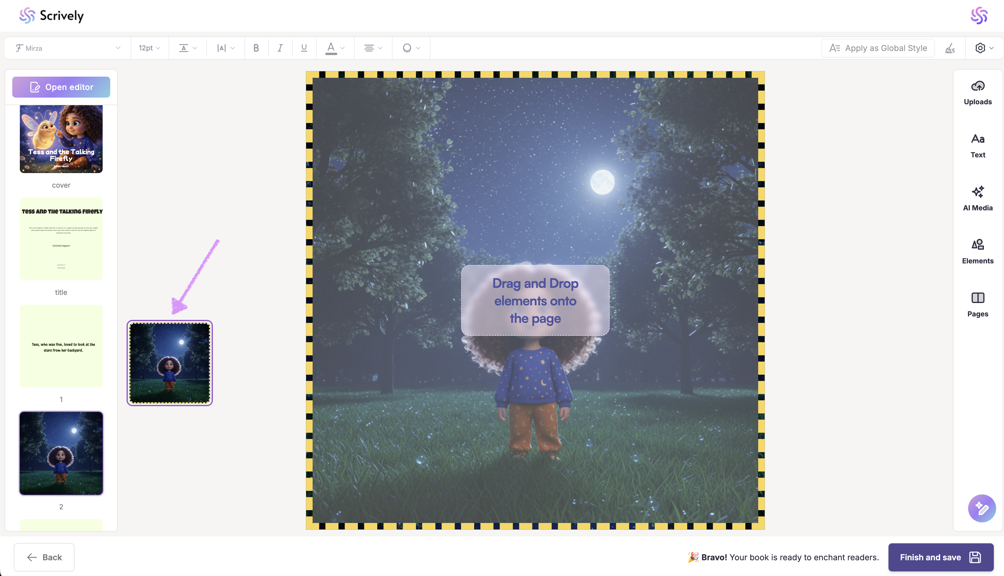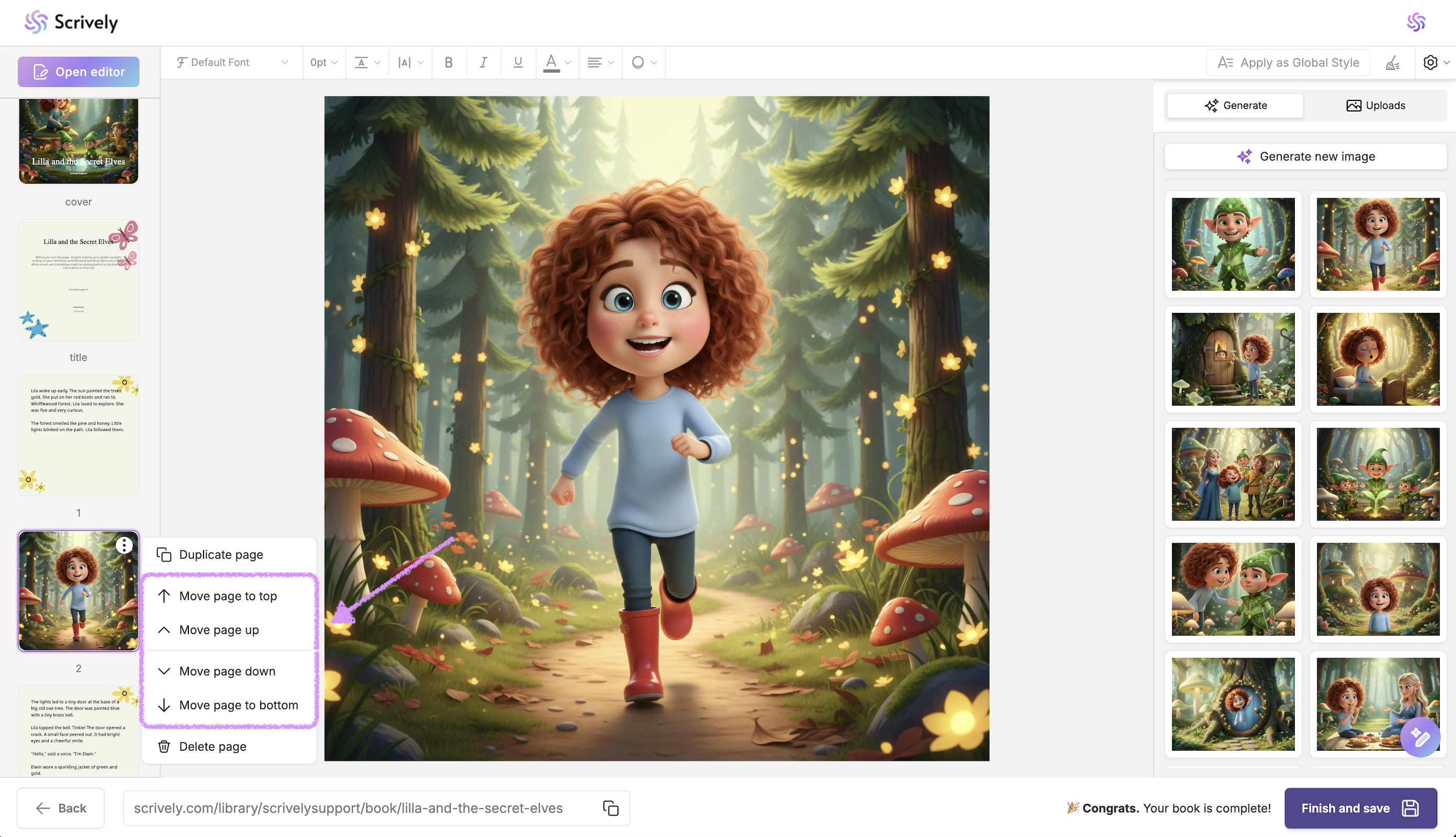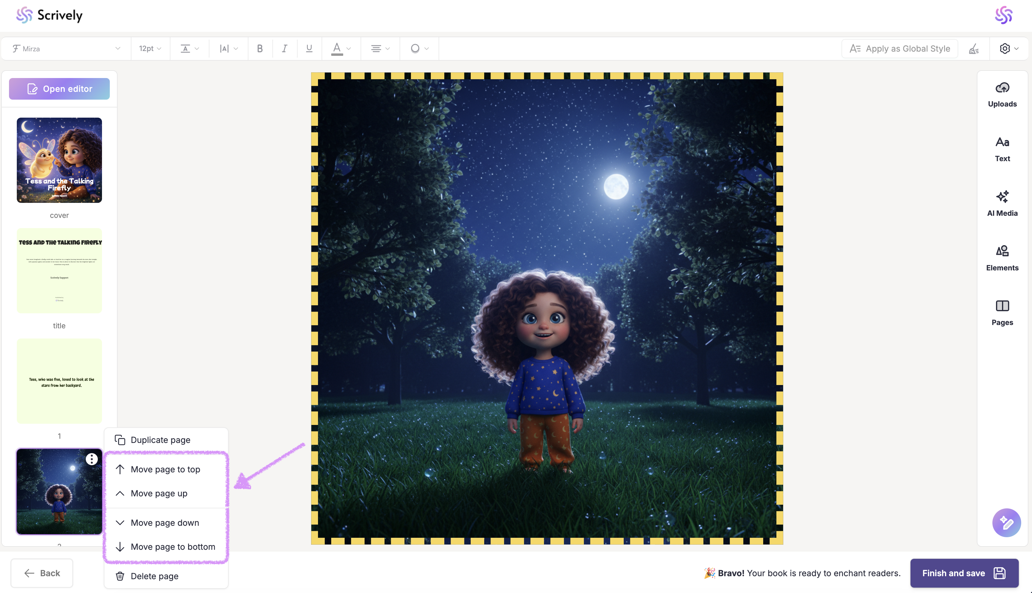 Looking to fine-tune the pacing of your story or reposition a scene for better flow? Scrively makes it simple to move pages up or down, so you can easily organize your layout and keep your book just the way you envision it.