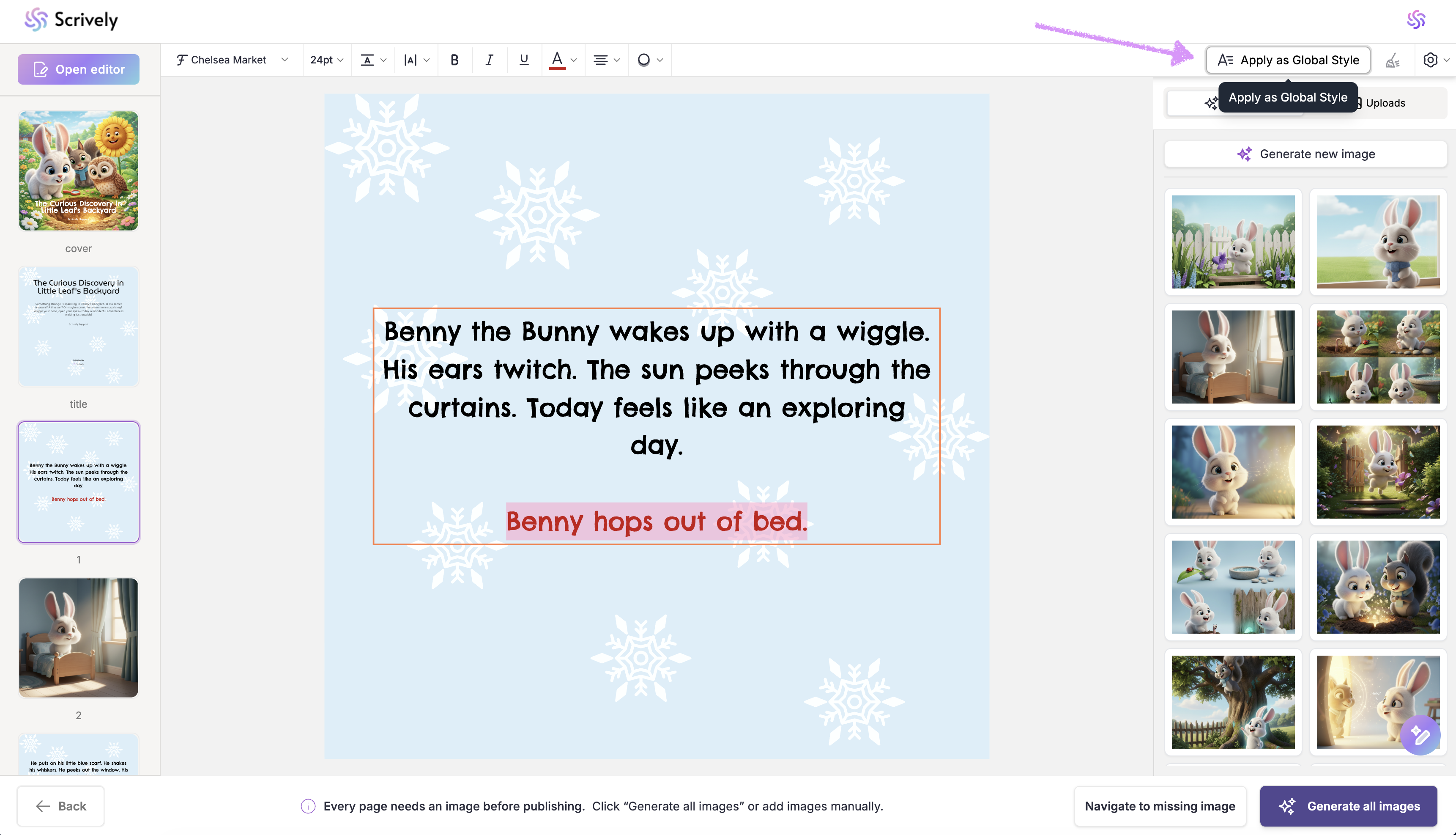 In the quick action menu, you can apply the style from your current page to all pages. Highlight the text, then click “Apply as Global Style.”