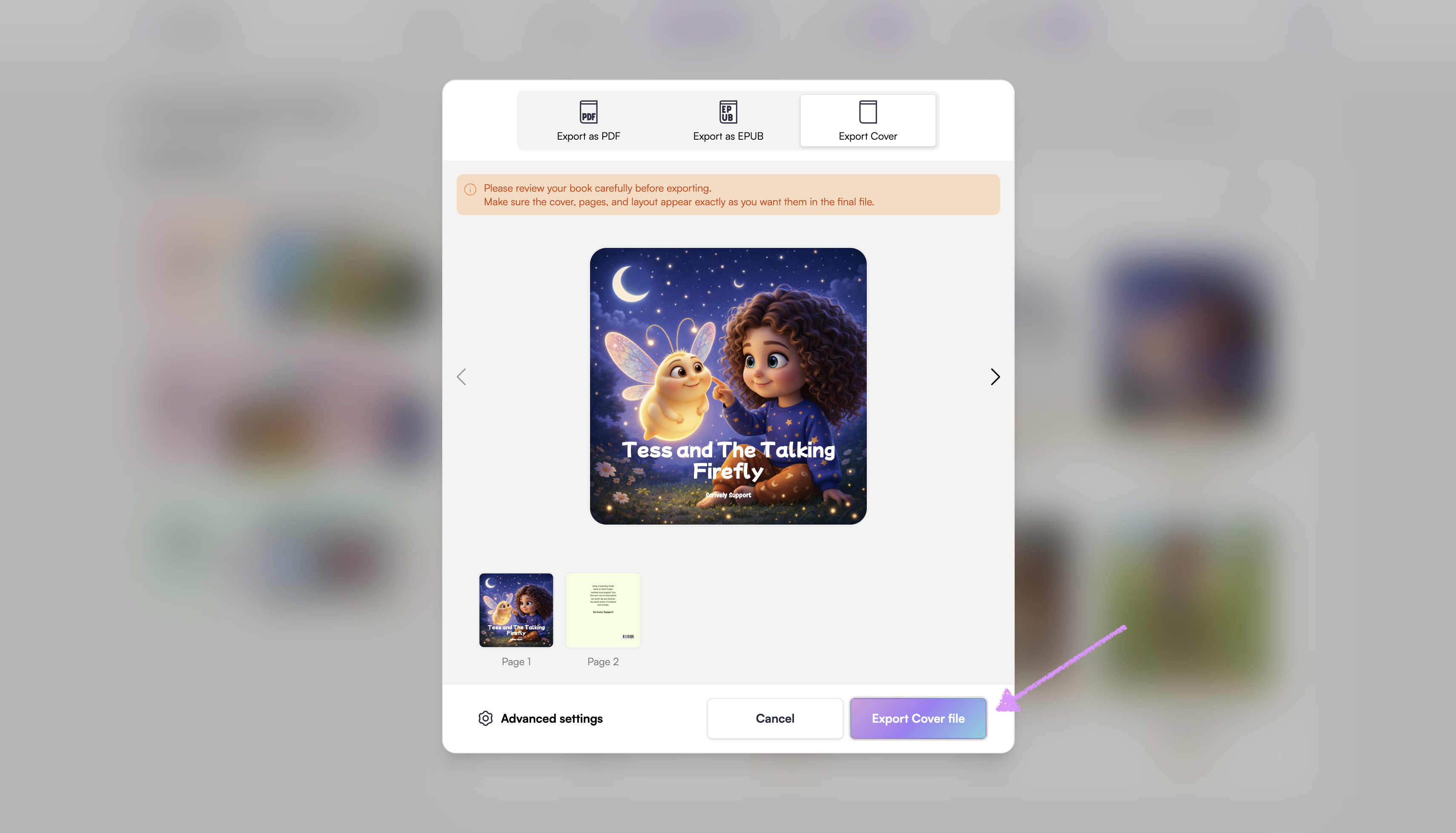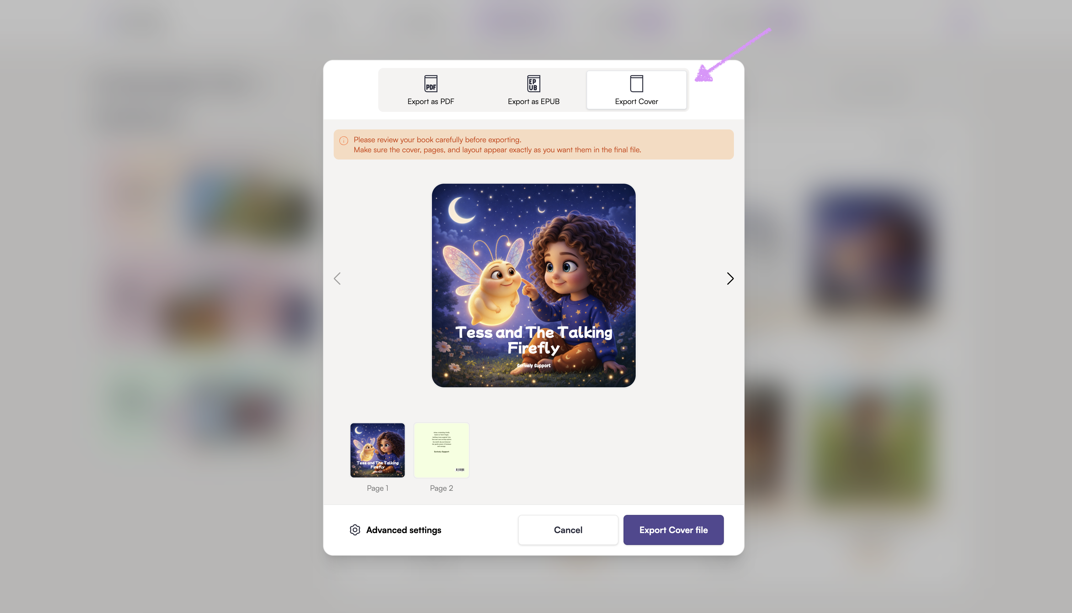 Use the left and right arrows to navigate through the cover pages. Review it carefully before exporting.