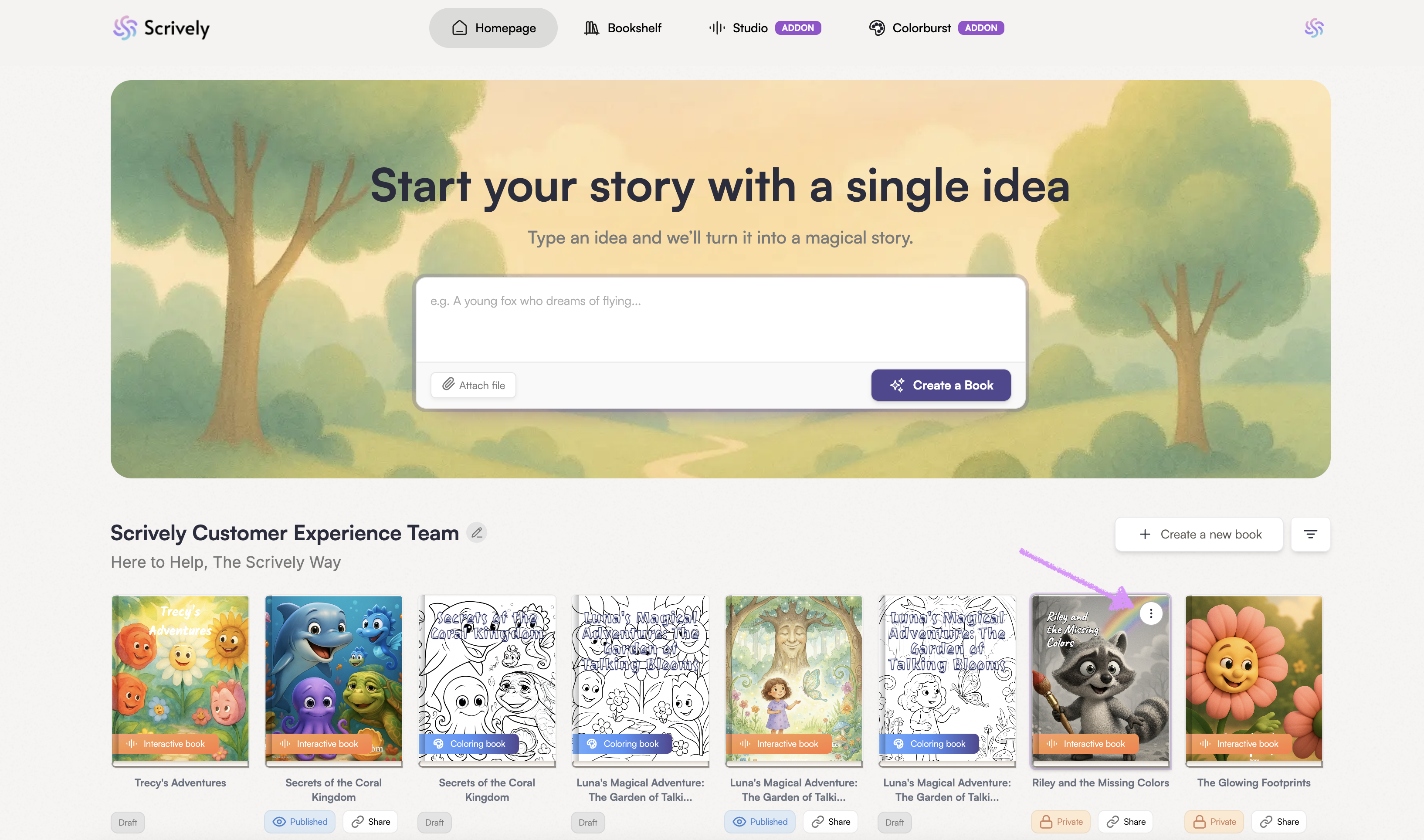 From your Scrively Homepage, go to your Bookshelf and hover over the book you’d like to download as an EPUB. Click the ellipsis (⋮) menu that appears.