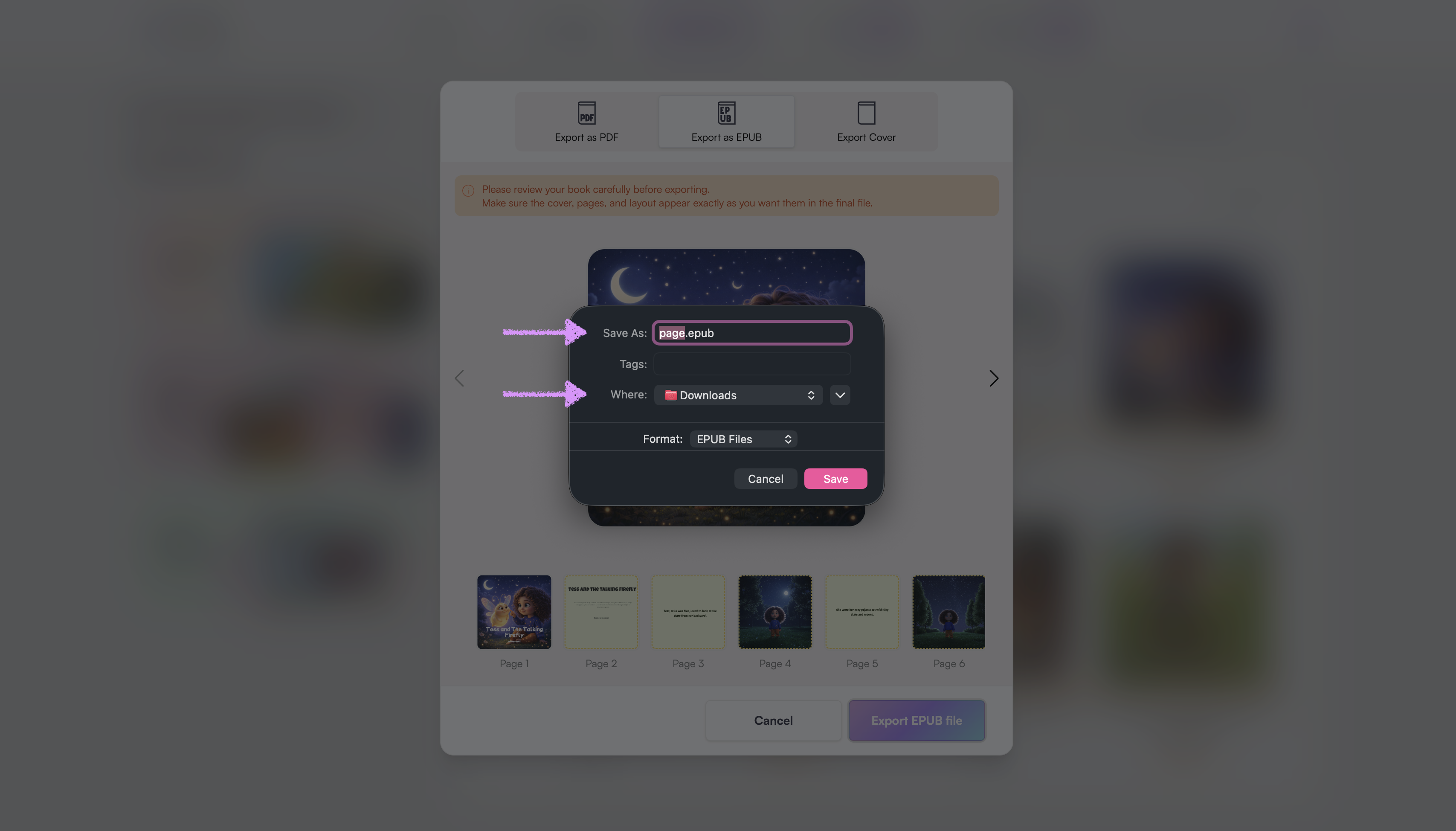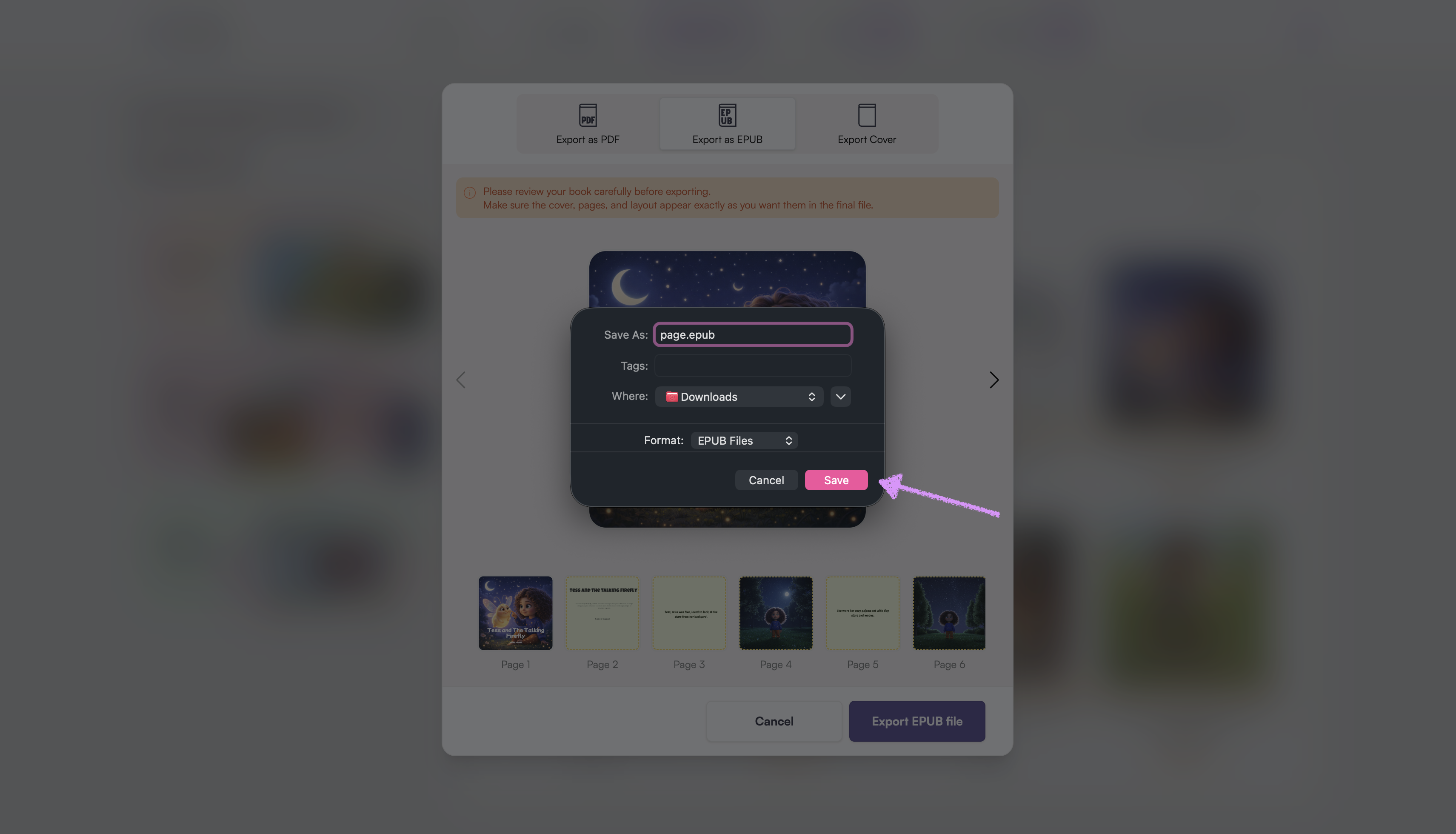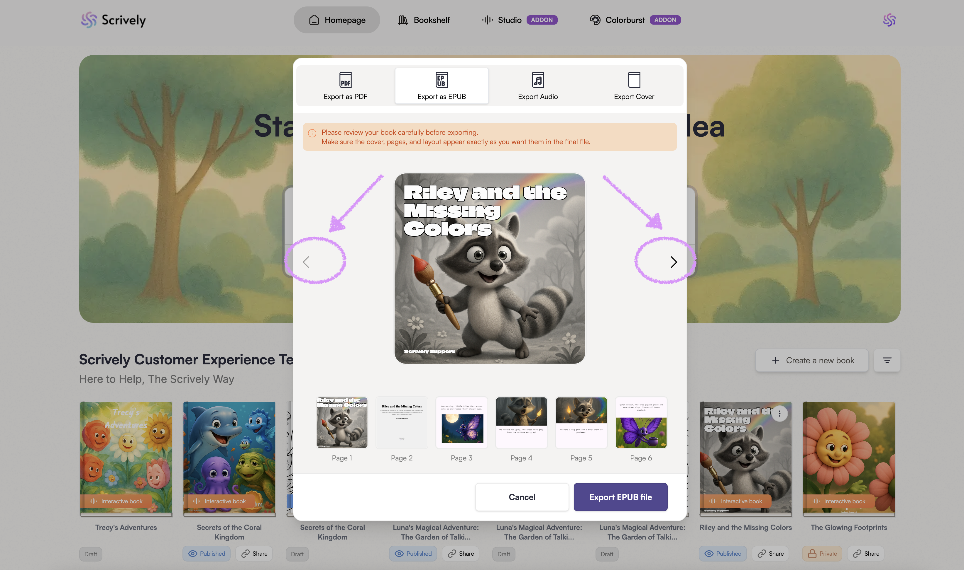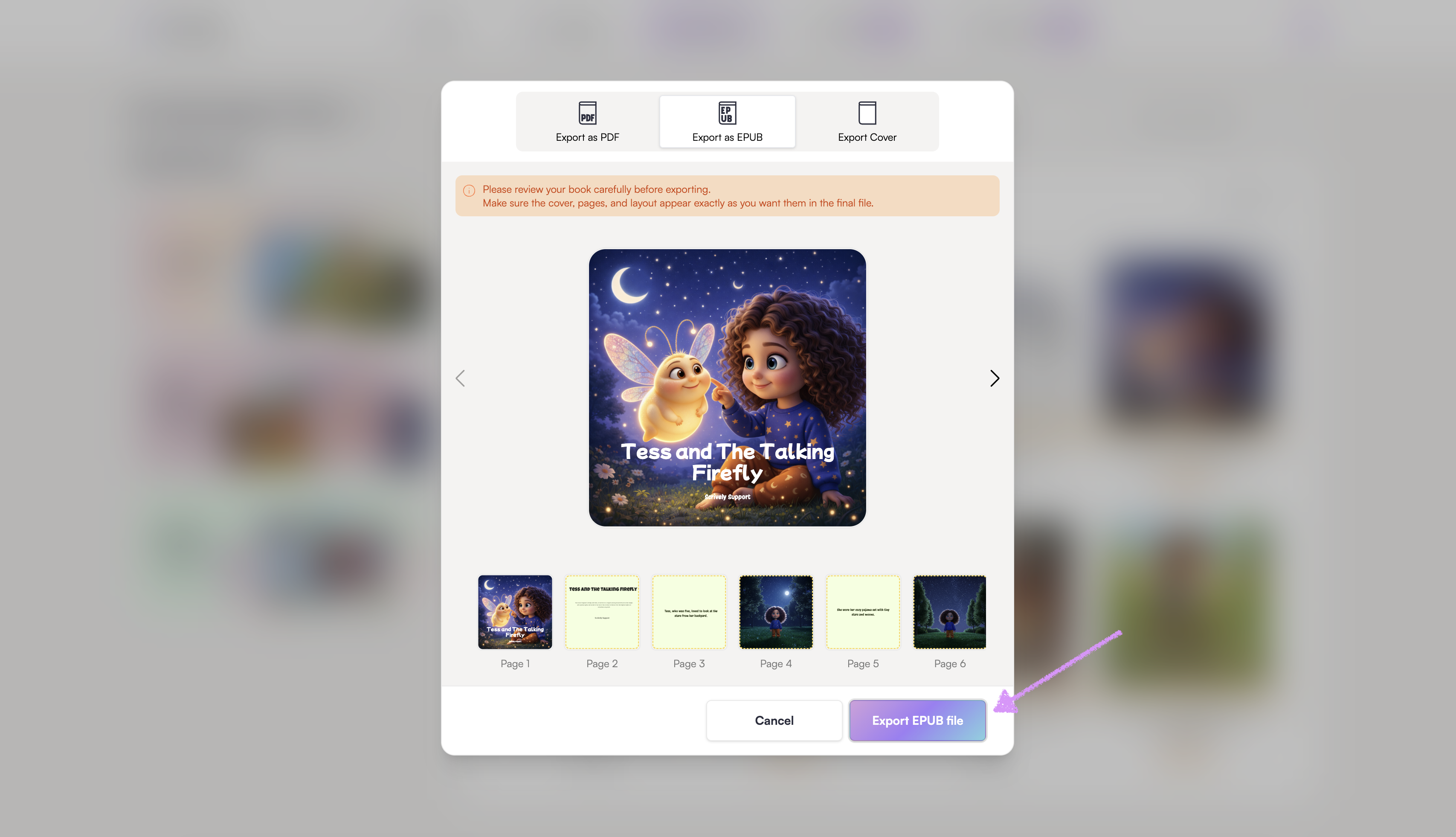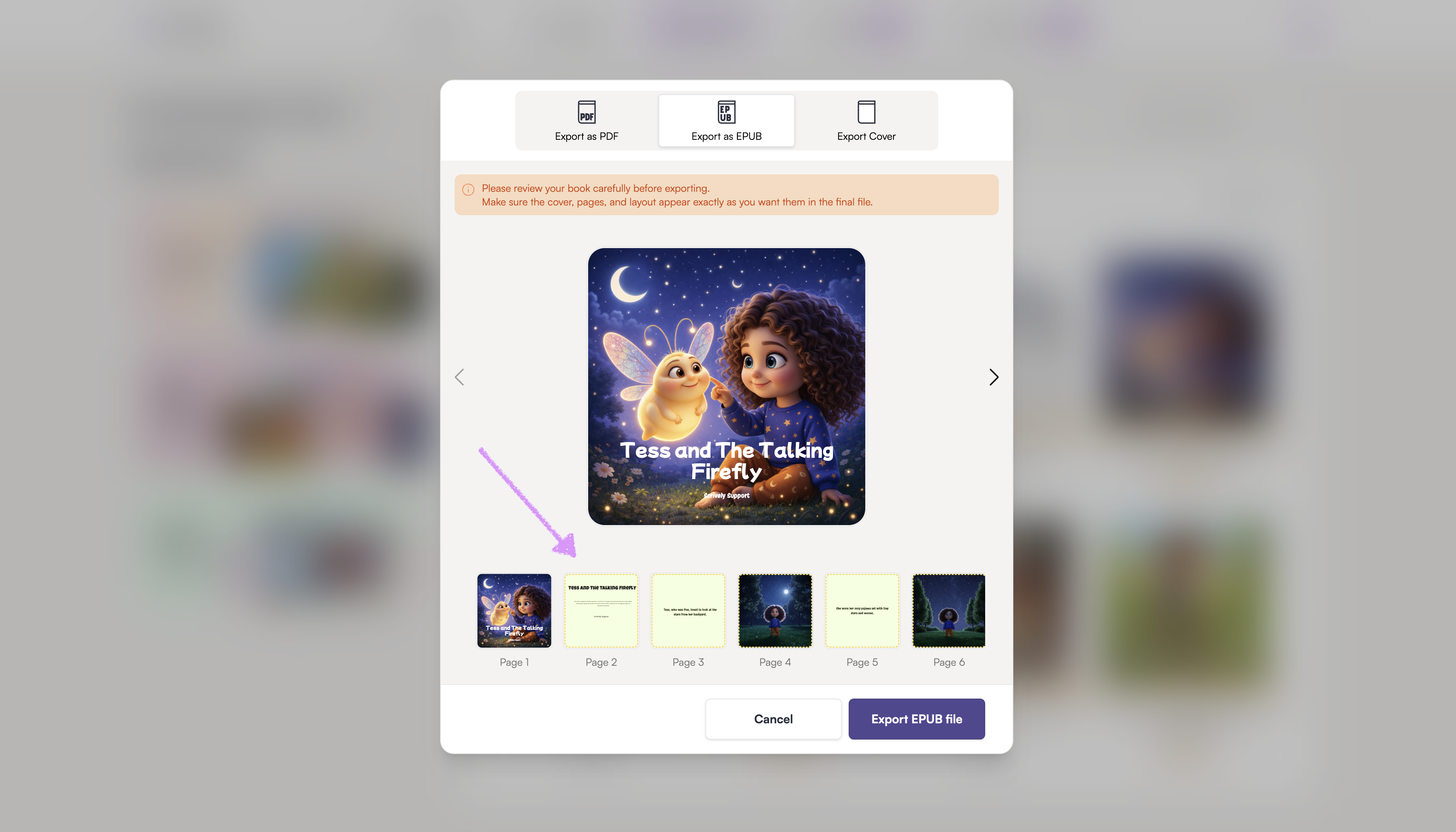 Use the left and right arrows to navigate through the pages. Review your book carefully before exporting.