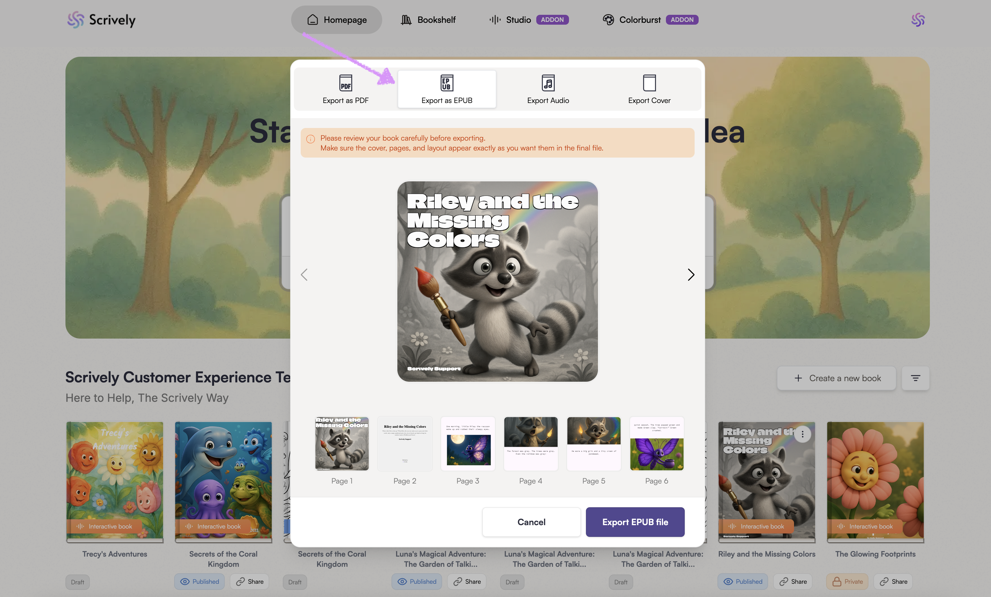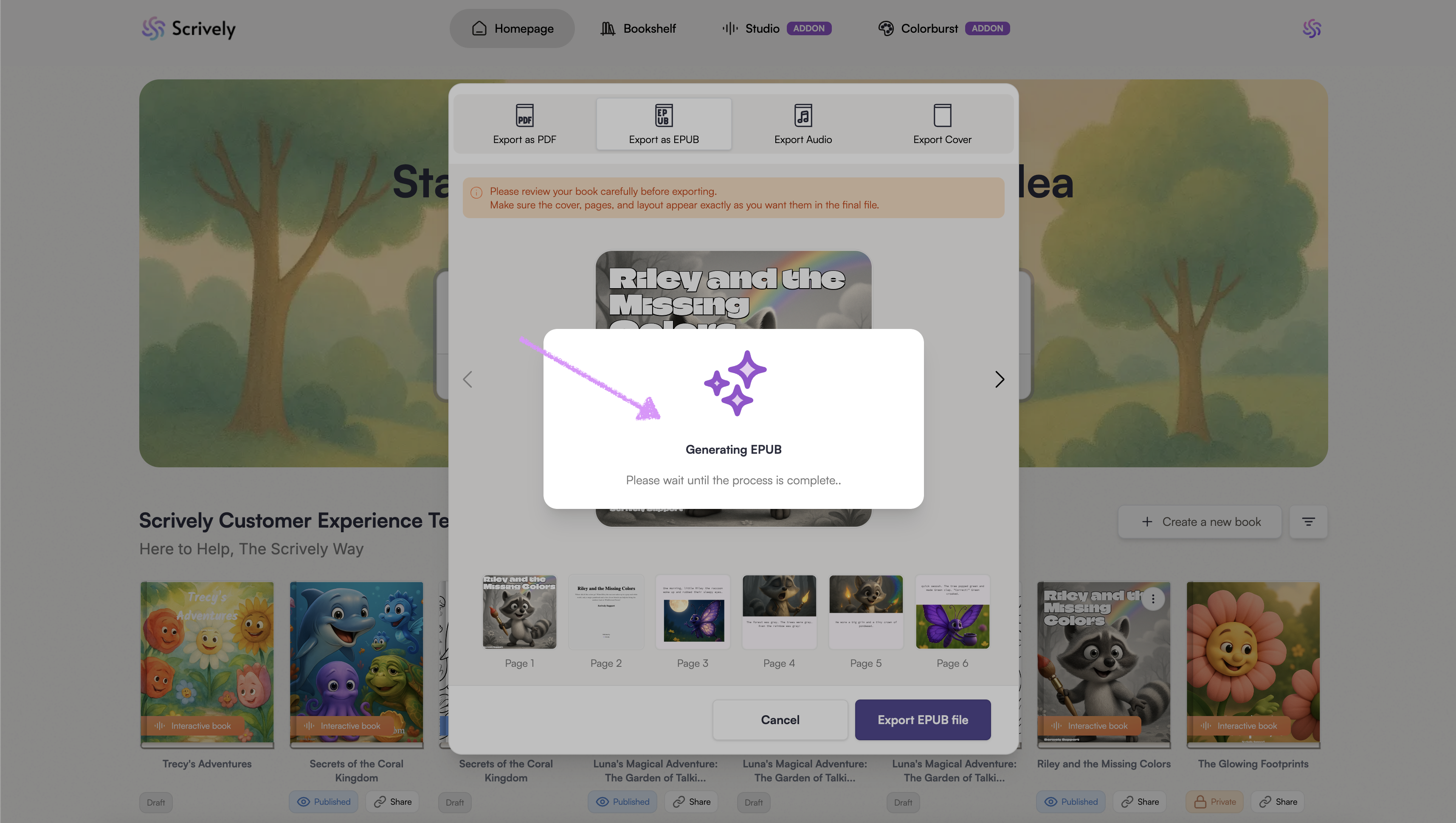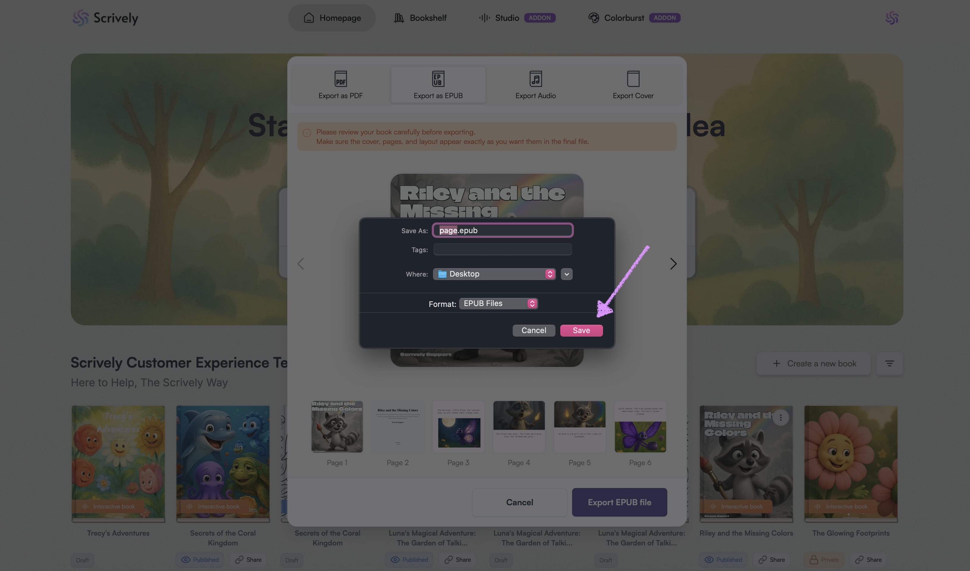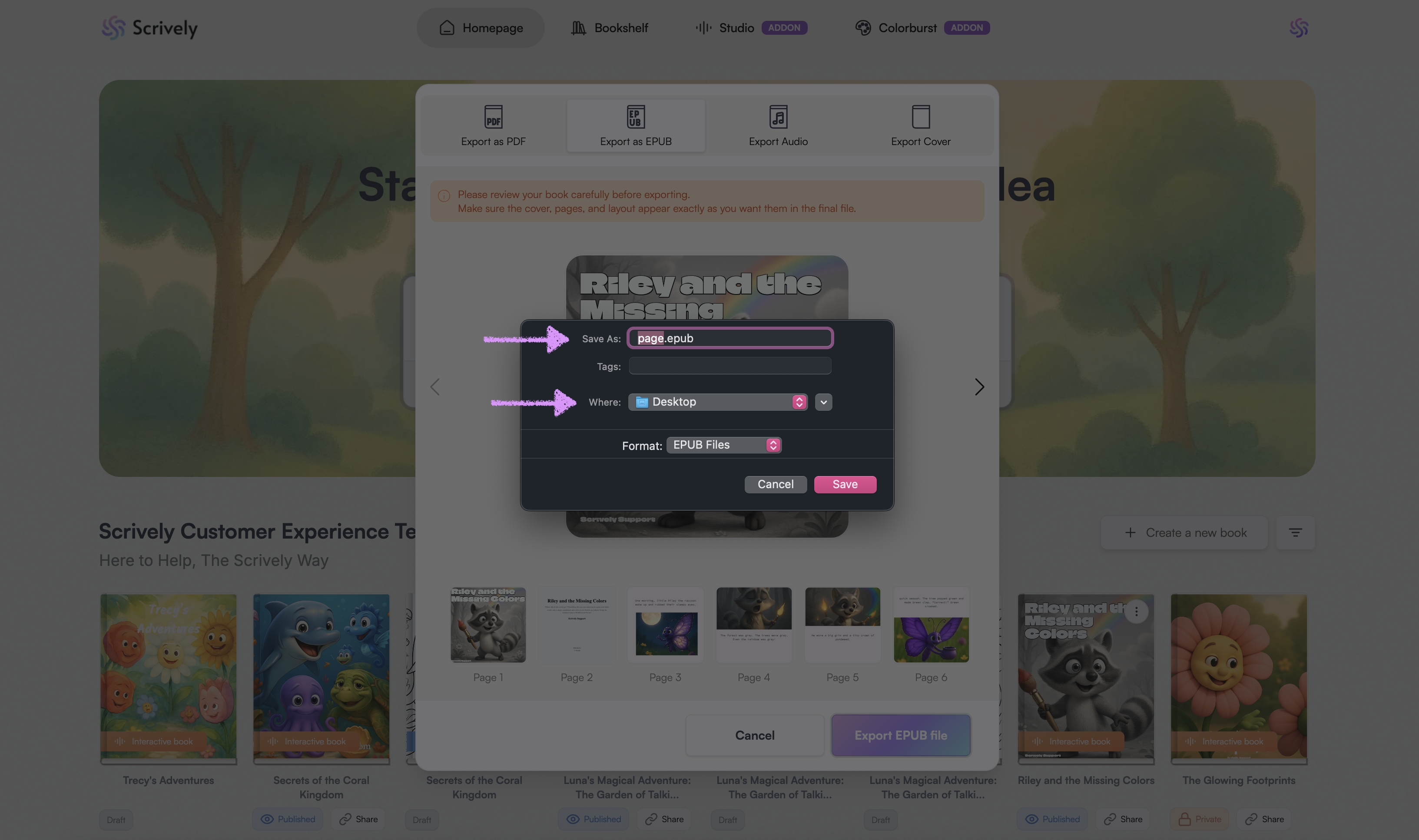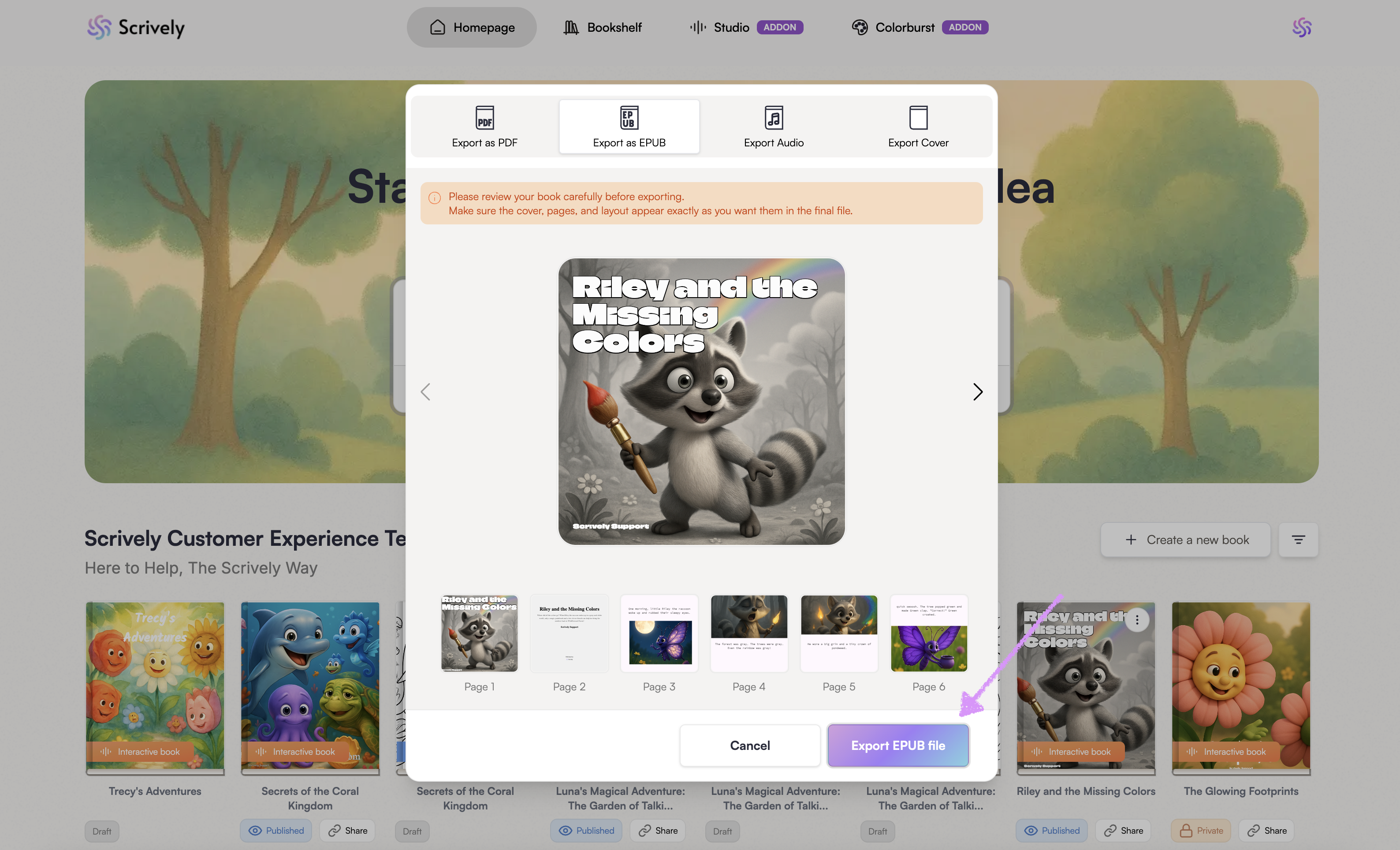 Use the left and right arrows to navigate through the pages. Review your book carefully before exporting.