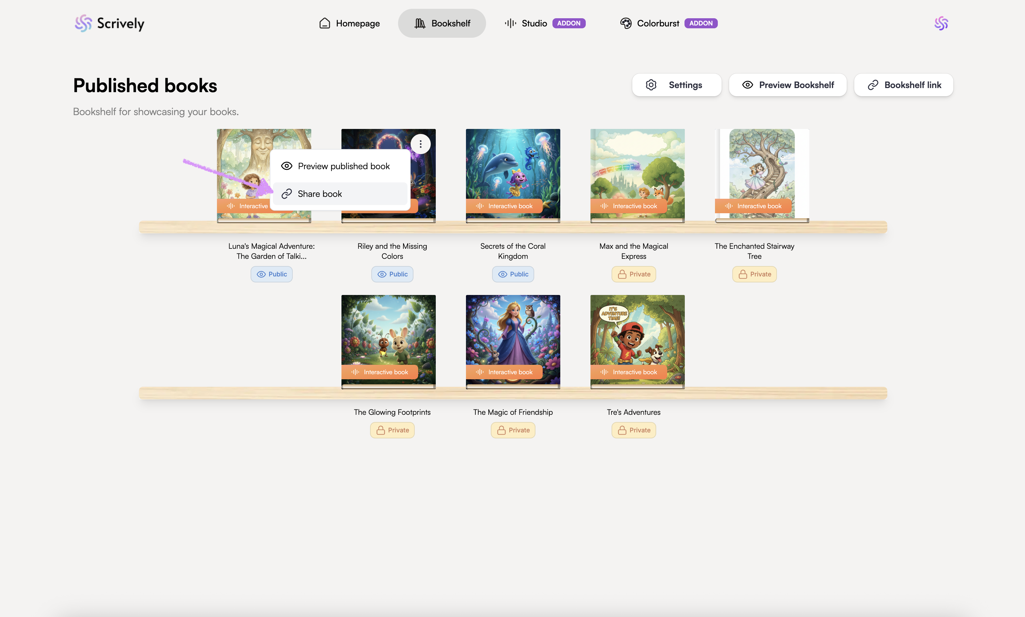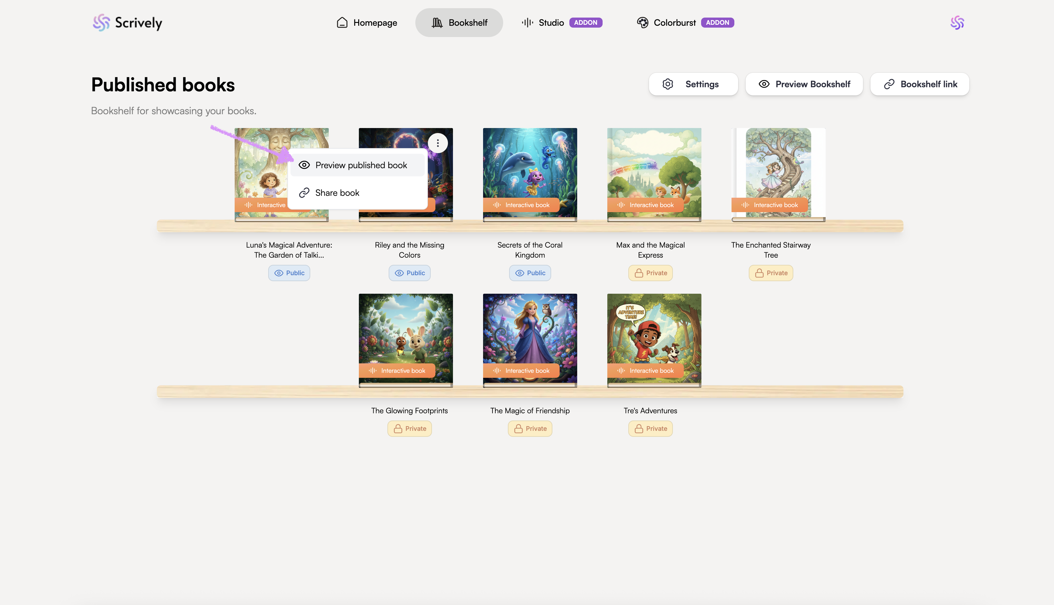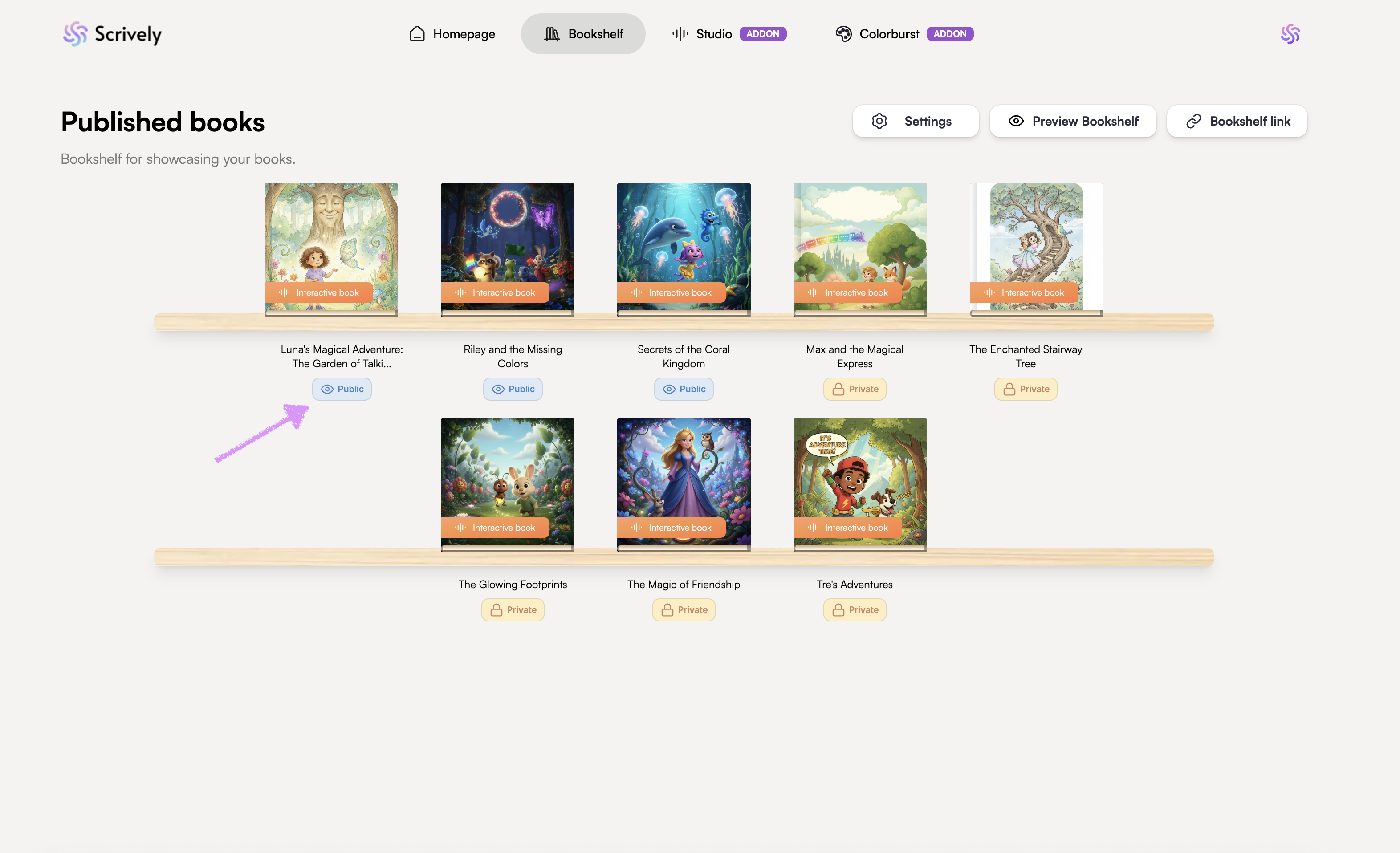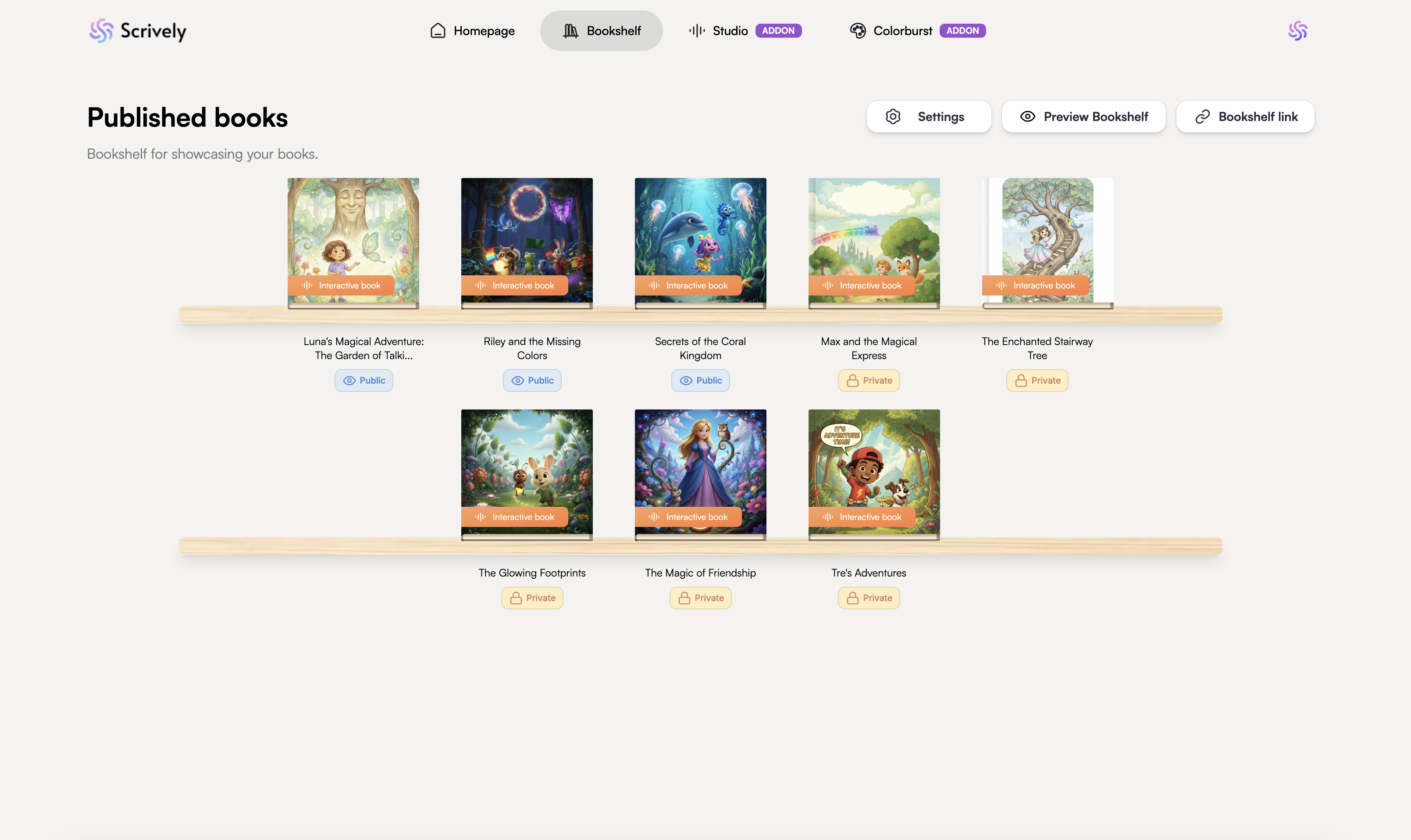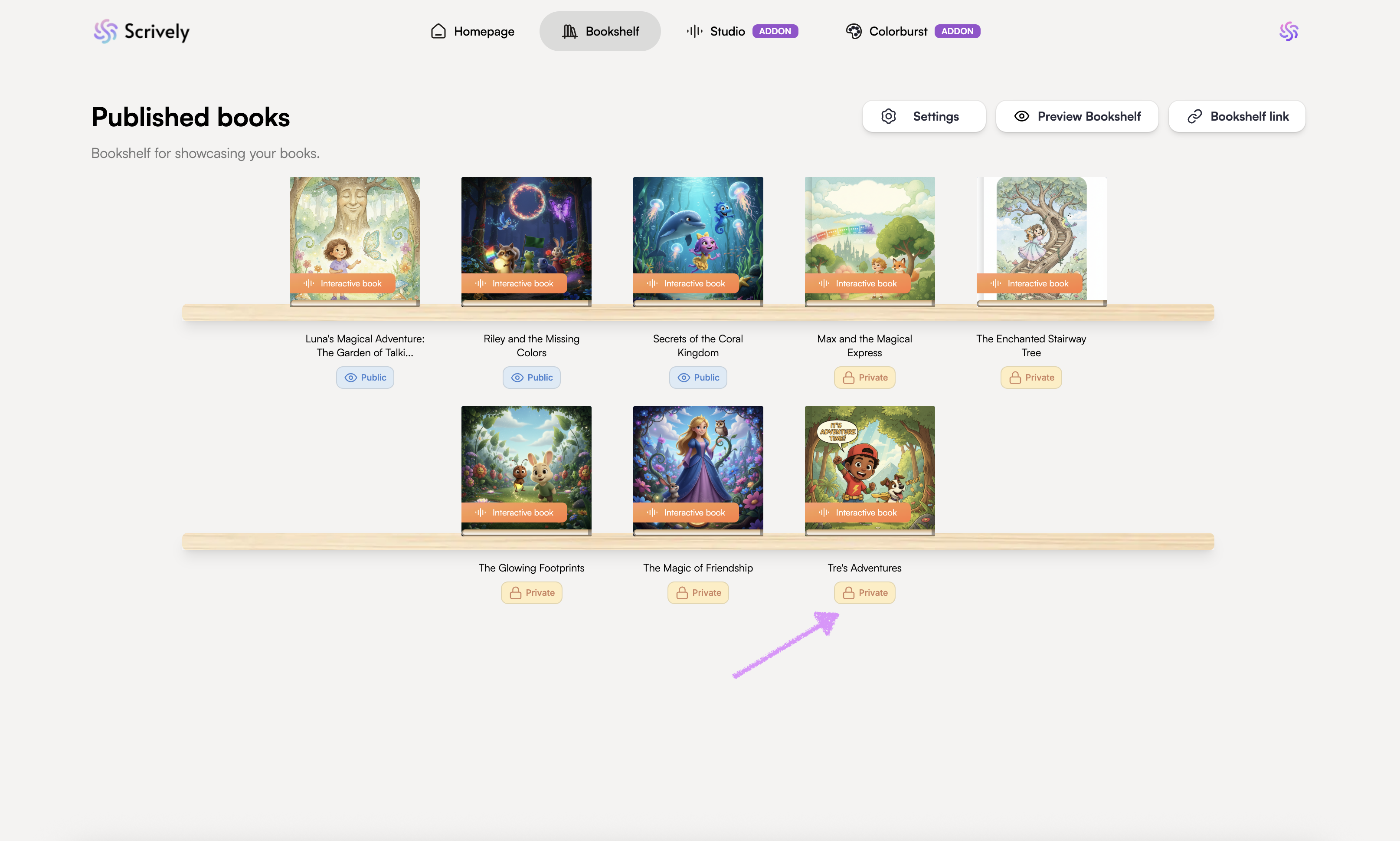 Your "Bookshelf" is the central hub for all your published stories, making it easy to find, read, and share your creations. Once you’ve finished working on your book in the Designer view and publish it (steps outlined in our guide here), it will automatically appear in your bookshelf. By default, the book is set to private until you choose to change it.