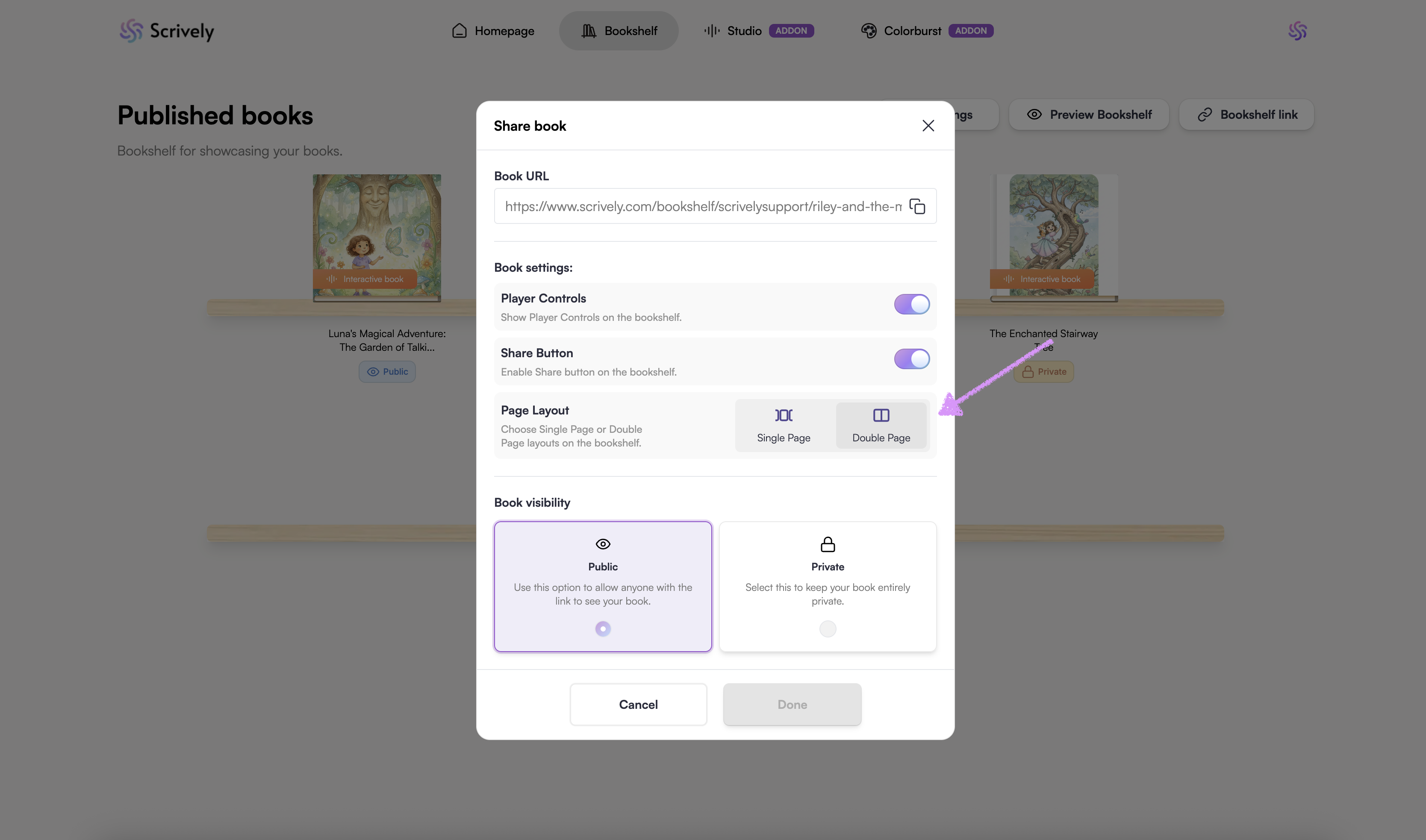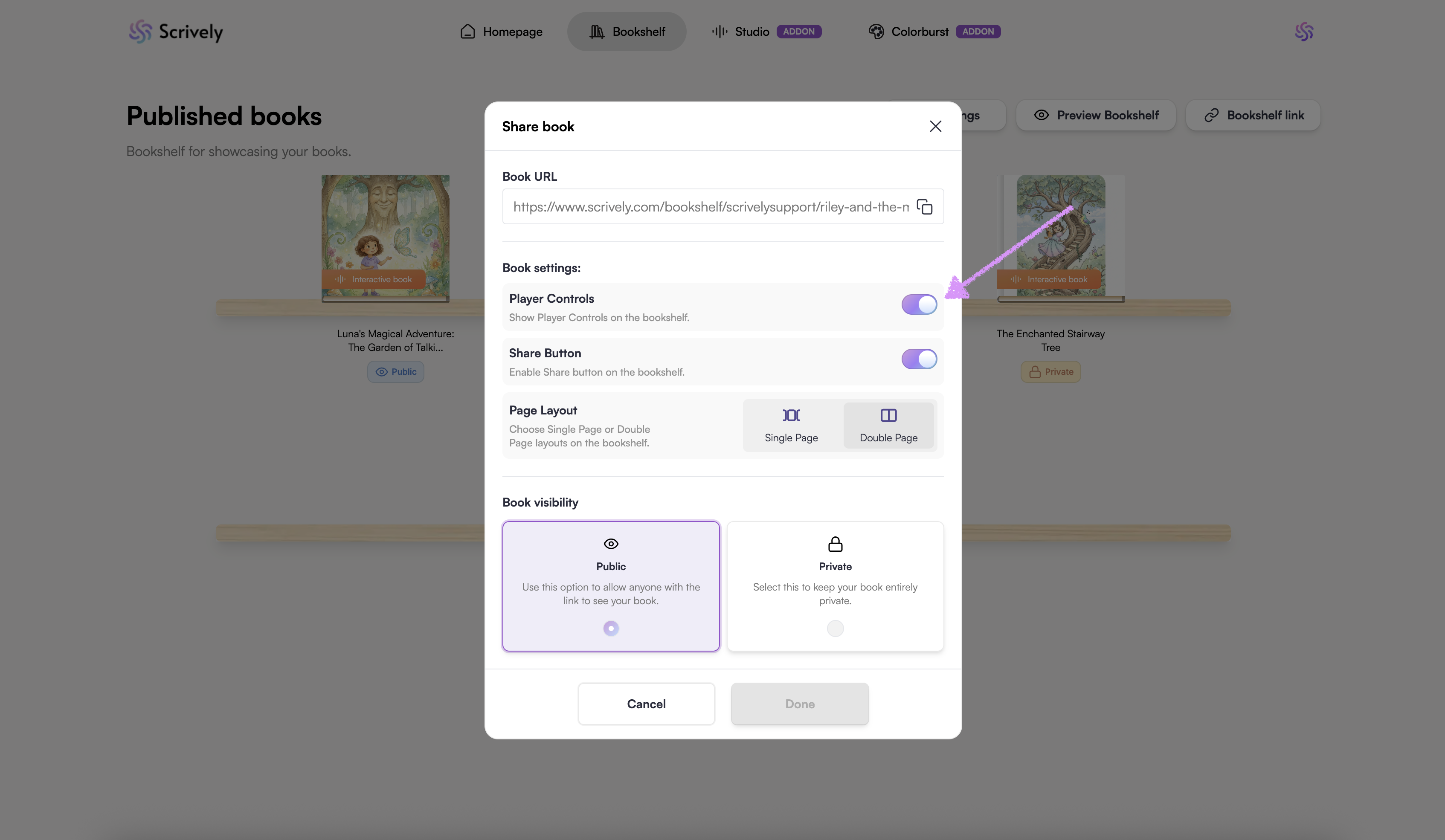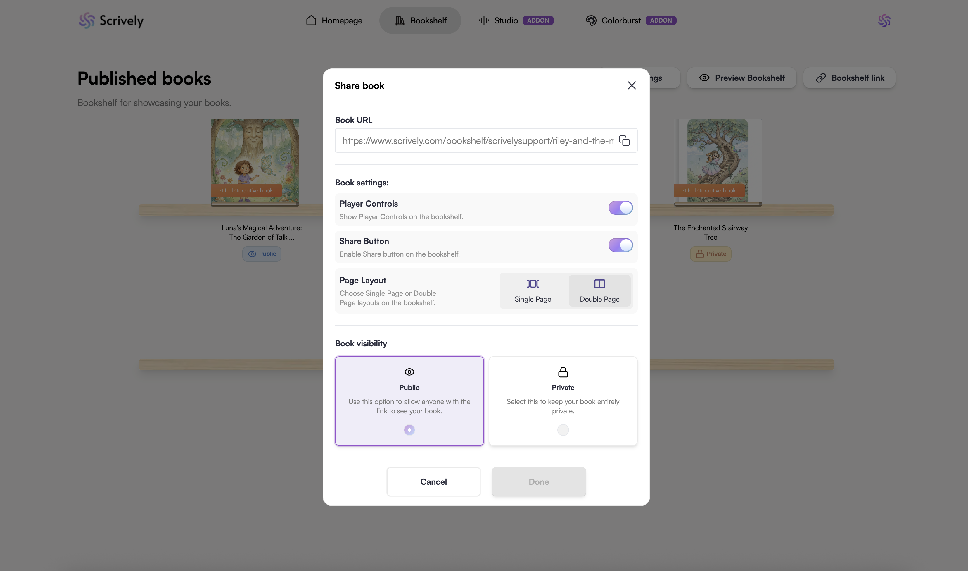 A modal will appear displaying the book’s URL along with settings for player controls, the share button, page layout, and visibility options "Public" or "Private."