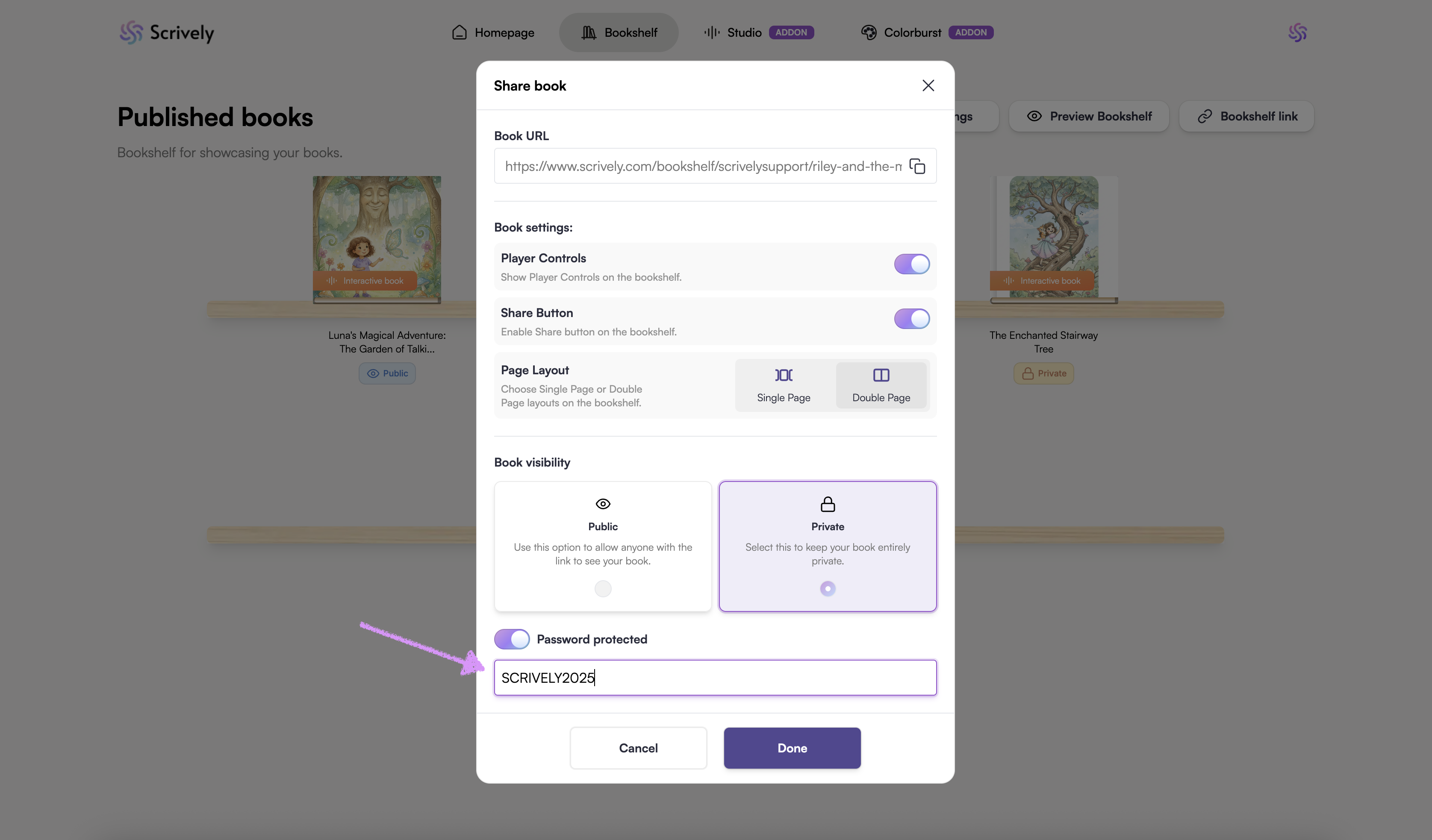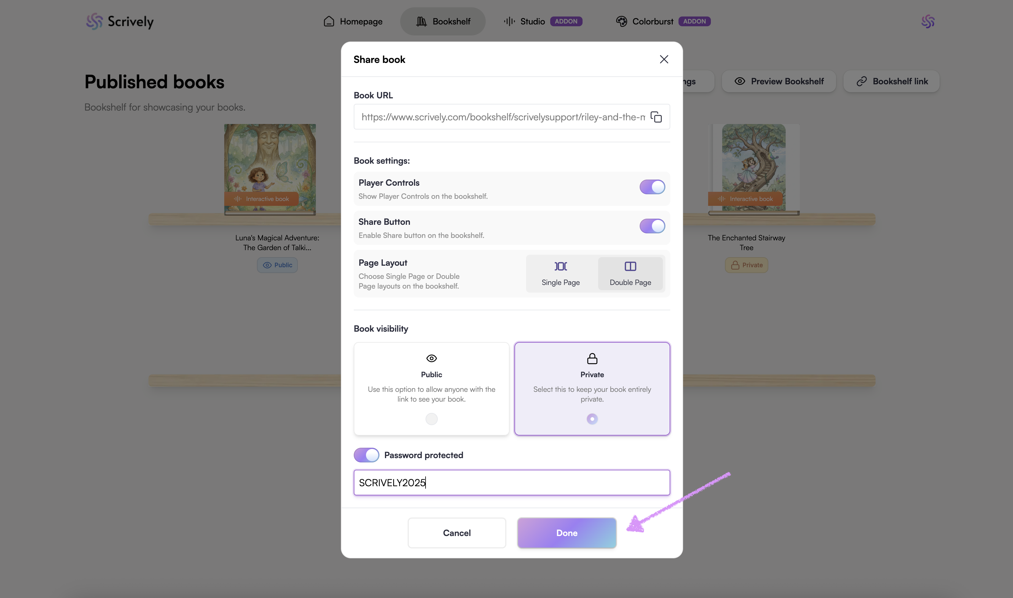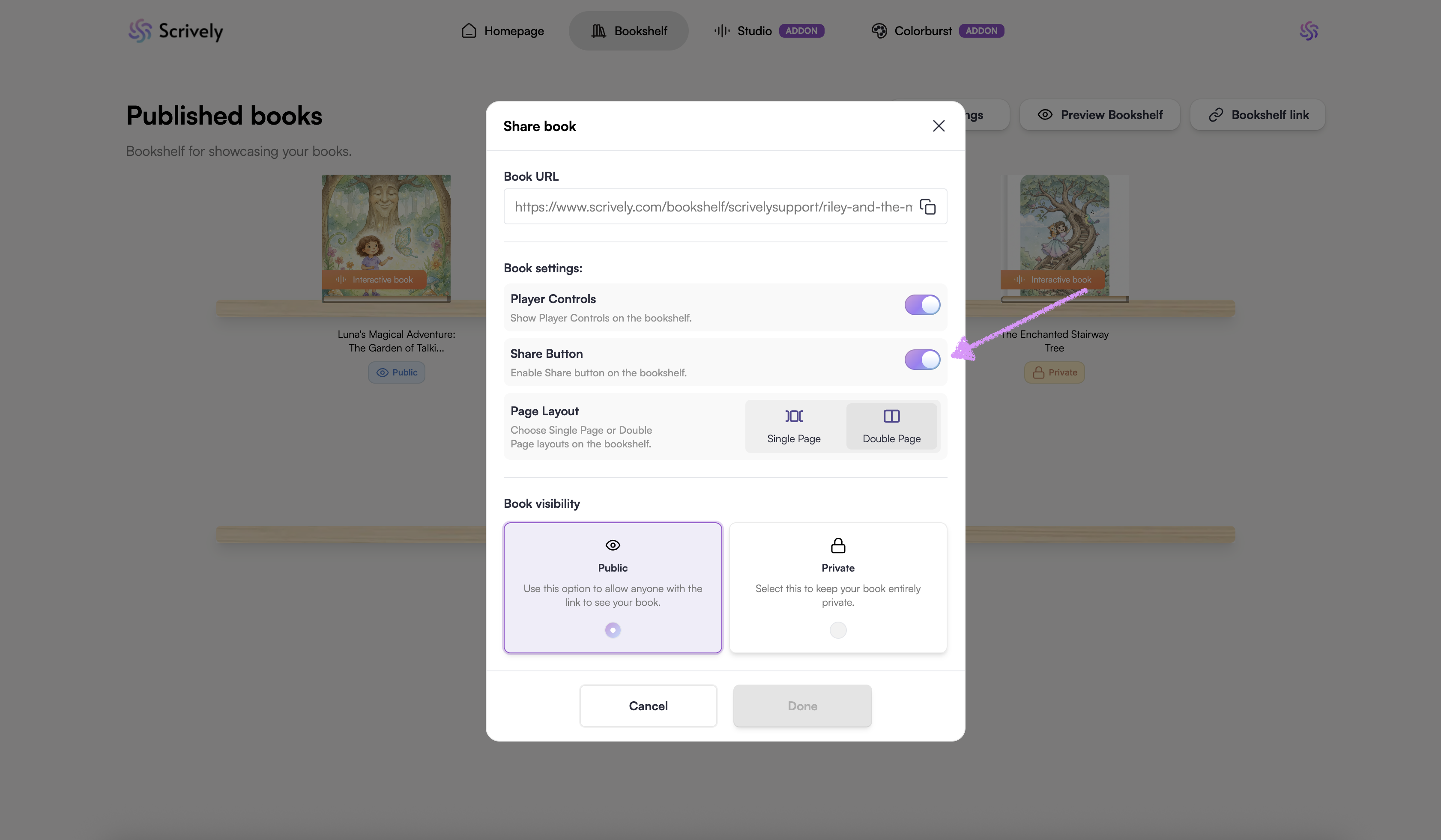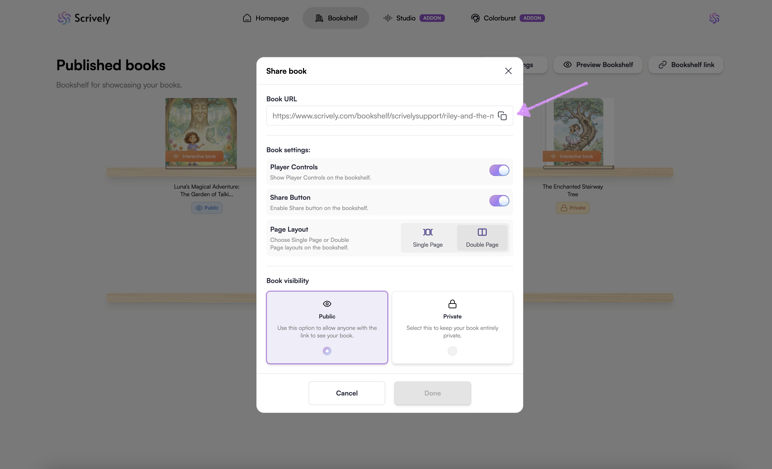 A modal will appear displaying the book’s URL along with settings for player controls, the share button, page layout, and visibility options "Public" or "Private."