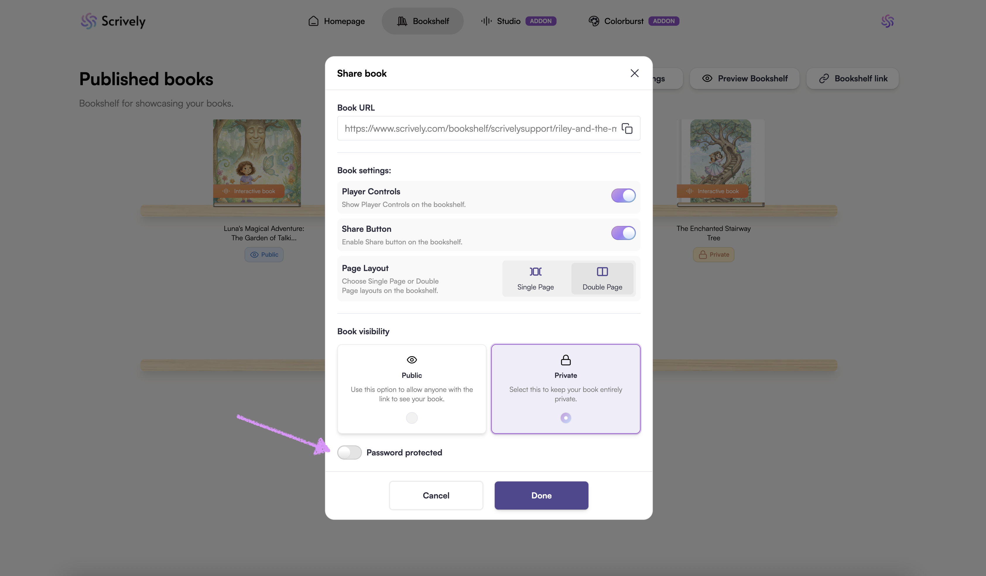 When you set the book visibility to "Private" a "Password protected" toggle will be displayed.