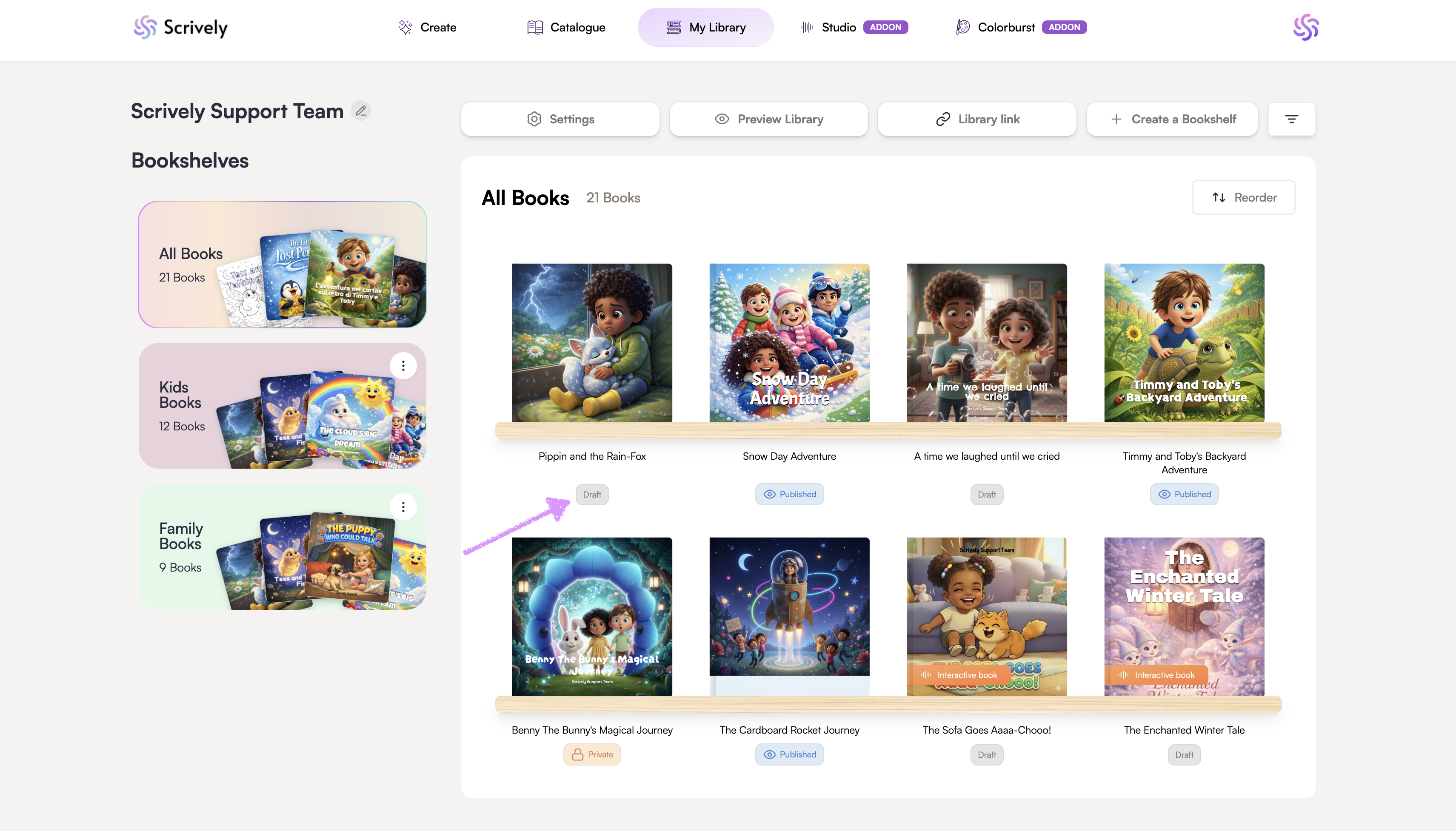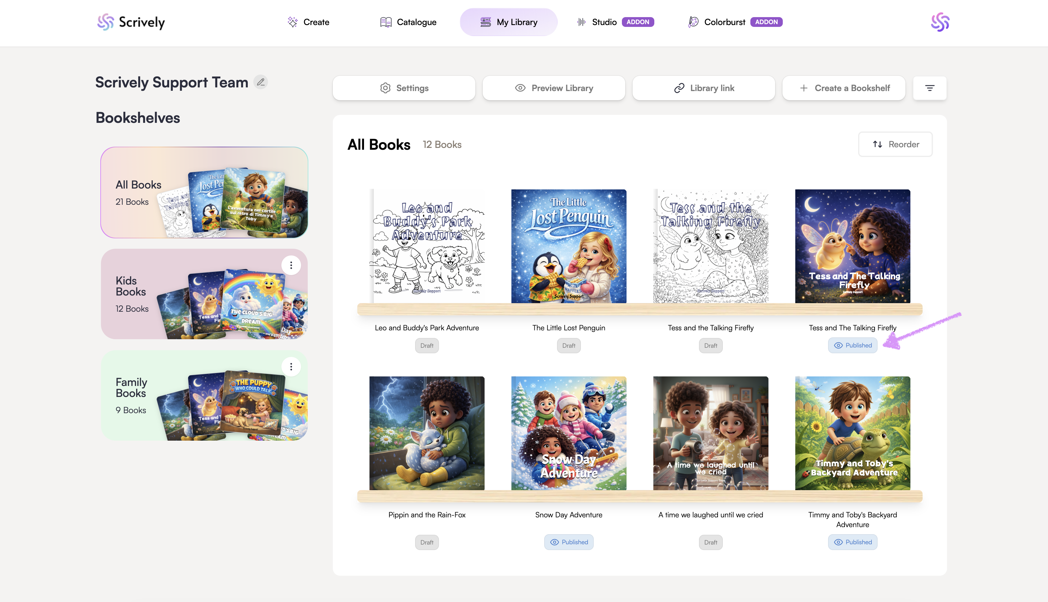Your "Library" is the central hub for all your published stories, making it easy to find, read, and share your creations. Once you’ve finished working on your book in the Designer (book layout view) and publish it (steps outlined in our guide here), it will automatically appear in your library. By default, the book is set to private until you choose to change it.