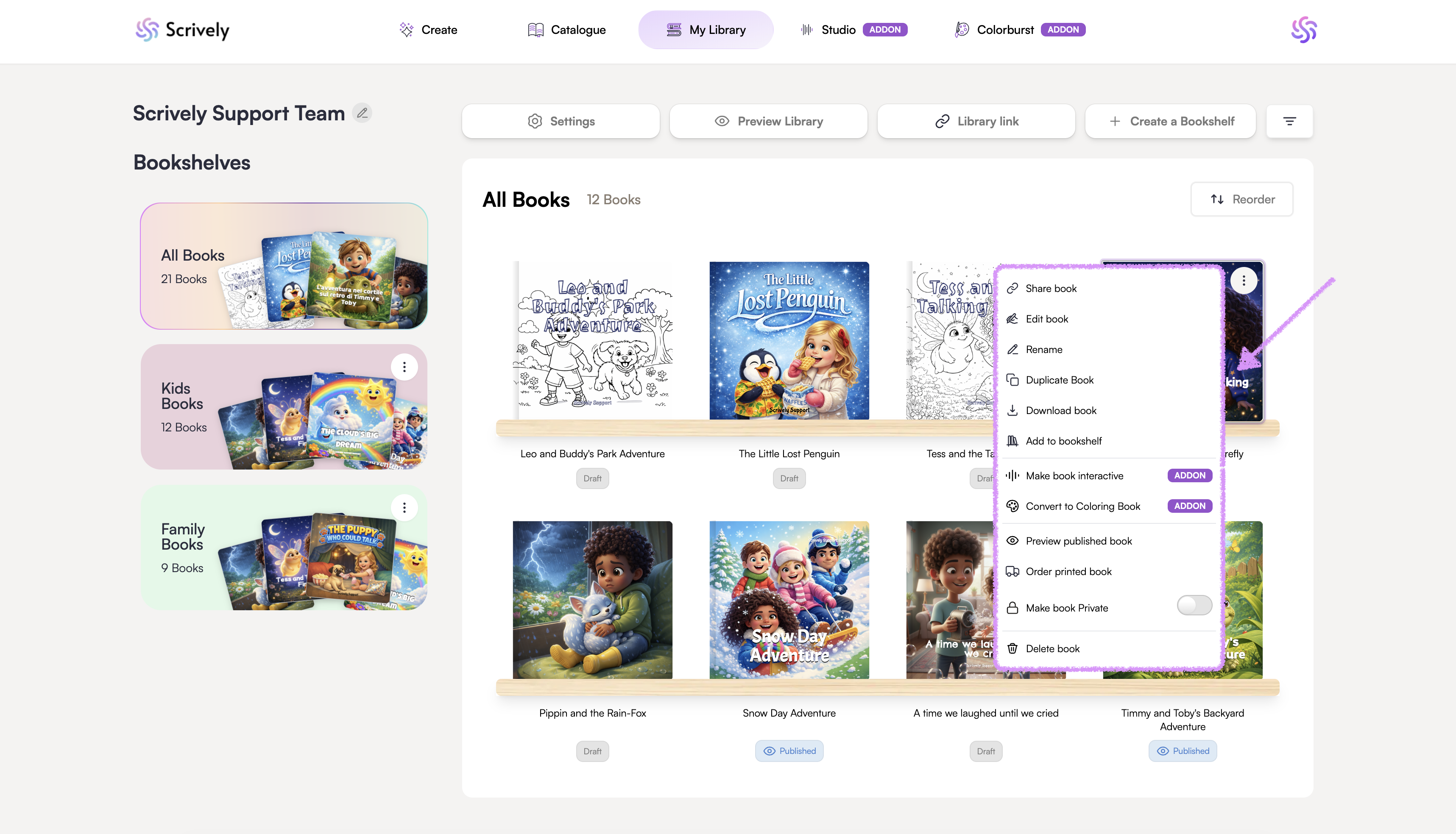 The book's menu option lets you share, edit, rename or duplicate your book, download as a PDF or EPUB, download the book's cover pages and audio, add to bookshelf, open in Studio (add-on), convert to a coloring book in ColorBurst (add-on), preview the published book on your shareable bookshelf, order printed copies, set your book to private, or delete it.