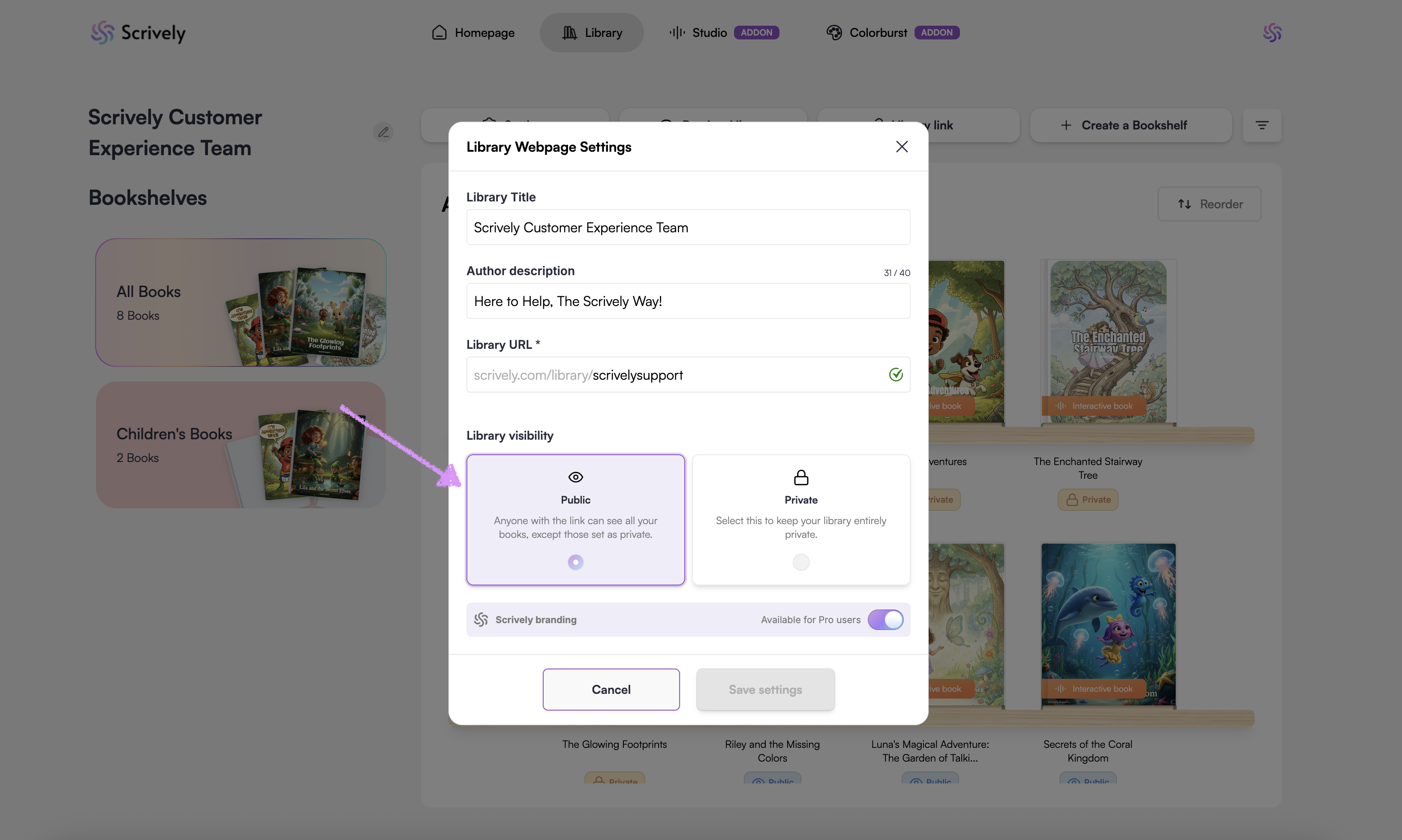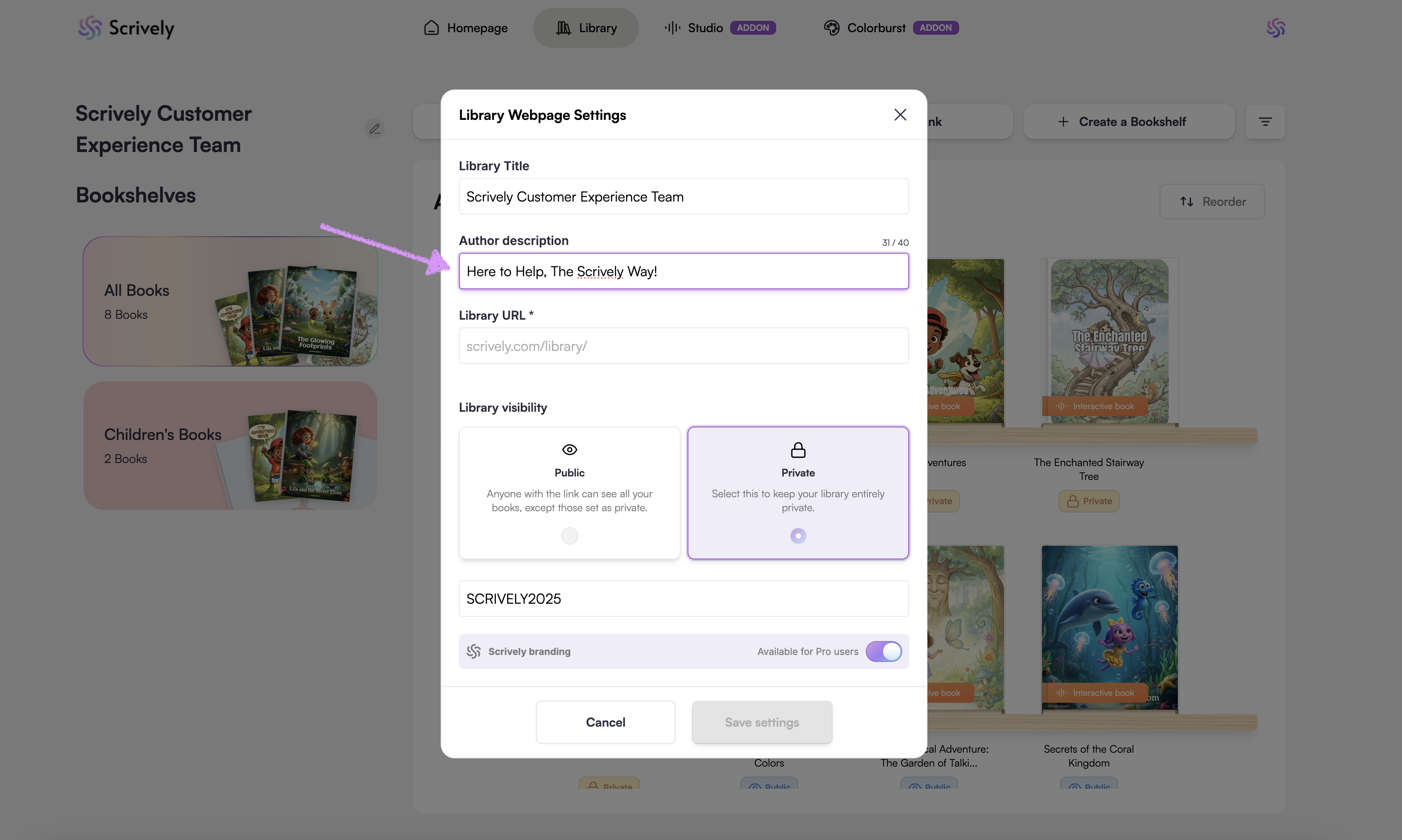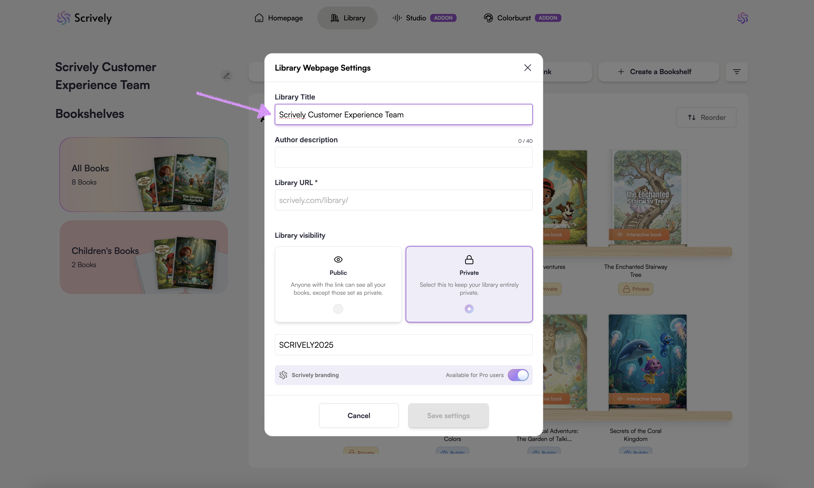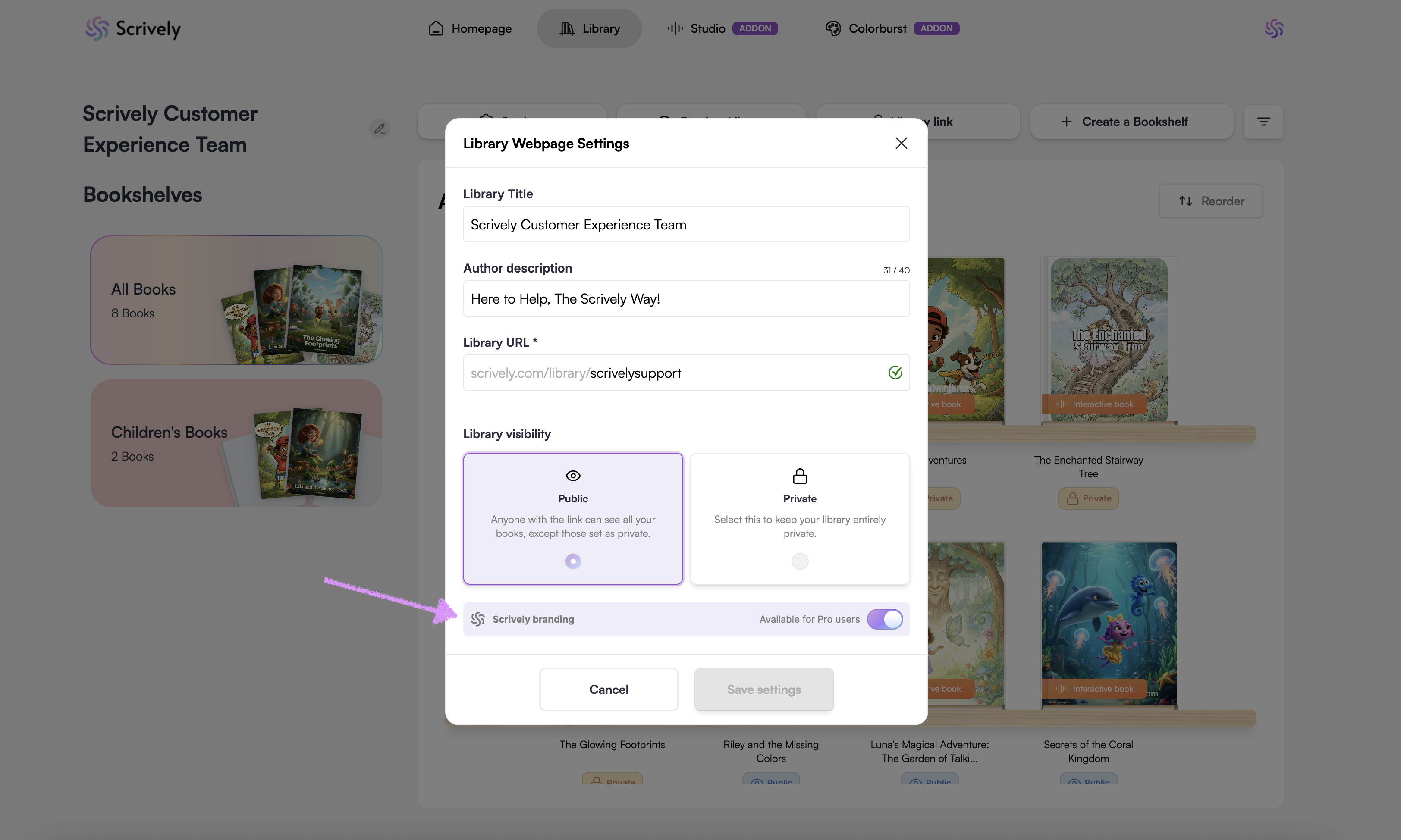 Pro users have the option to toggle the Scrively branding on/off for their library.