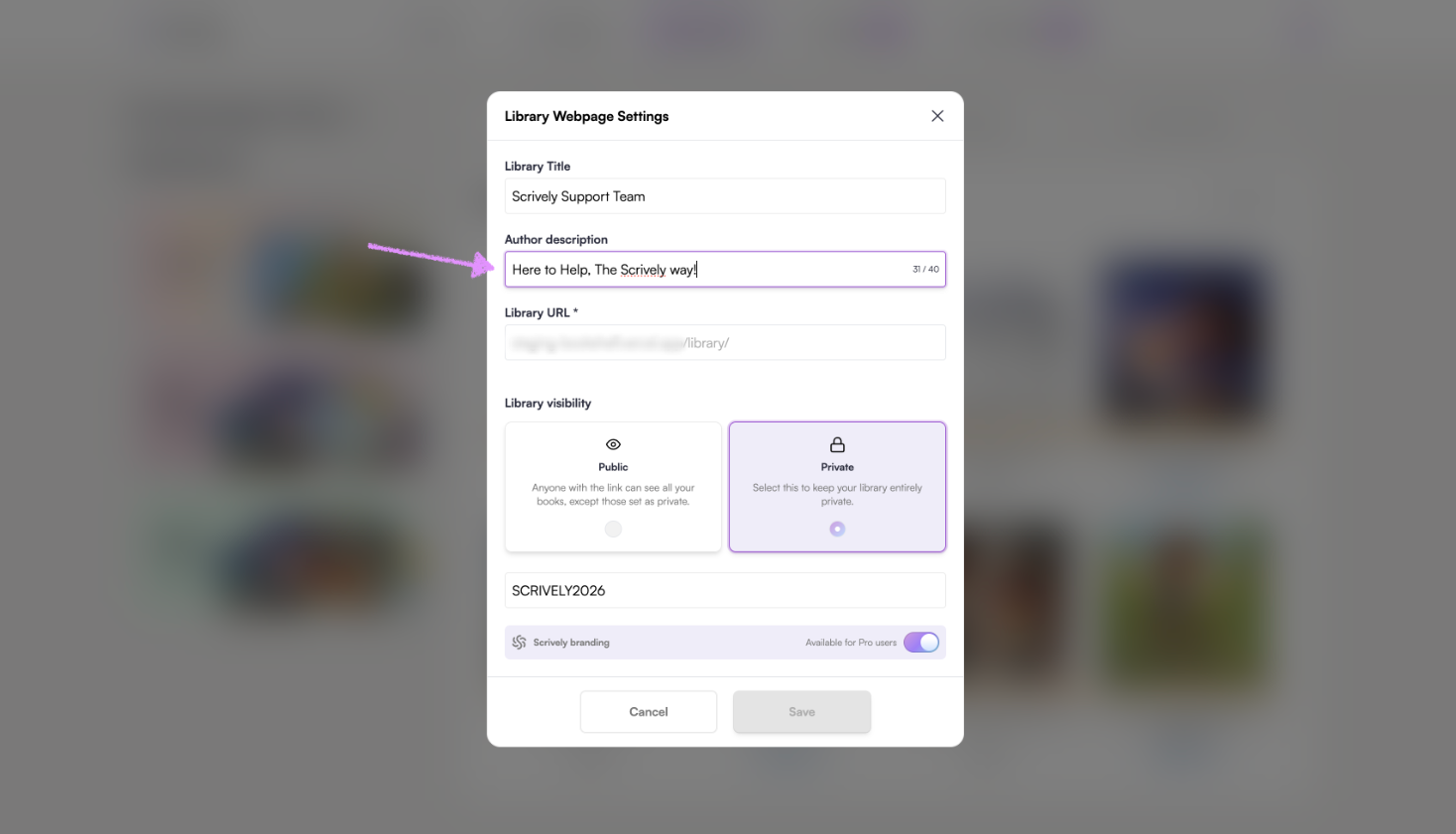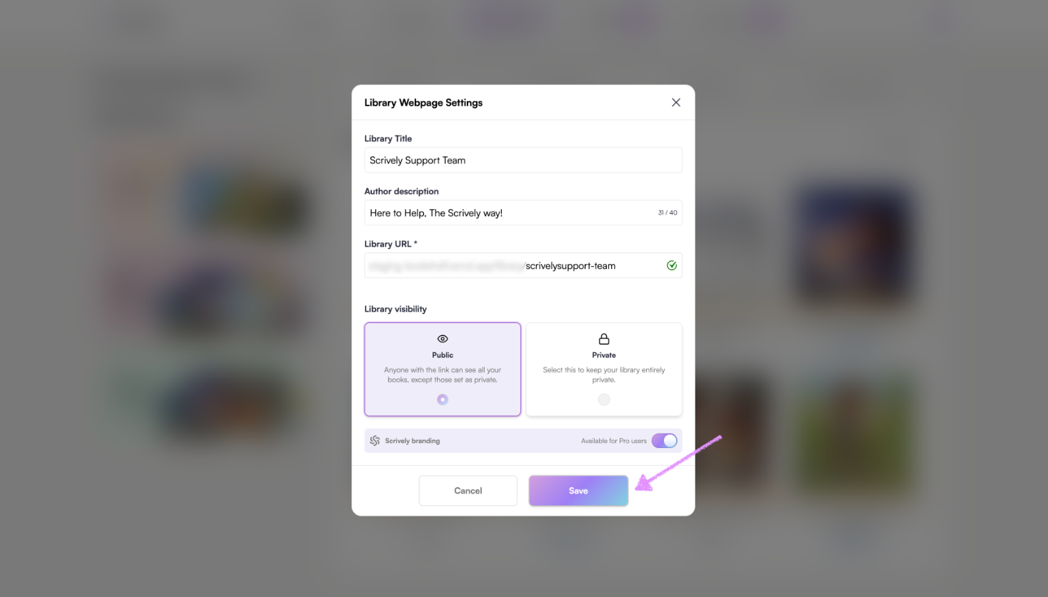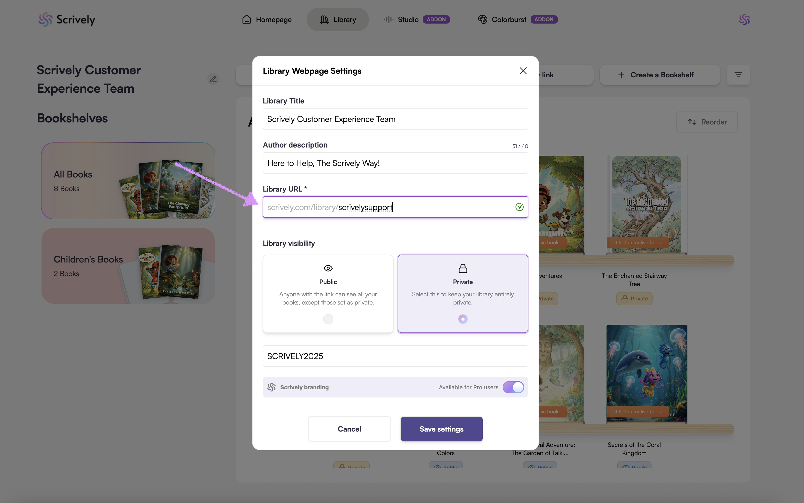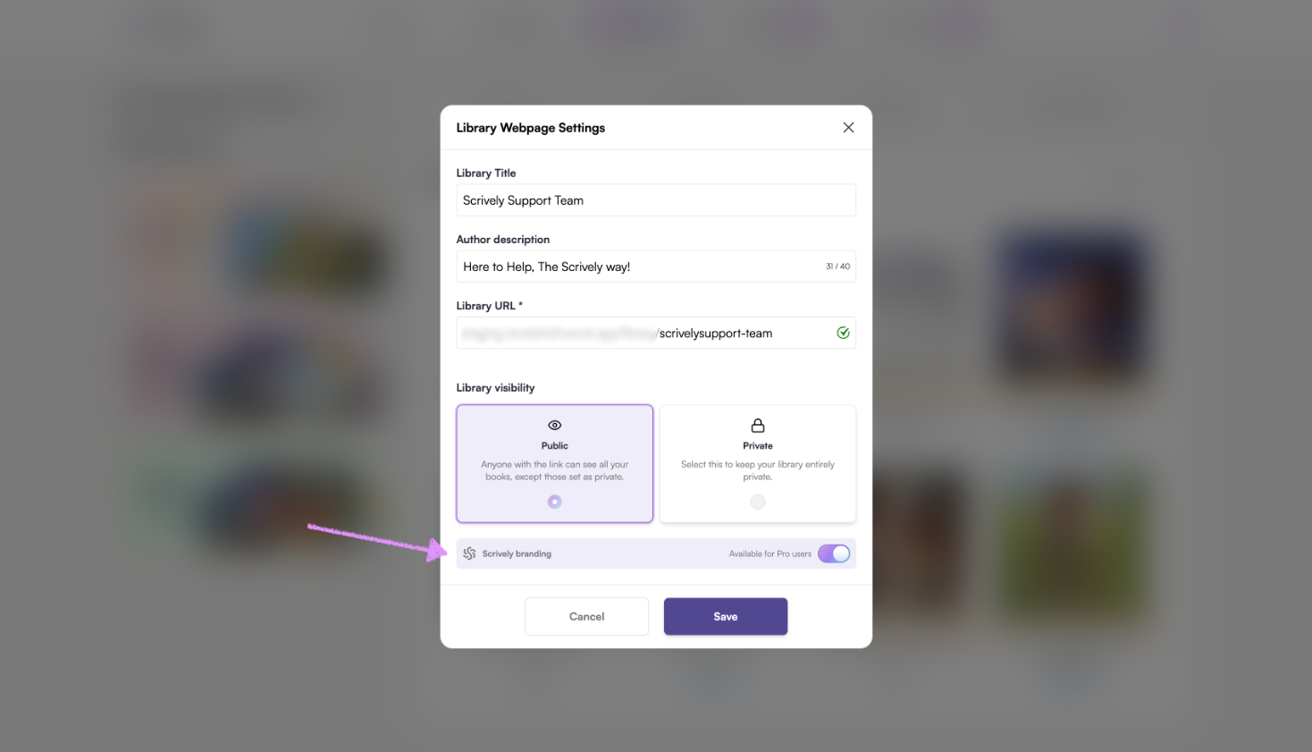 Pro users have the option to toggle the Scrively branding on/off for their library.