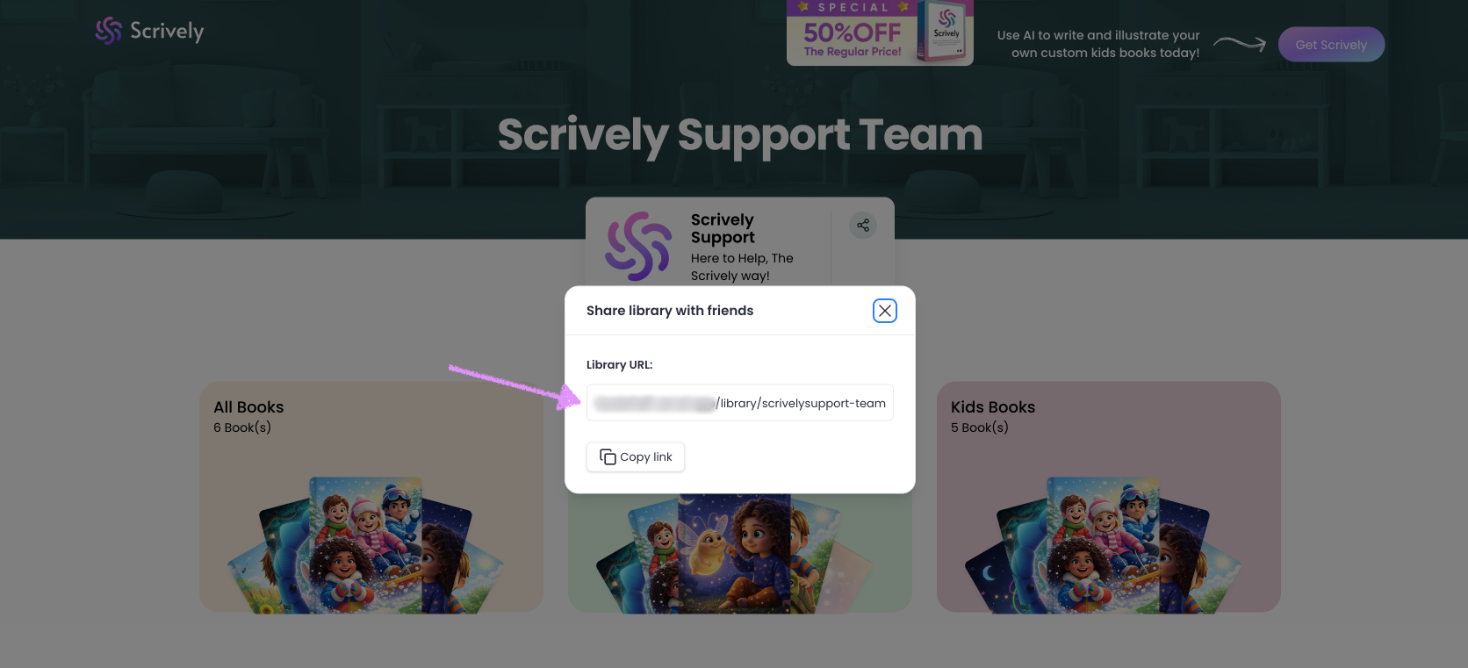 Clicking the share option opens a modal containing a link to your library that you can easily copy and share with others.