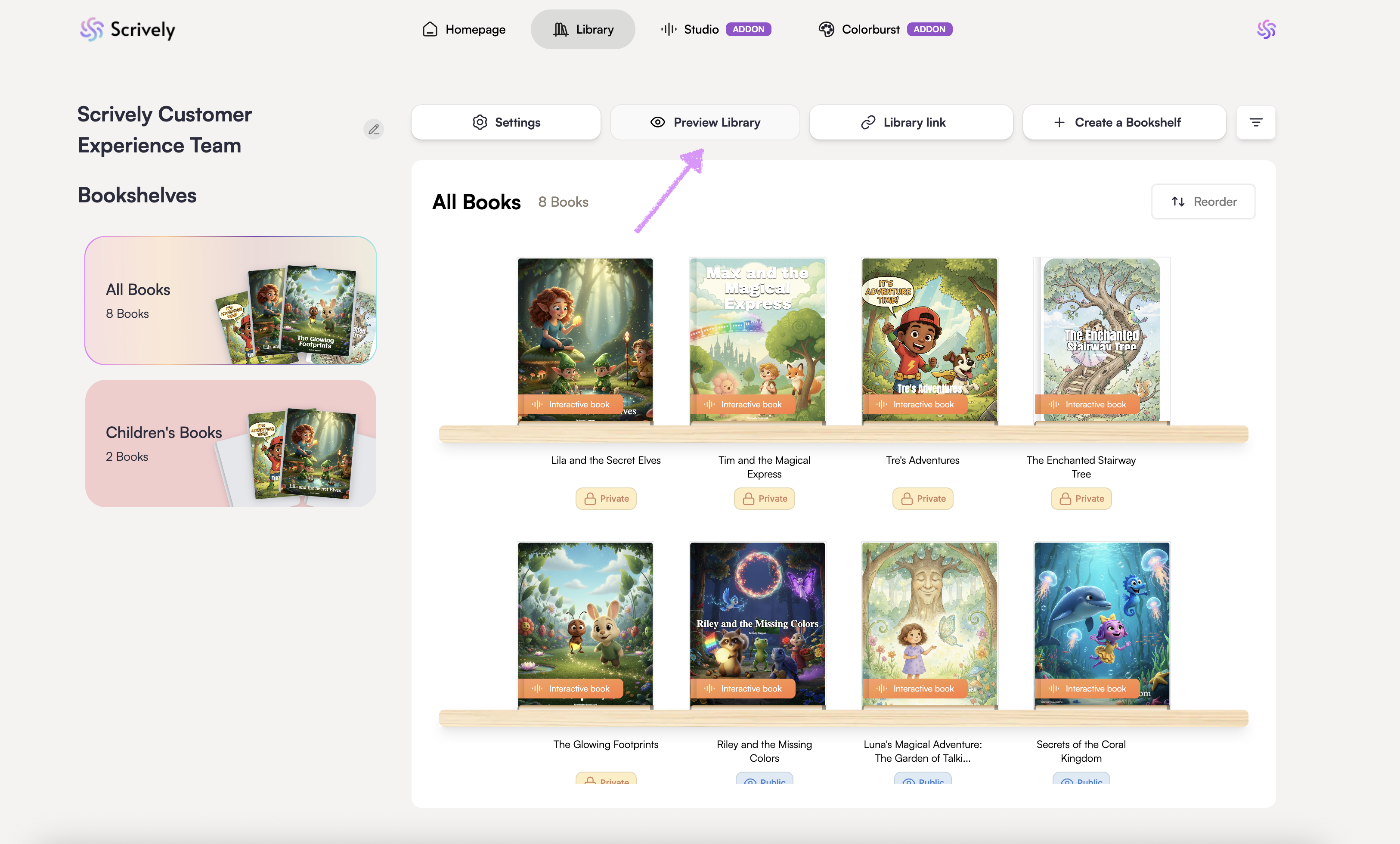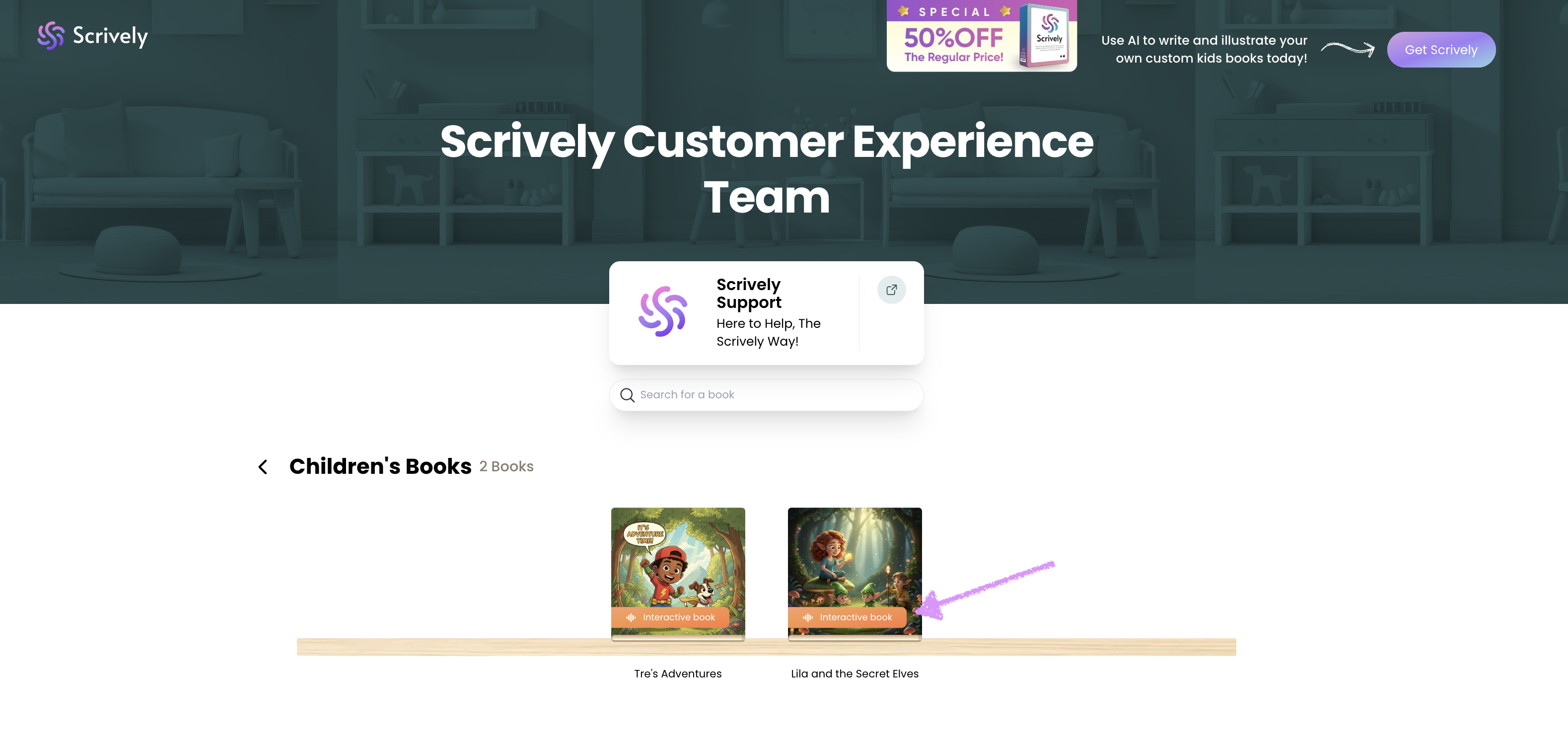 If a book includes voiceover, background music, or interactive elements created in Scrively Studio, it will display the label “Interactive Book.”