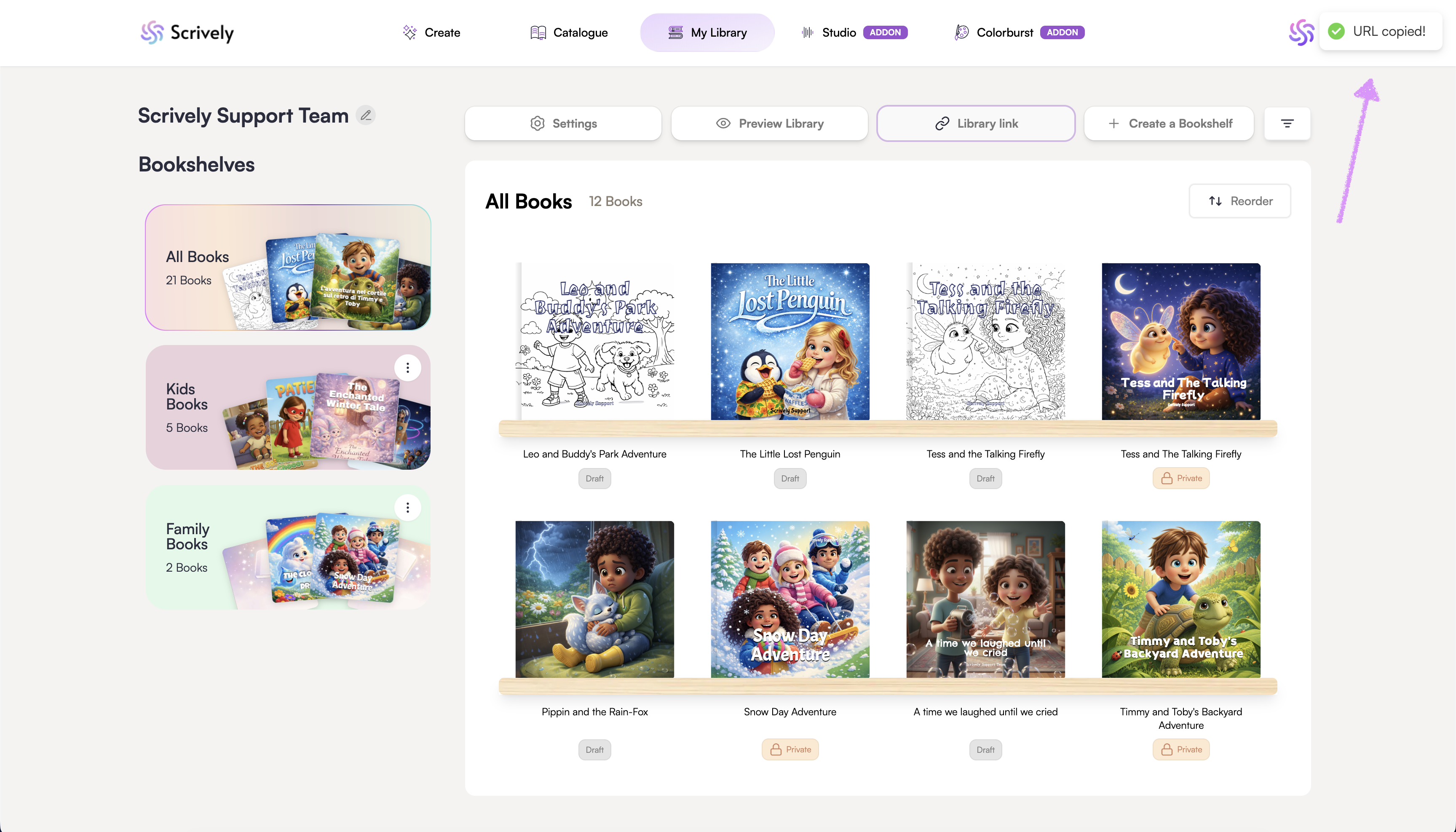 Sharing your library is simple with a direct link that lets others explore your published storybooks instantly. Quickly copy the link and send it wherever you want to showcase your stories.