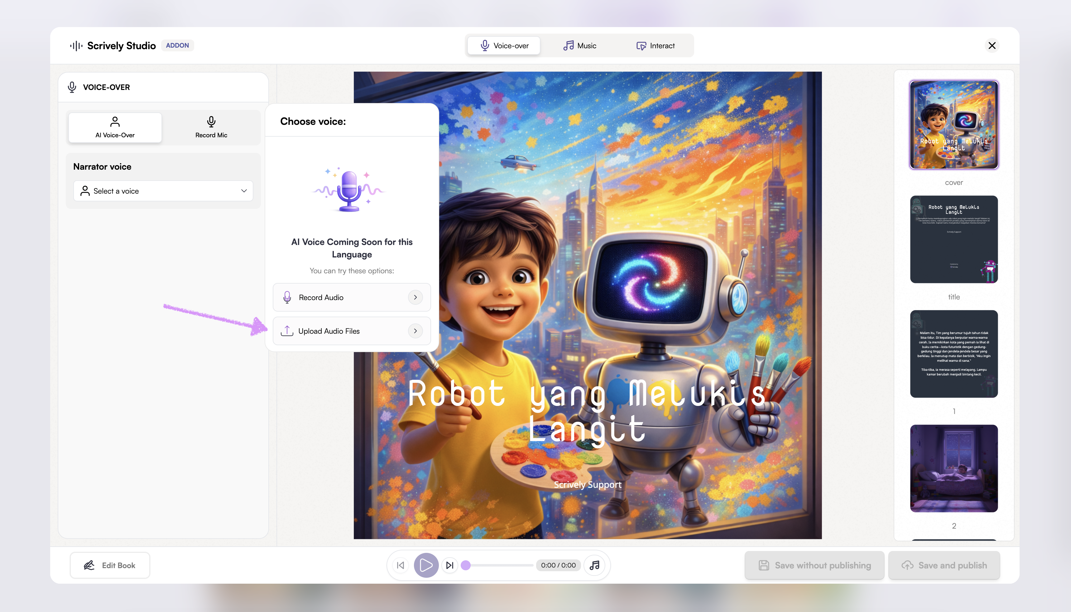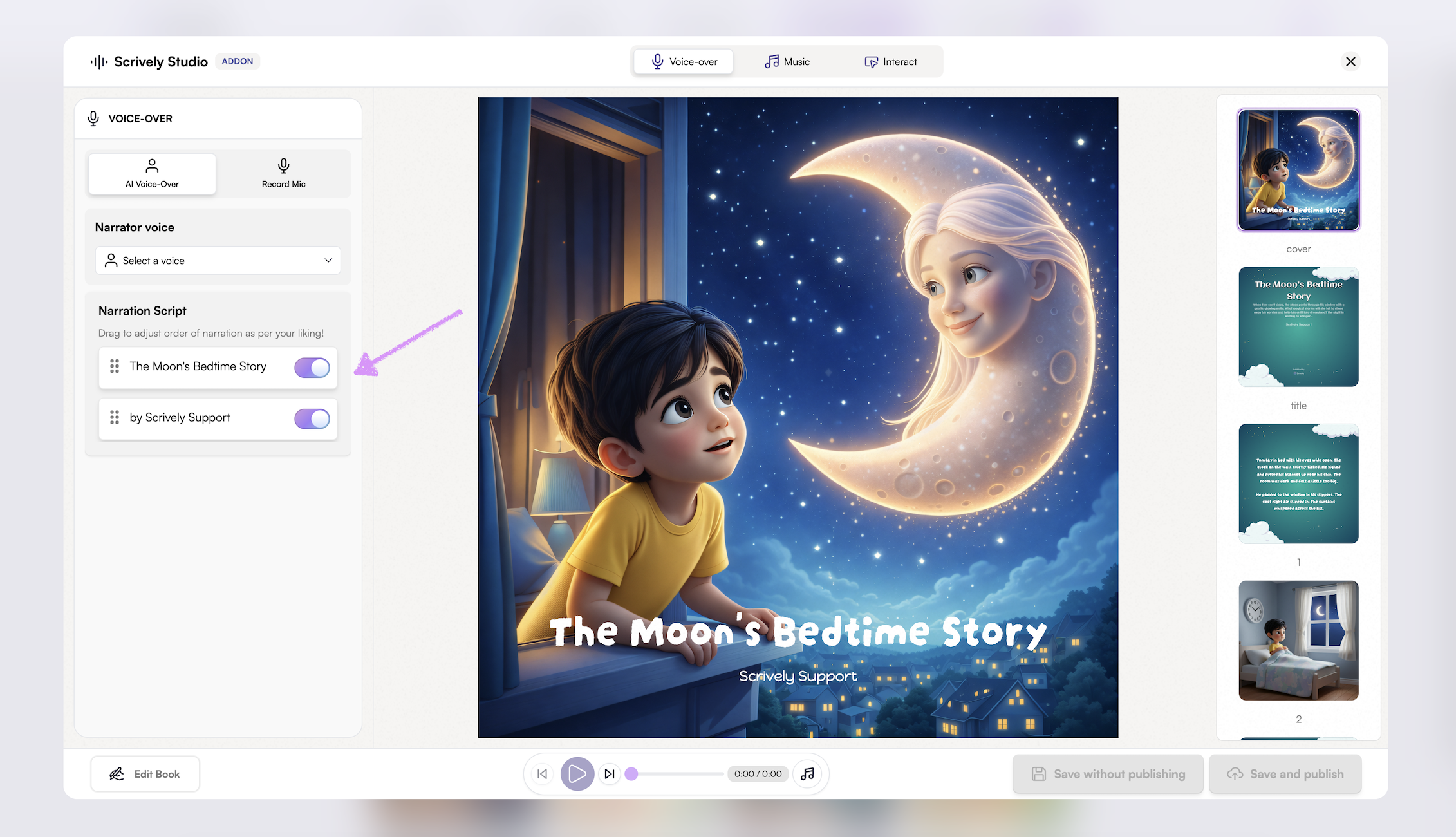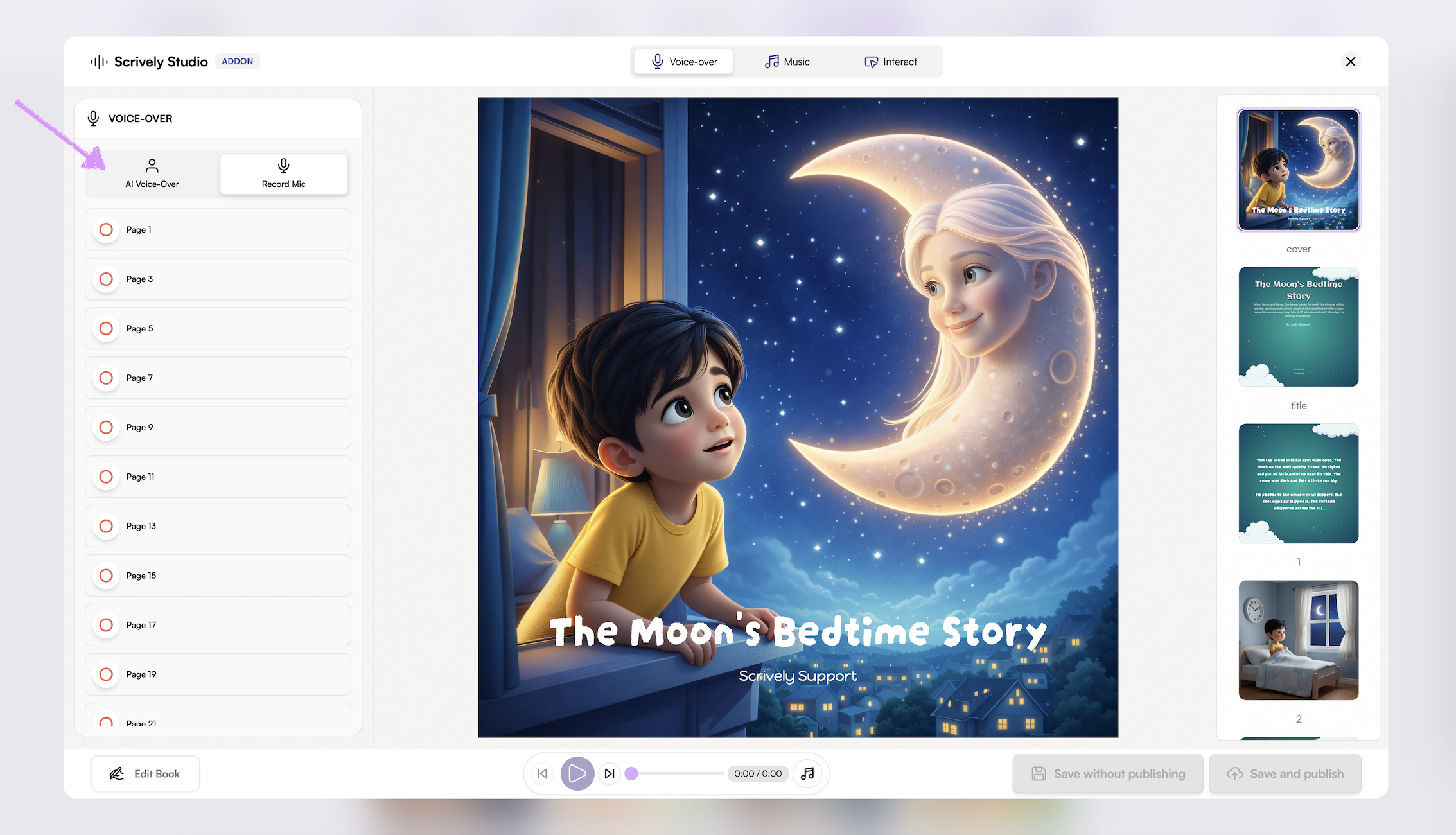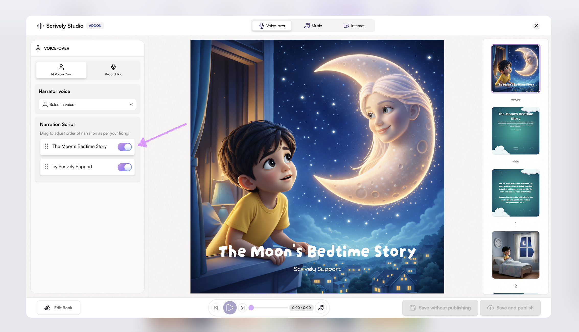 Bring your stories to life by adding voiceovers to your books. Whether using your own narration or AI-generated voices, voiceovers make reading more interactive and captivating.