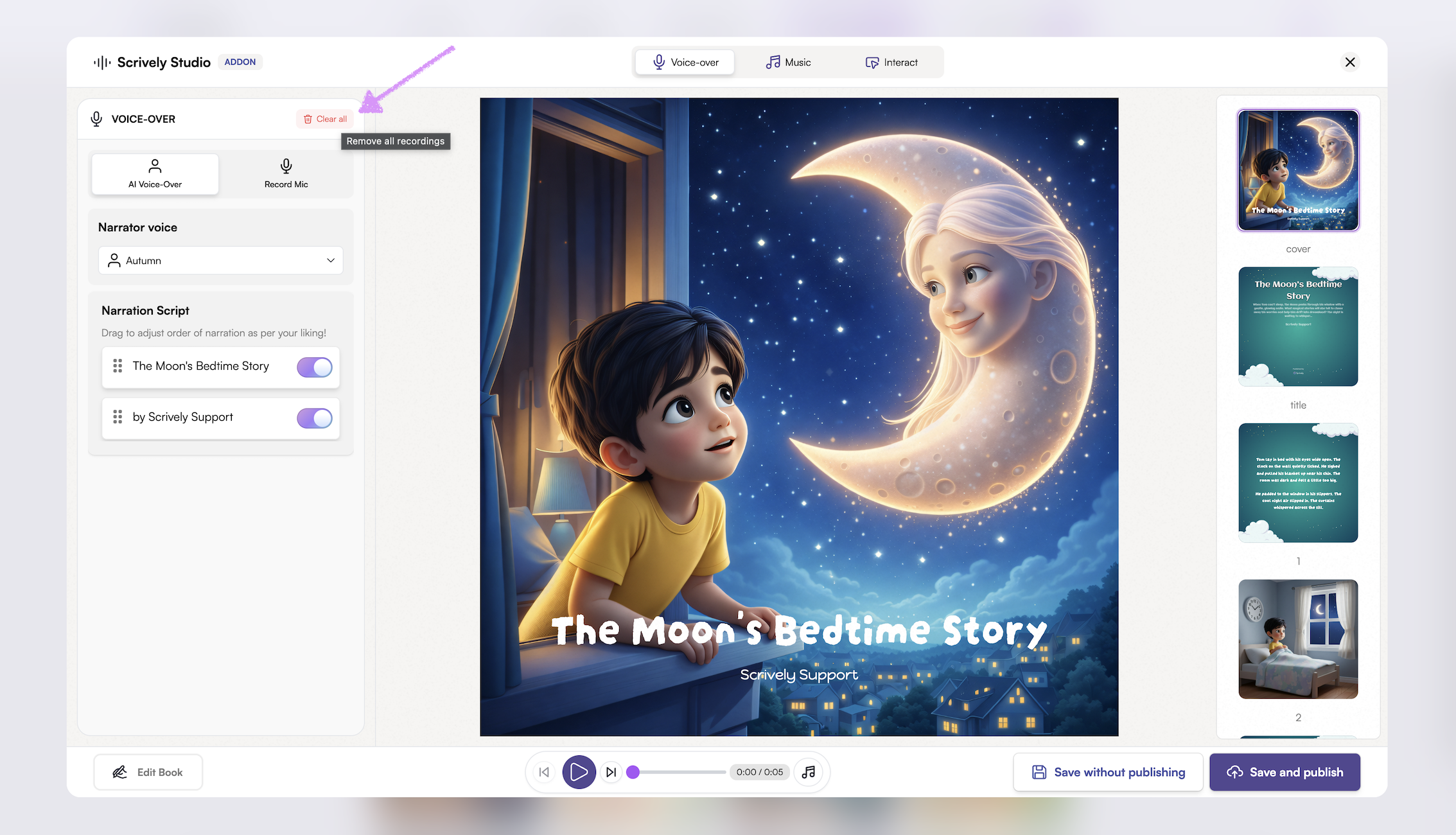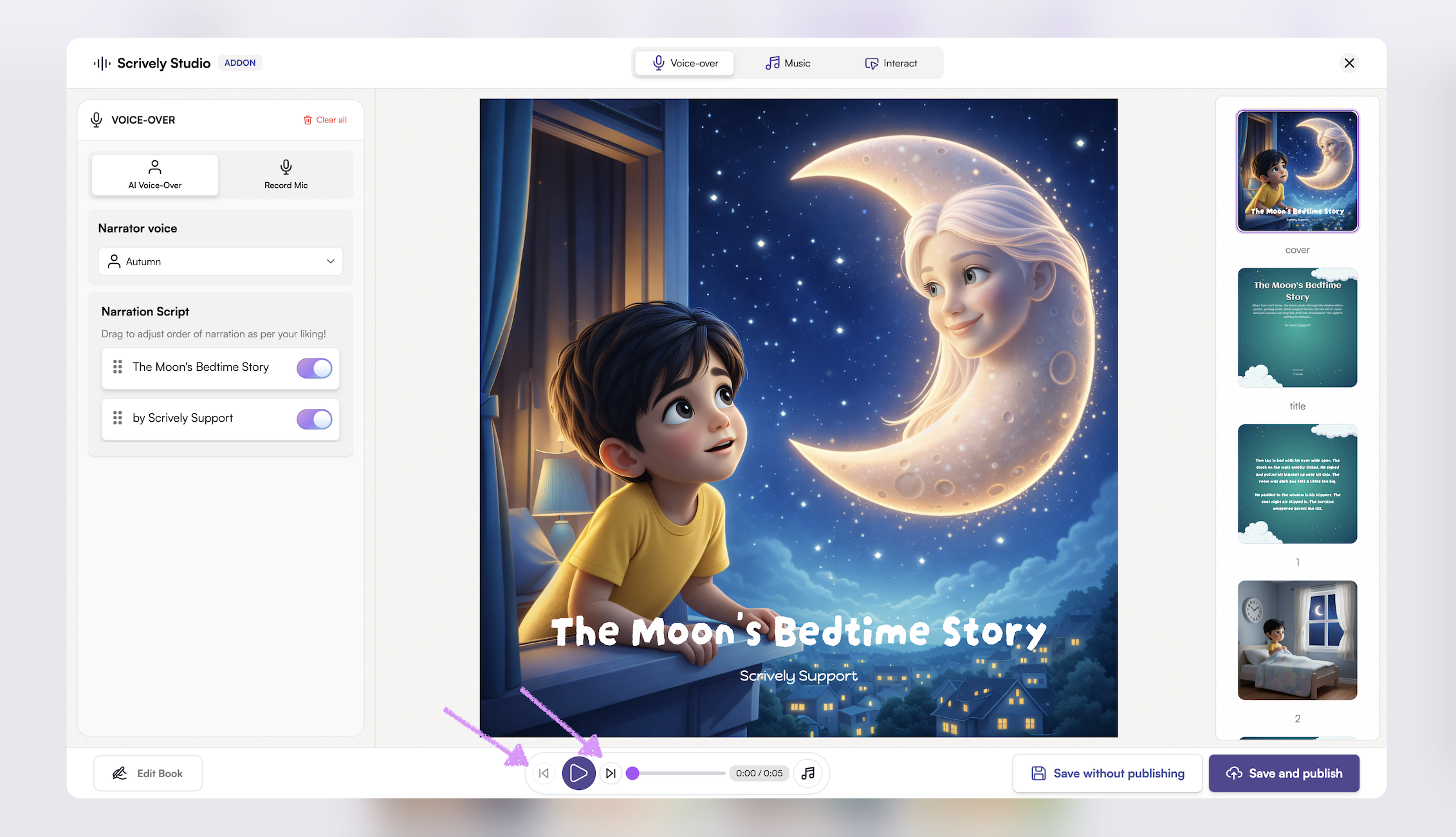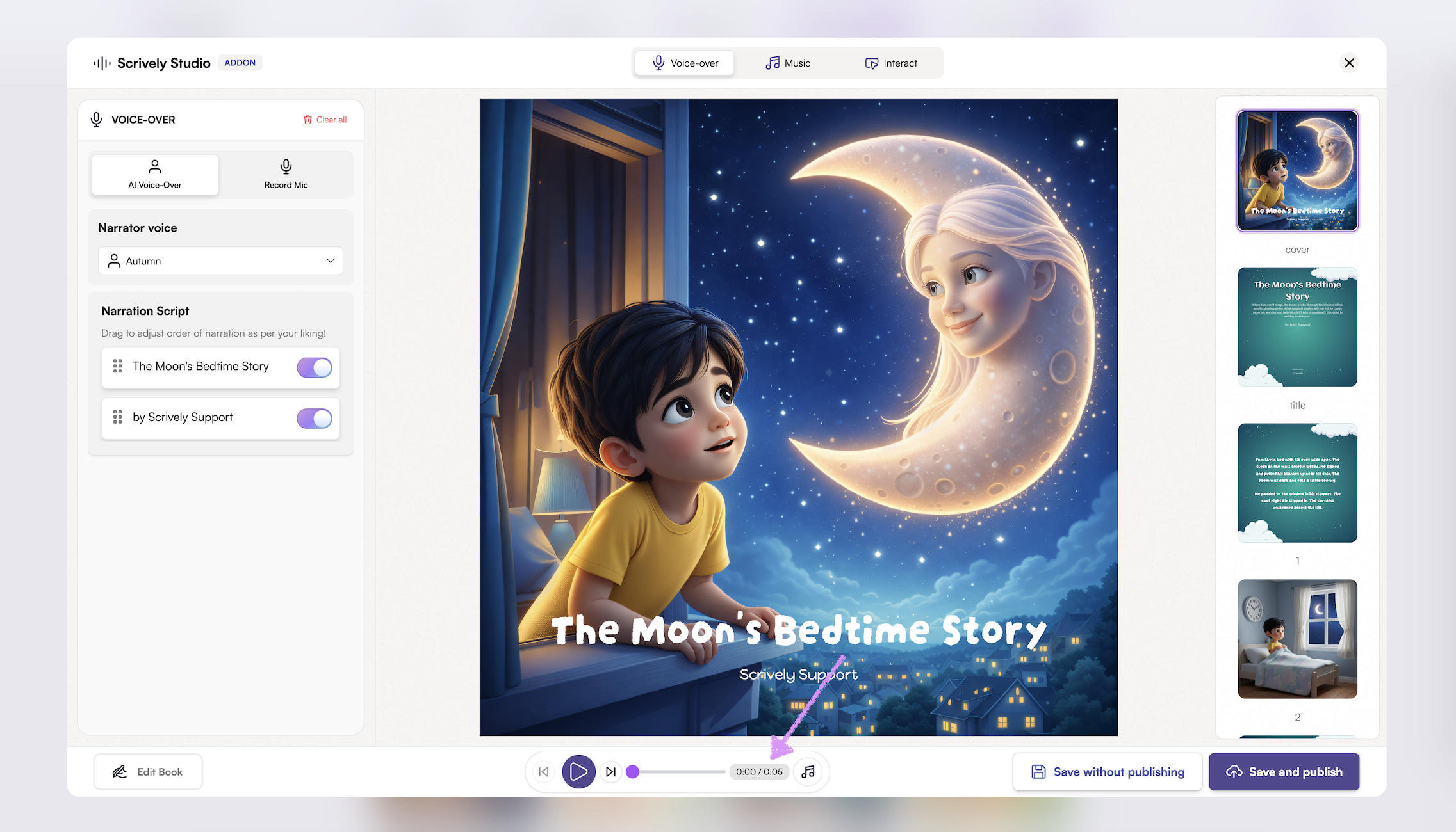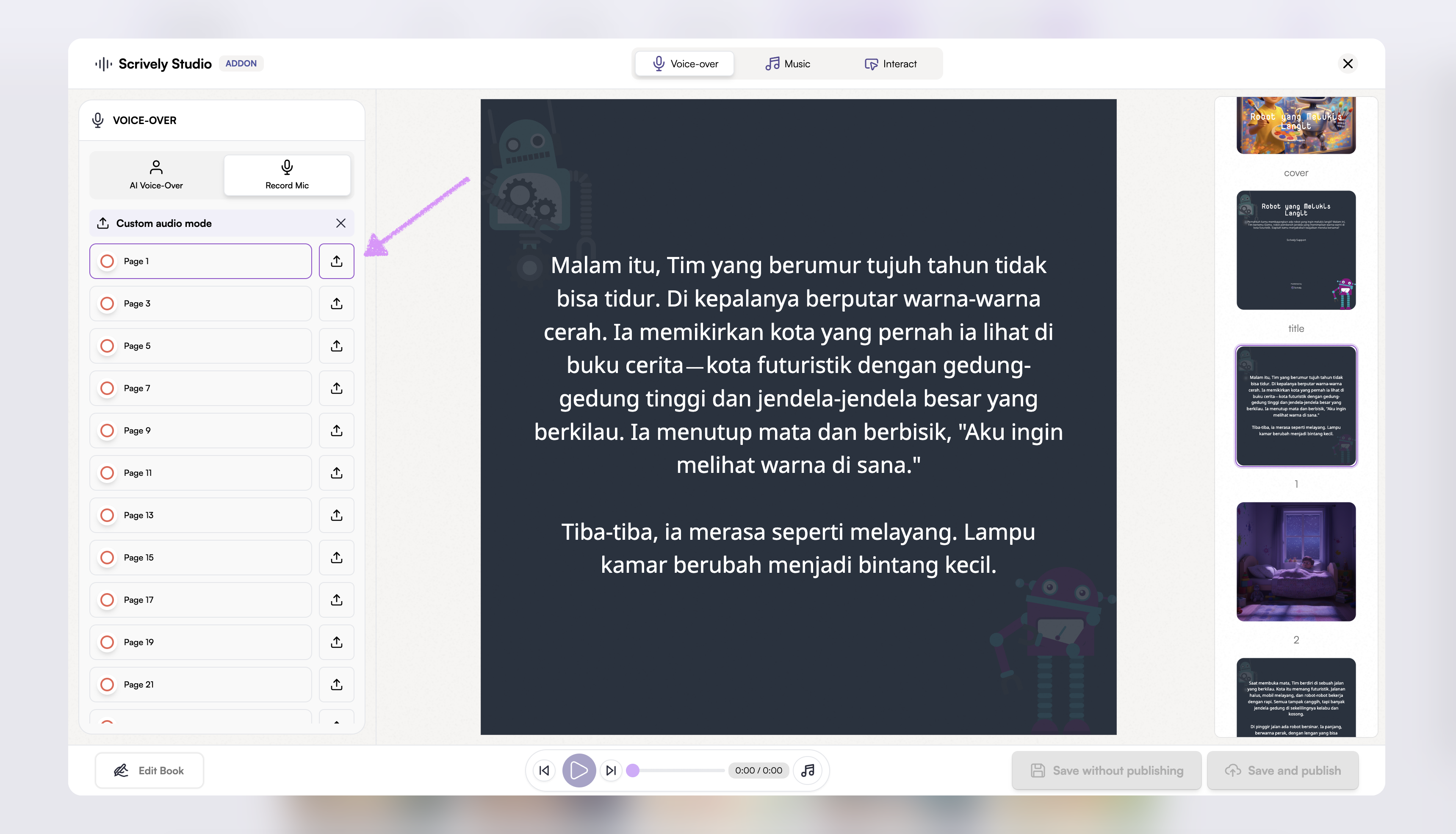 Bring your stories to life by adding voiceovers to your books. Whether using your own narration or AI-generated voices, voiceovers make reading more interactive and captivating.