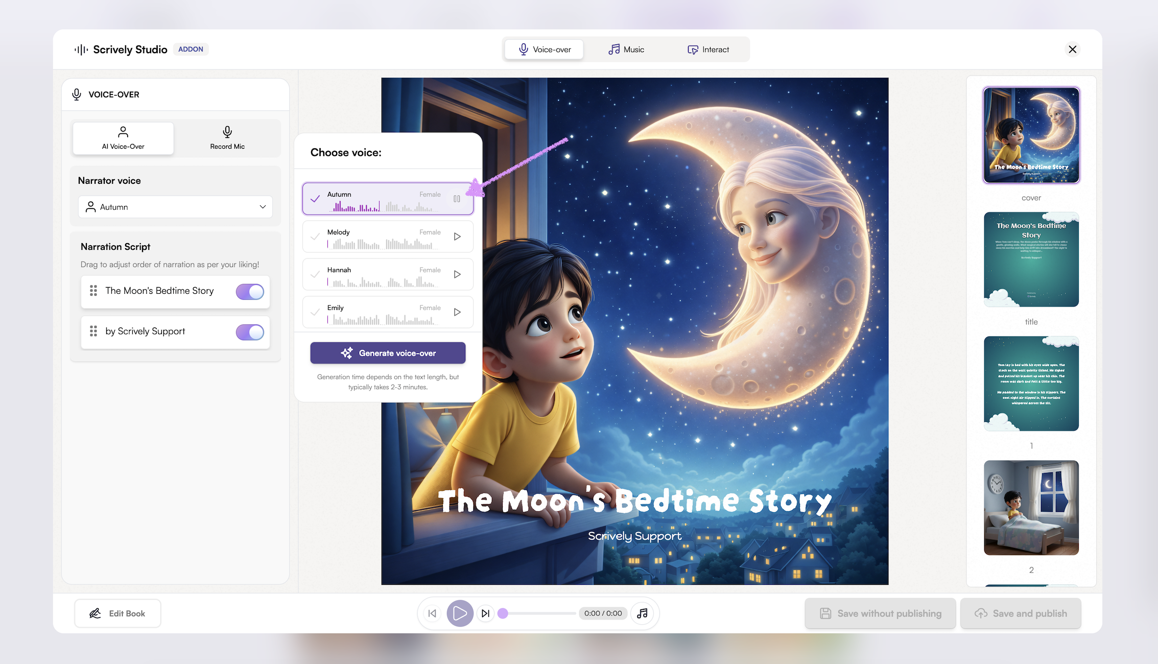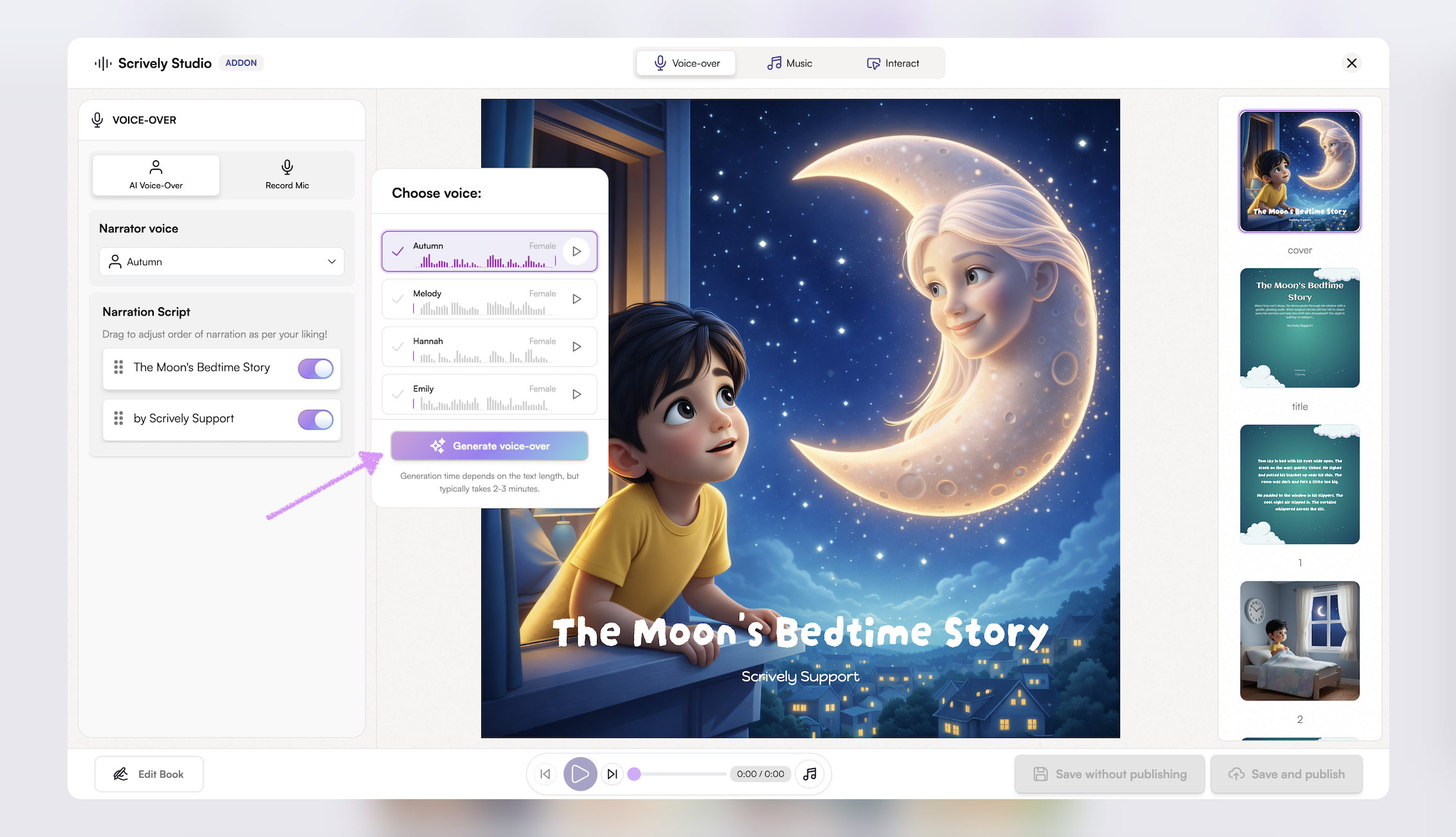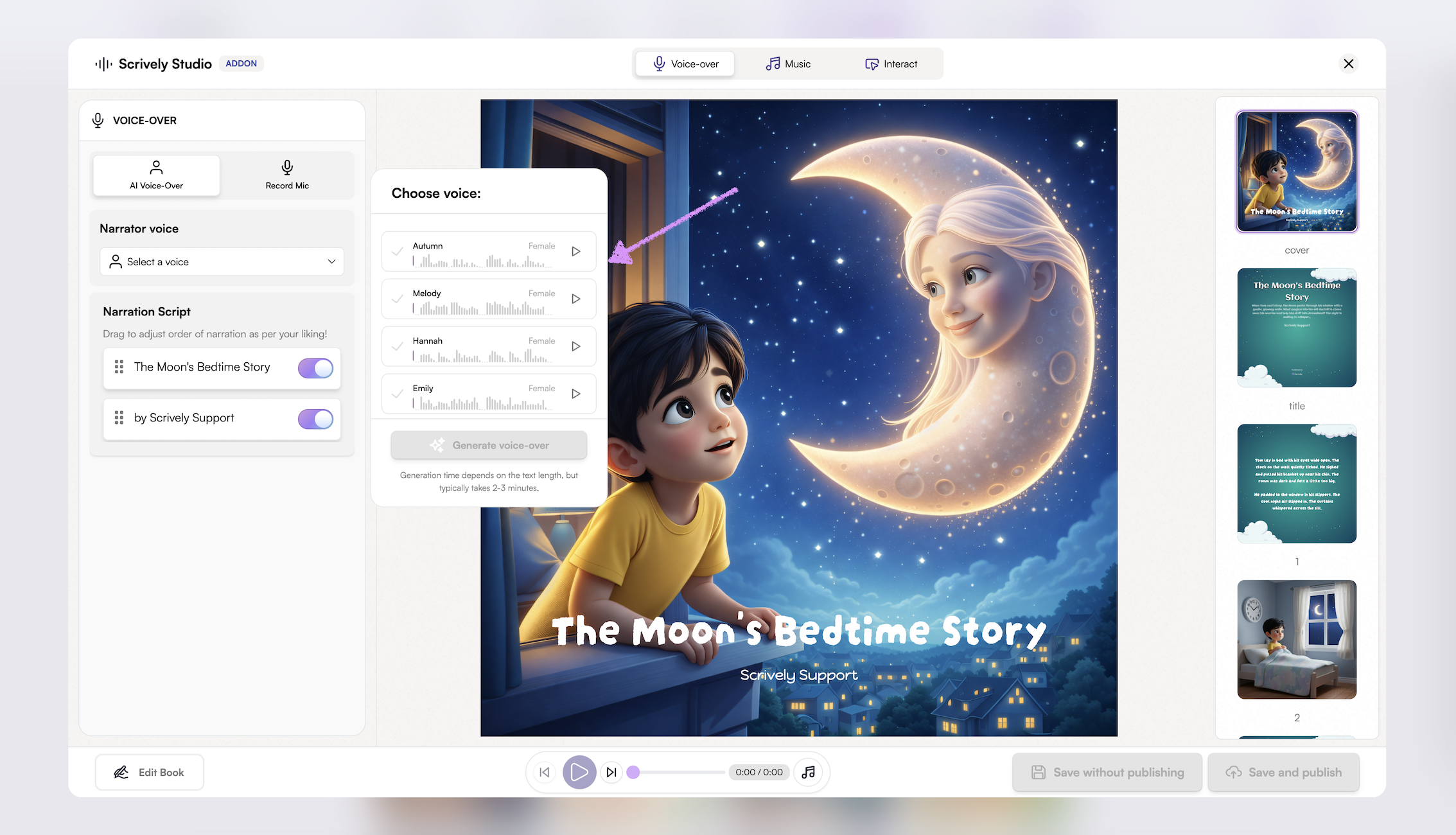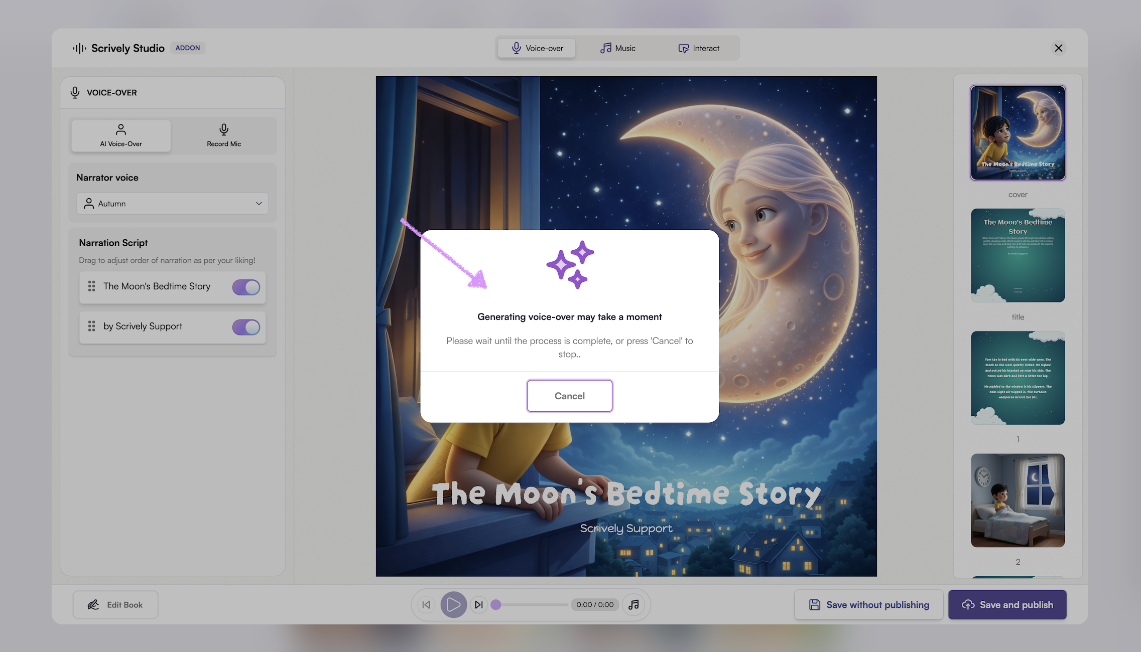 Give Scrively Studio a few moments to generate the voice-over for your book.