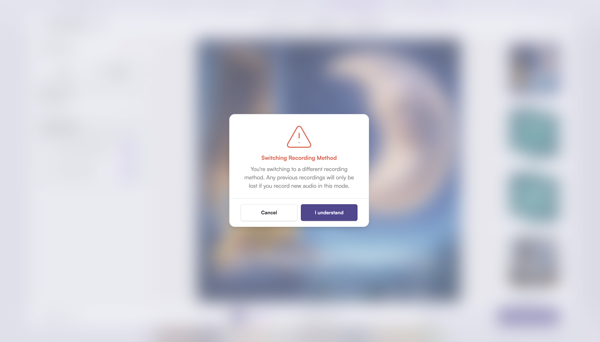 If you prefer, you can record your own voiceover. Please note, switching from AI voice-over to recording your own will trigger a warning below indicating that previous recordings won’t be lost unless you record new audio in the new mode.