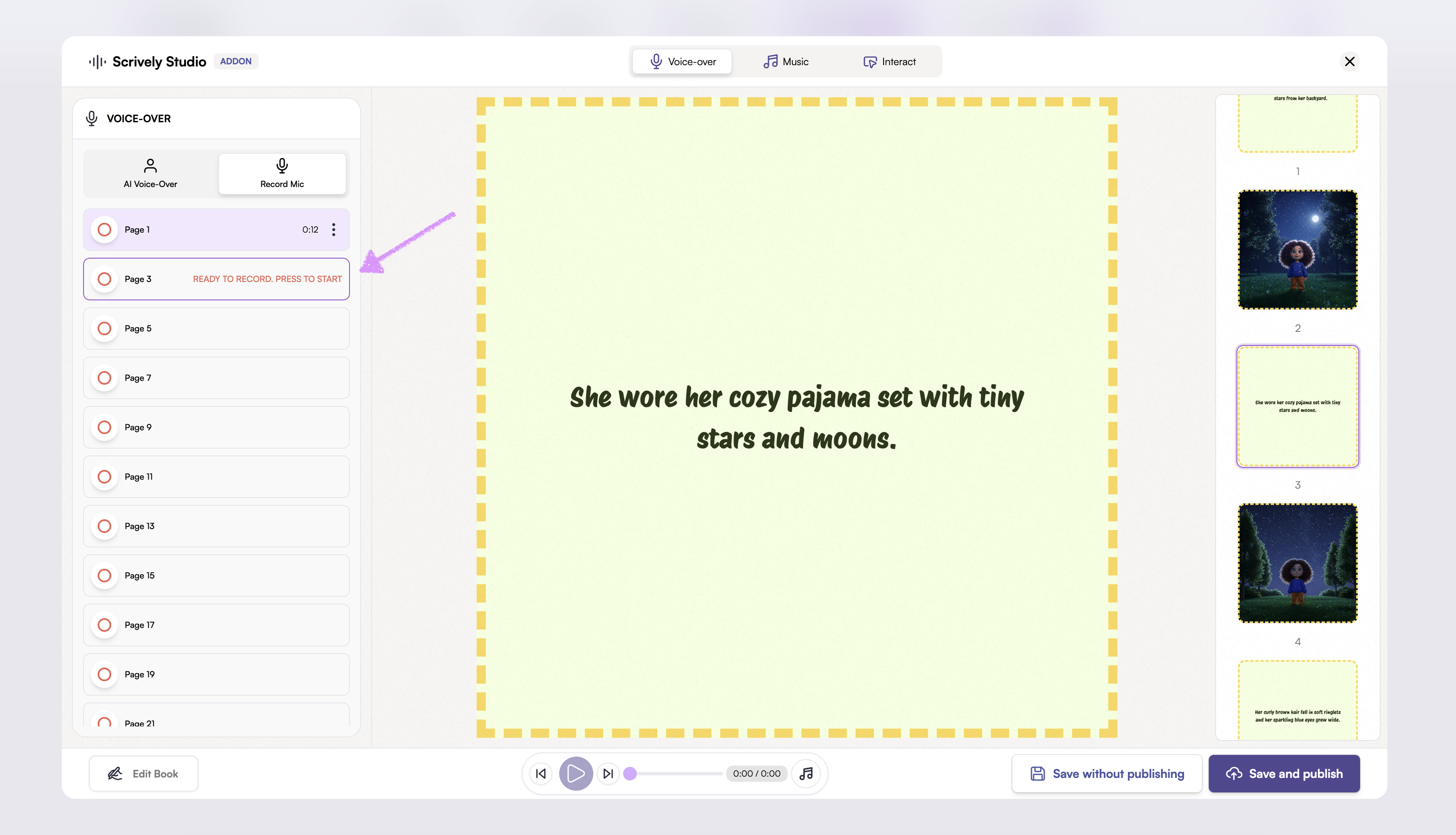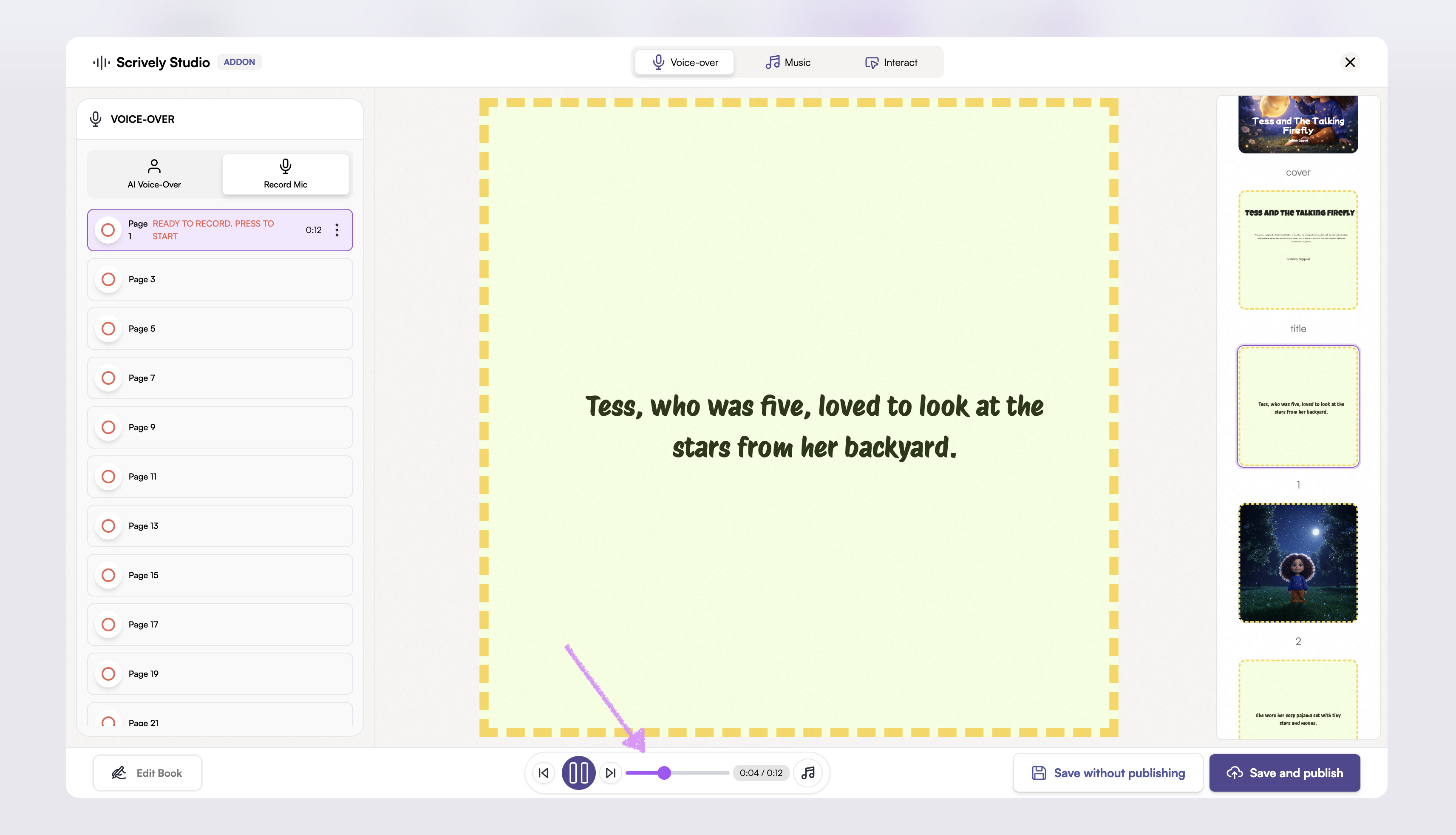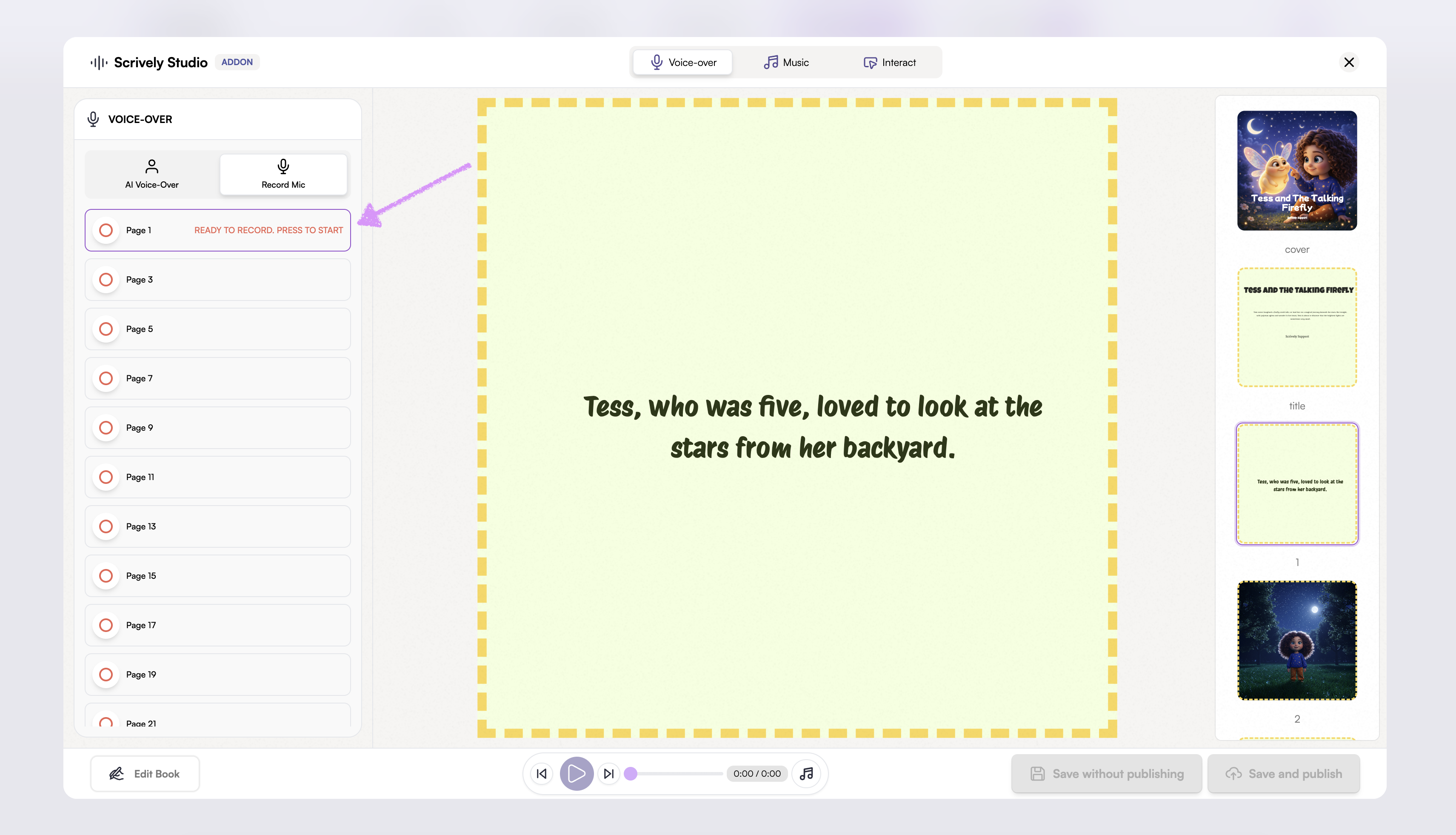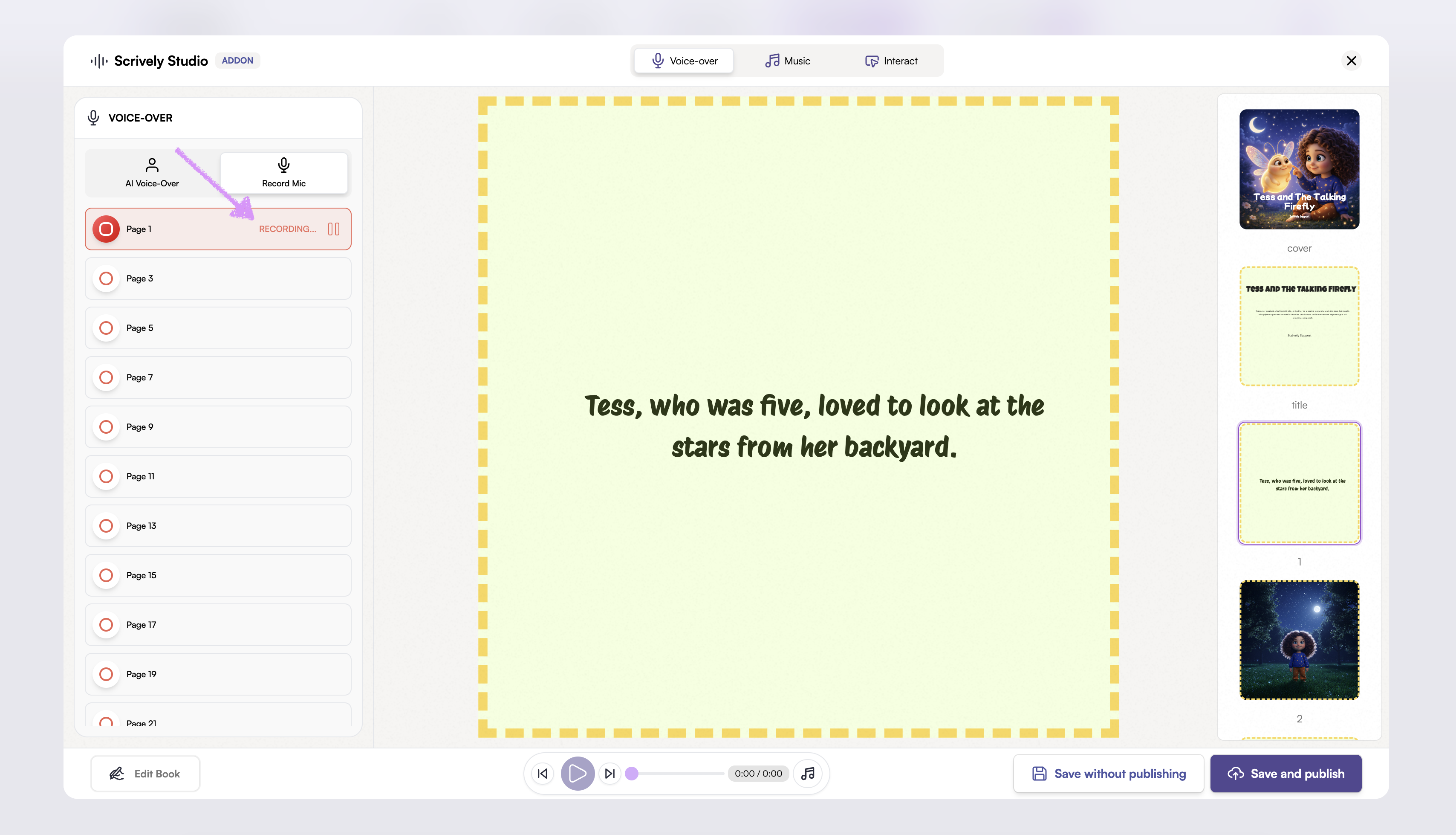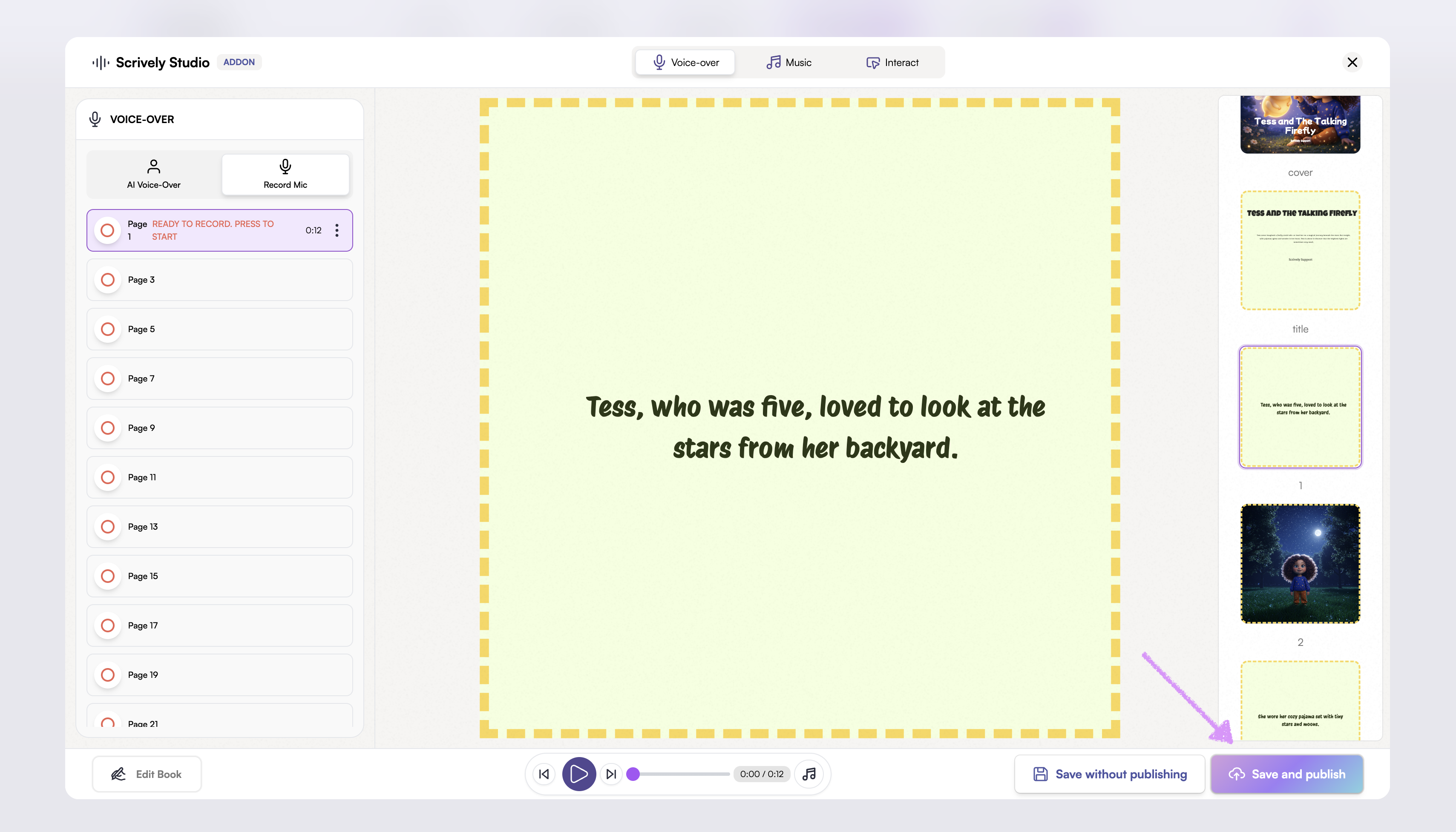 Give your stories a unique and captivating voice by adding custom voiceovers. Personalized narration adds warmth and personality, transforming each story into an unforgettable experience that truly resonates with readers.