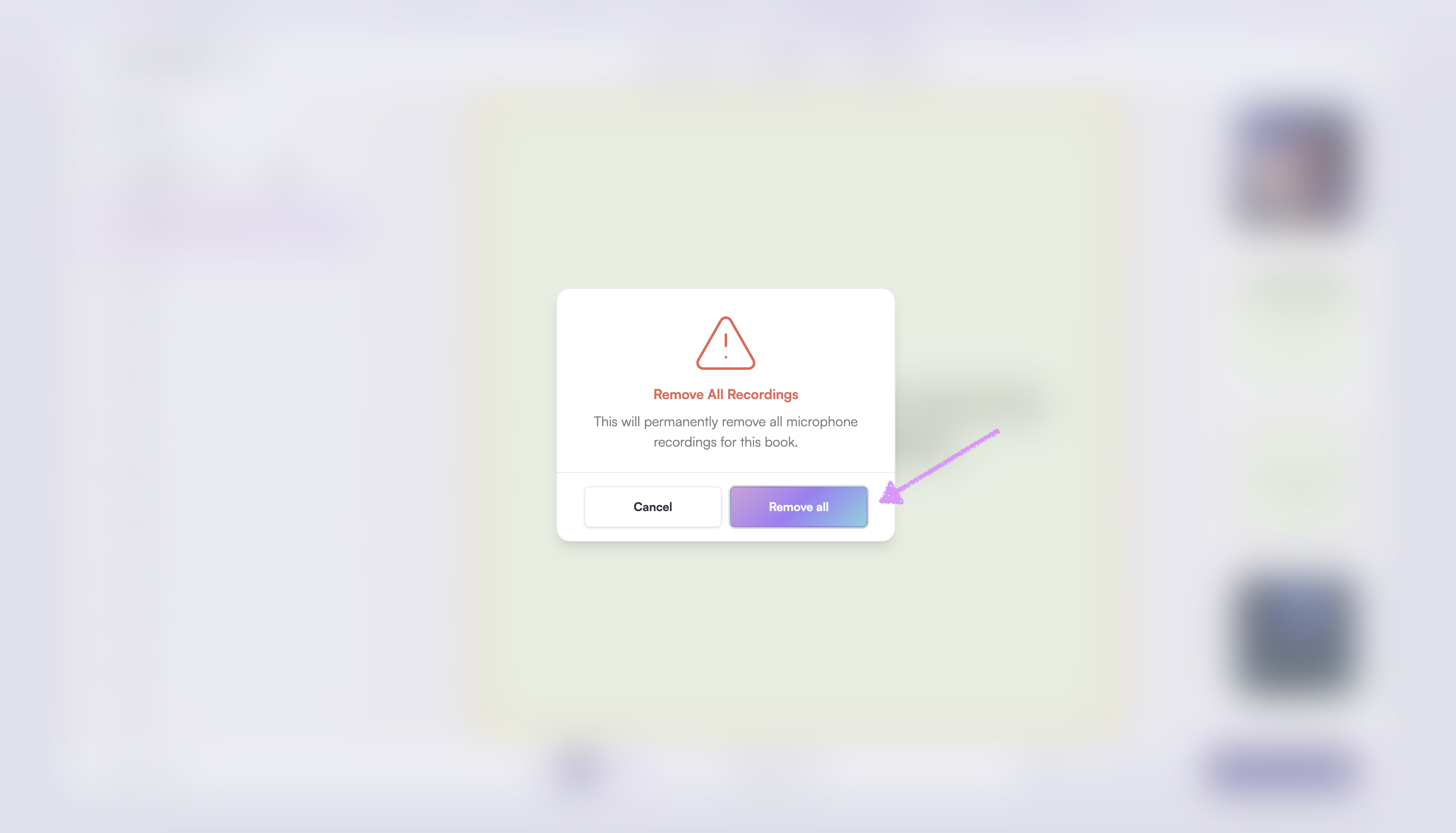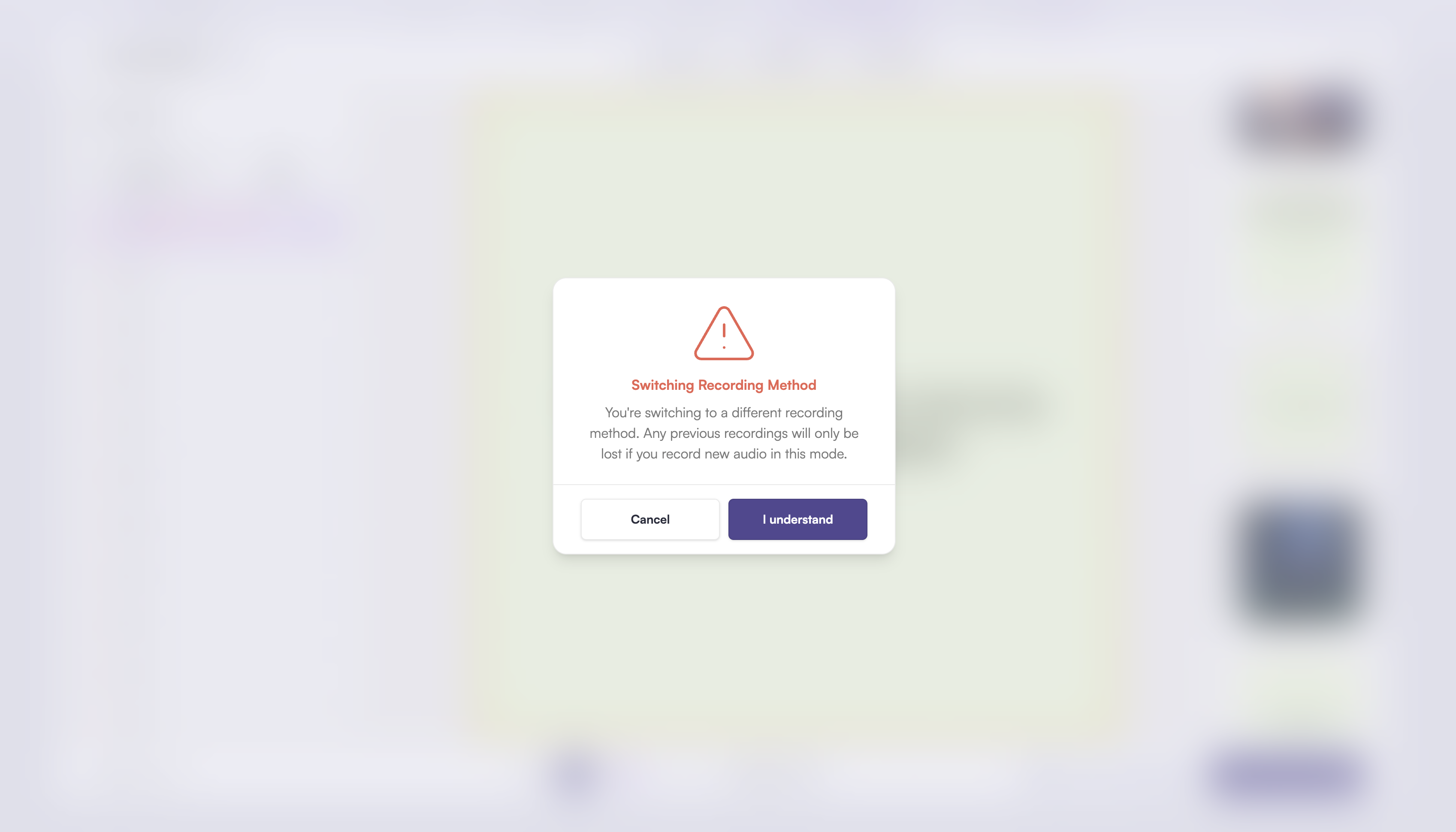 If you prefer, you can use an AI Voice-Over. Please note, switching from recording your own voiceover to AI voice-over will trigger a warning below indicating that previous recordings won’t be lost unless you record new audio in the new mode.