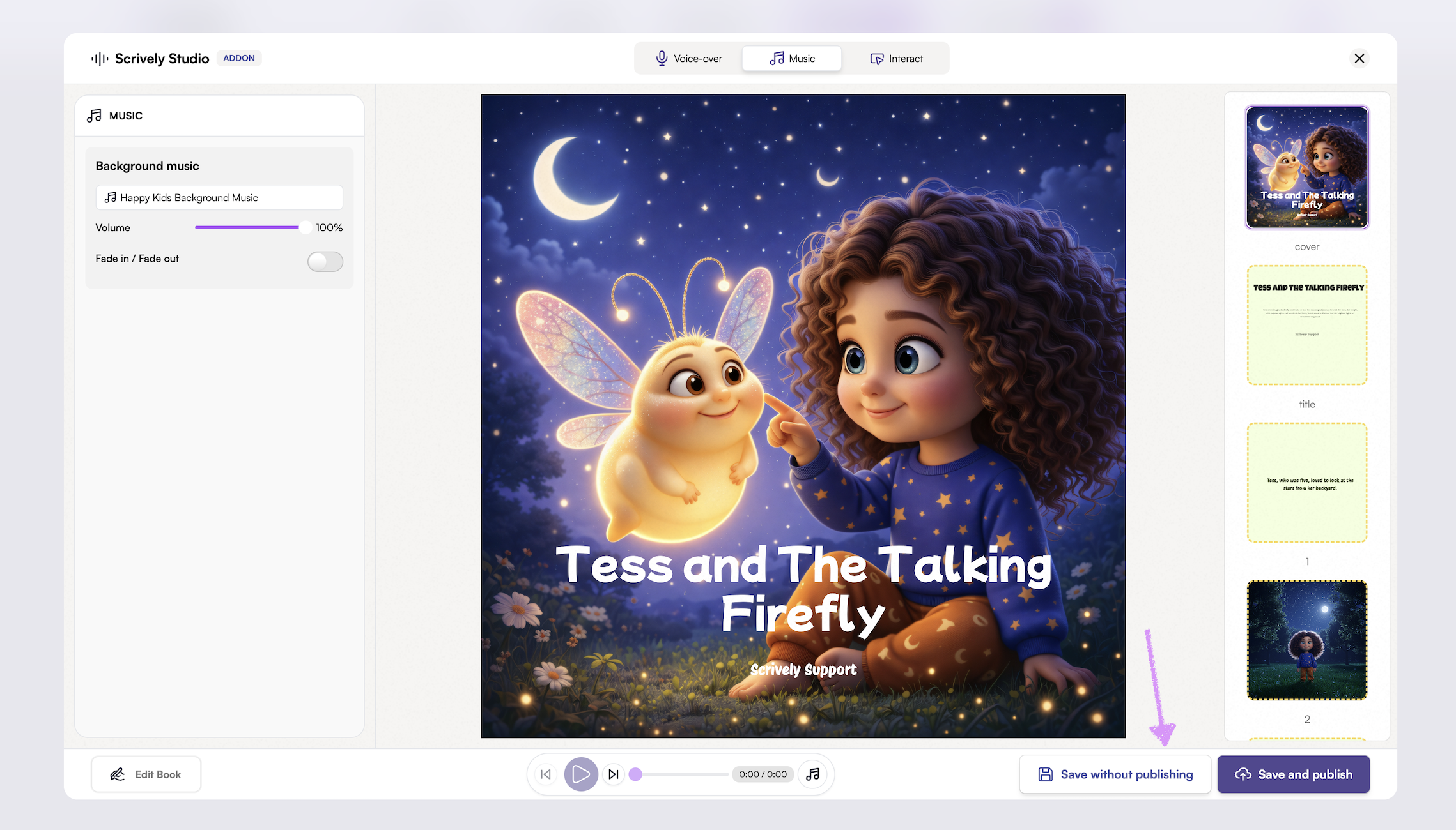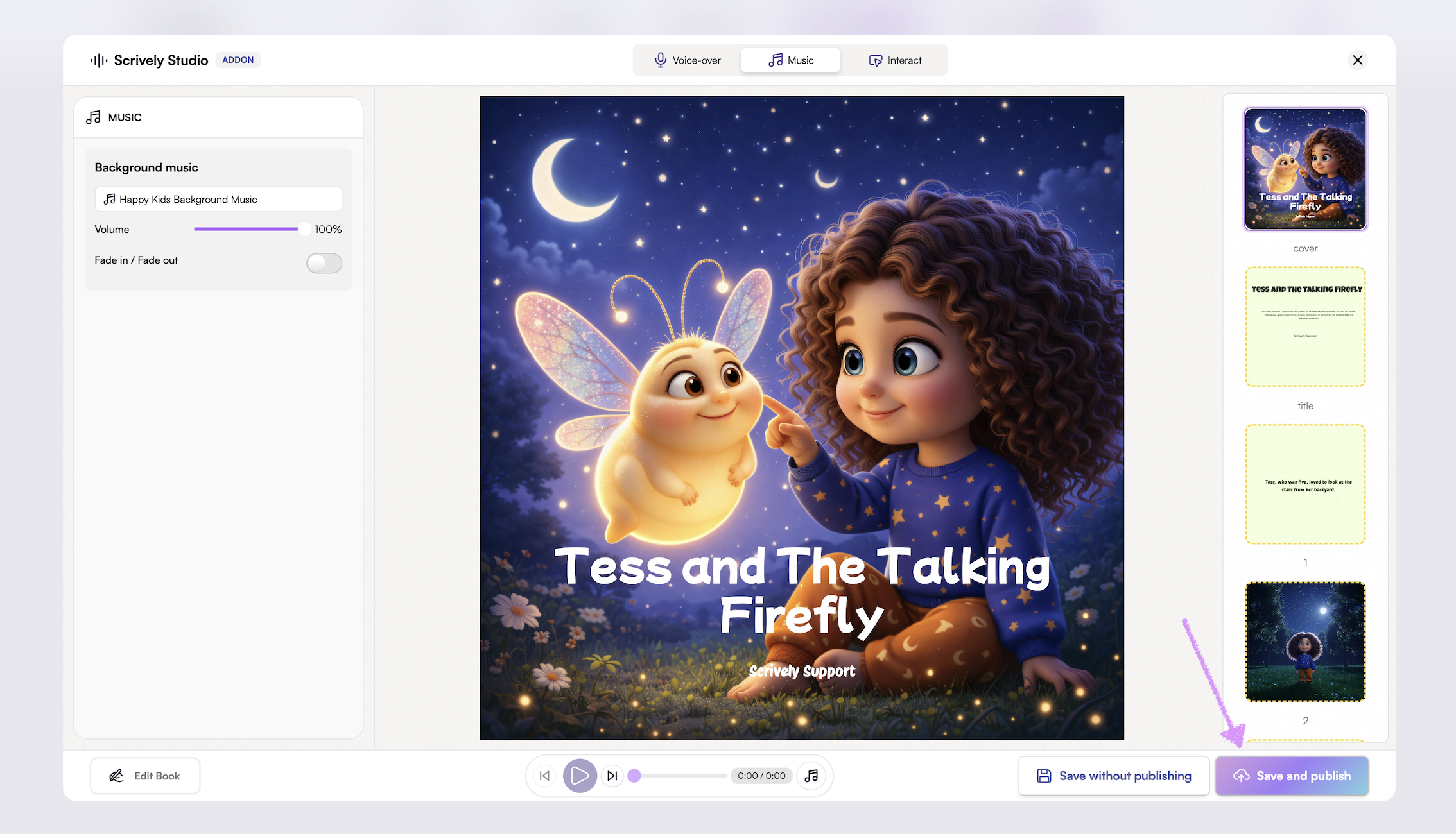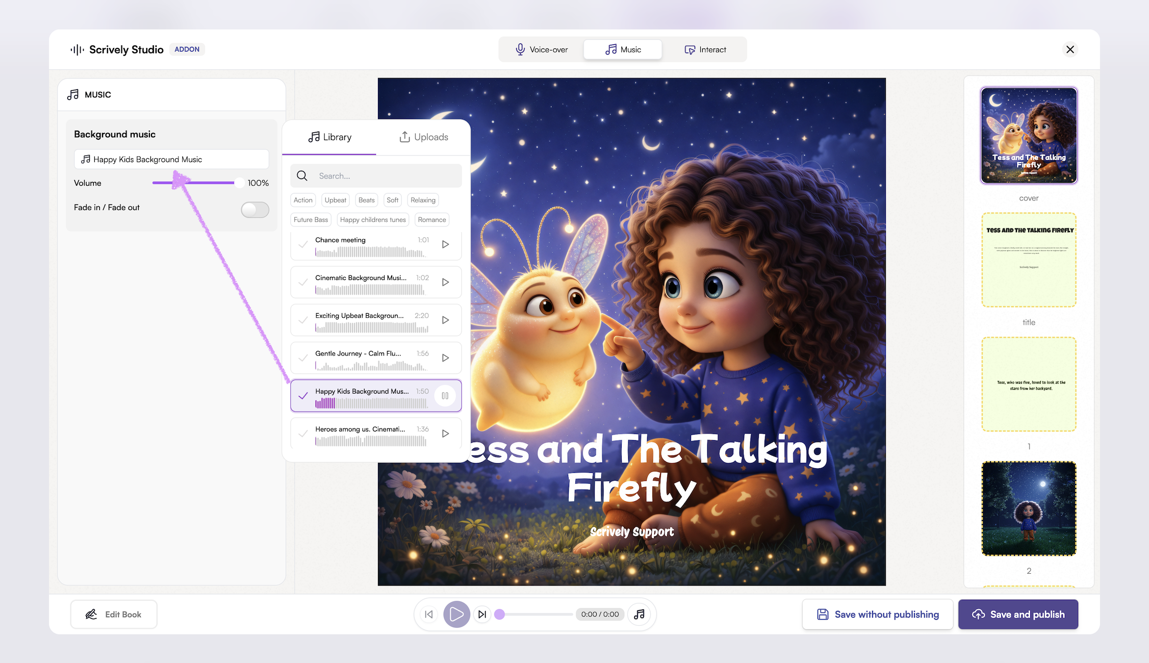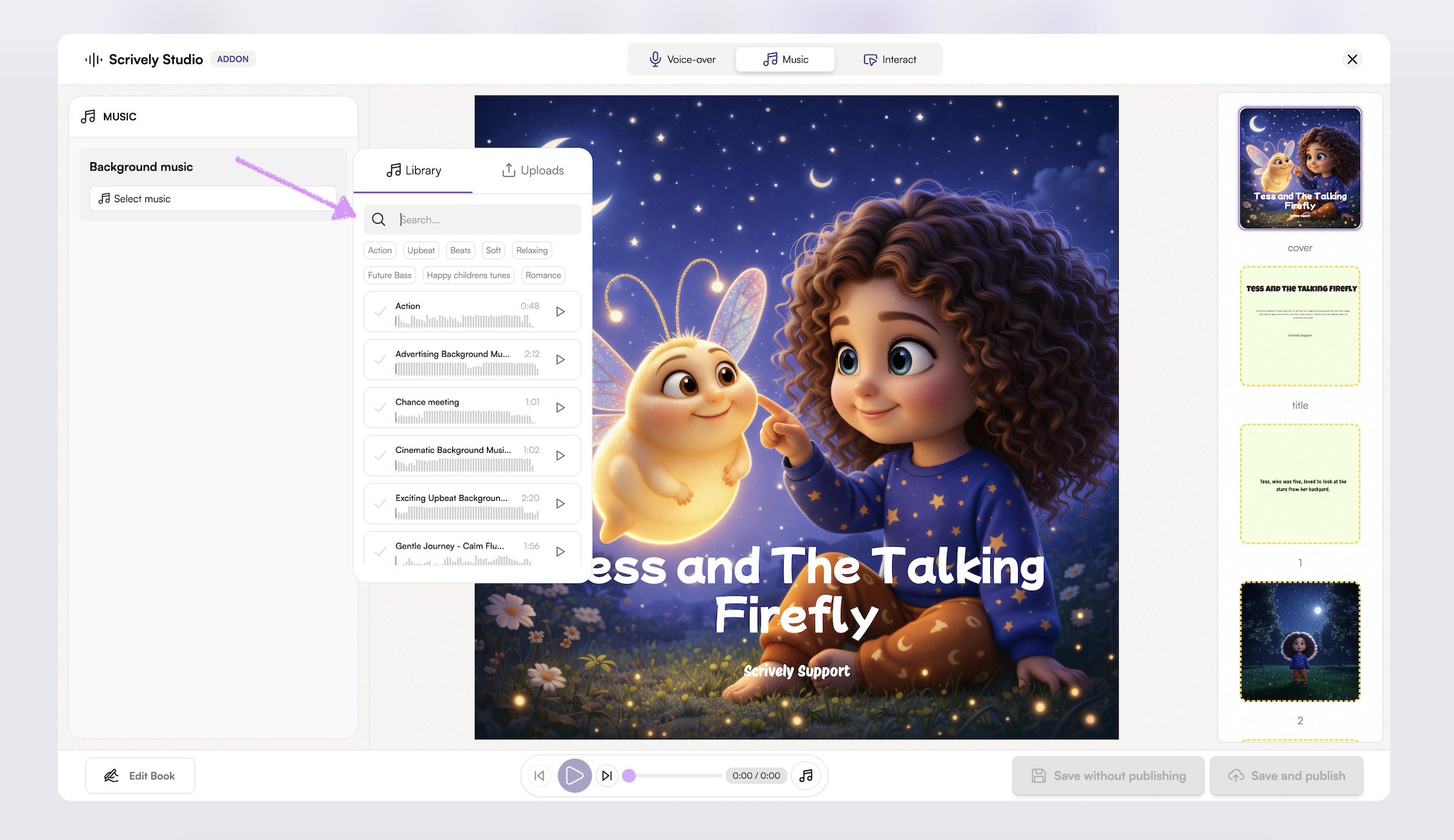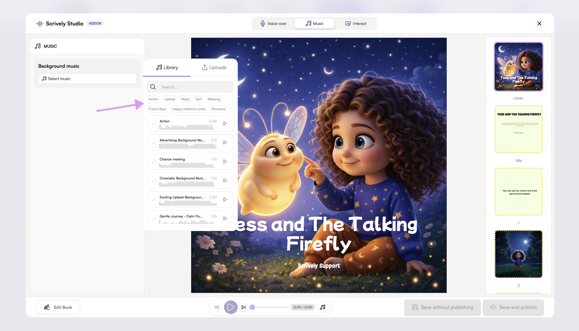 Set the perfect mood for your story with background music. From soft, calming melodies to lively, upbeat tunes, music can enhance emotion and bring each page to life.