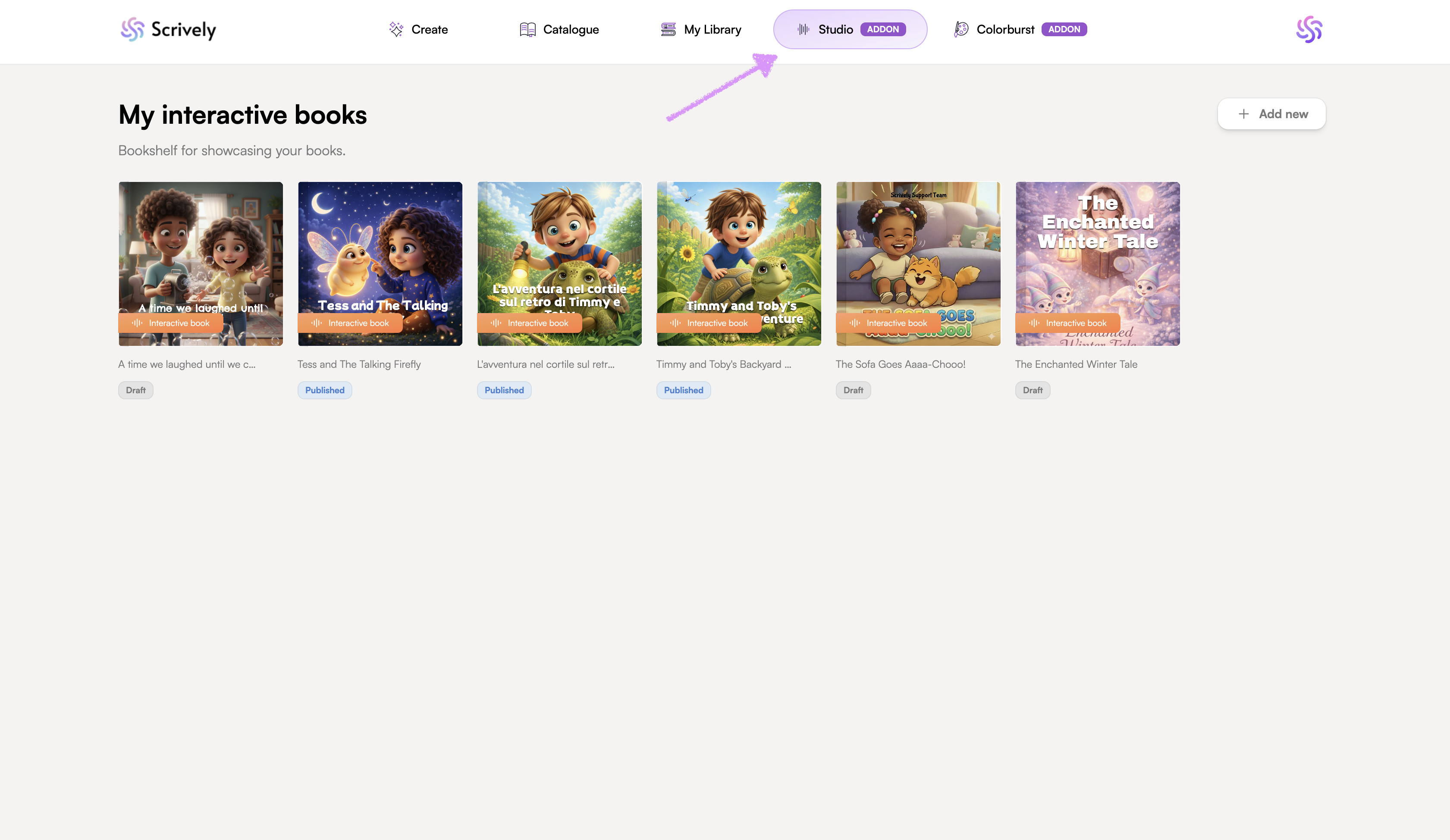 In the "Studio" tab, select the book you want to add interactive elements to.