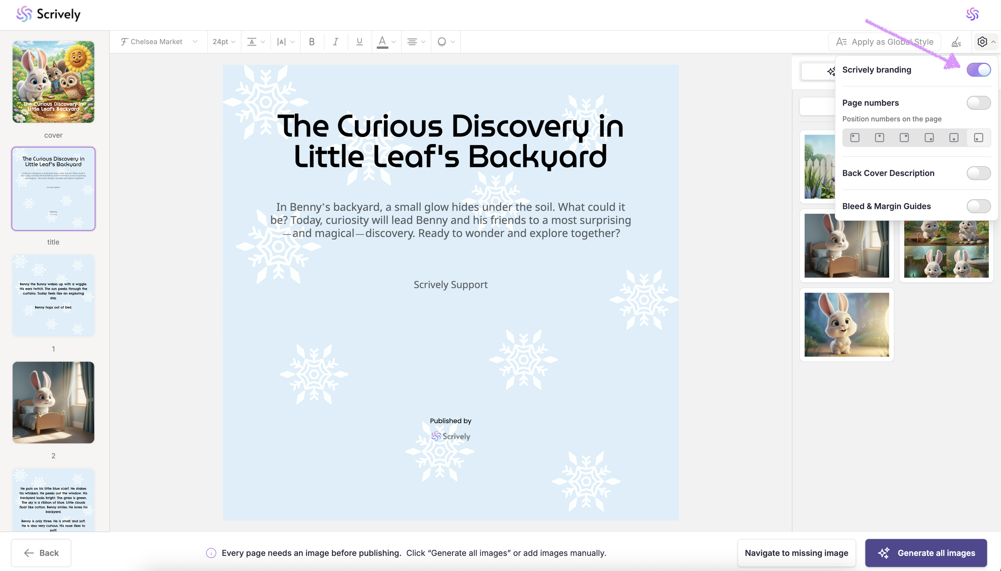 The Scrively branding will be removed from the title page. Toggle it back on if you'd like to add it.