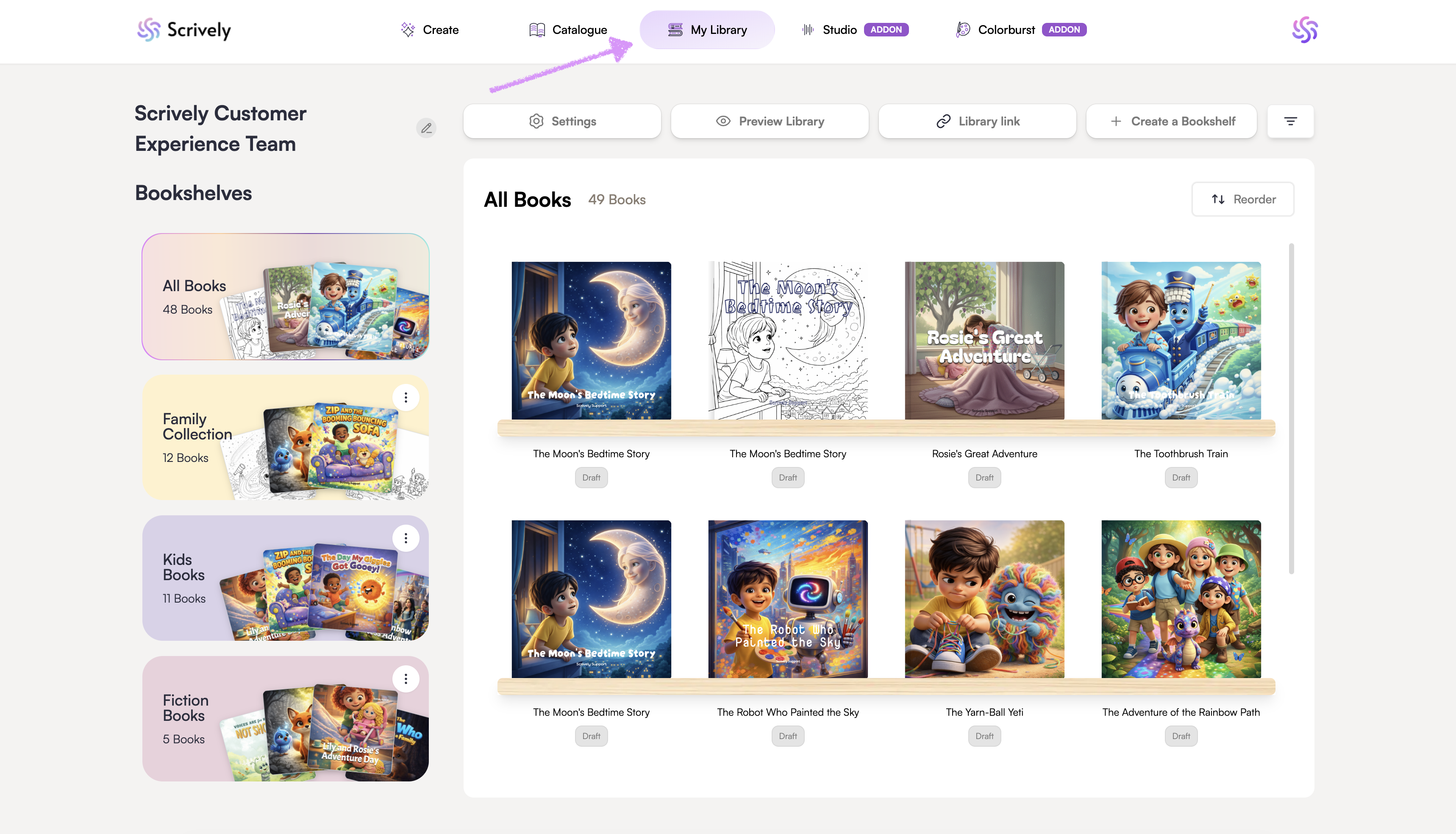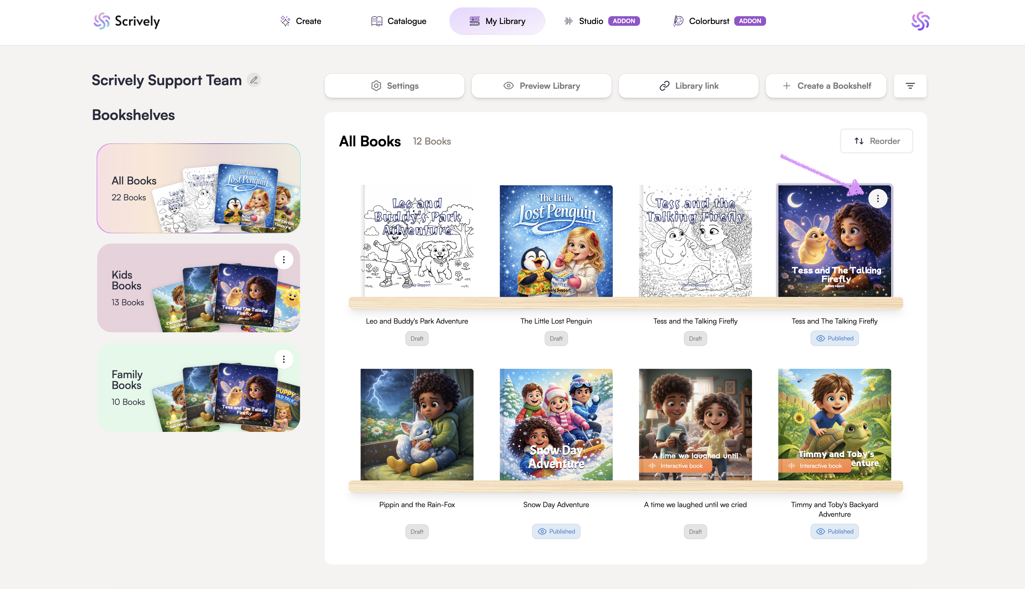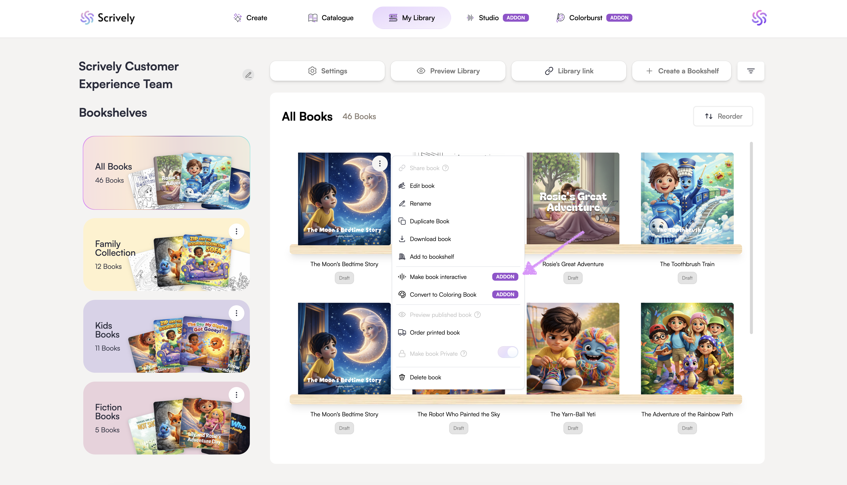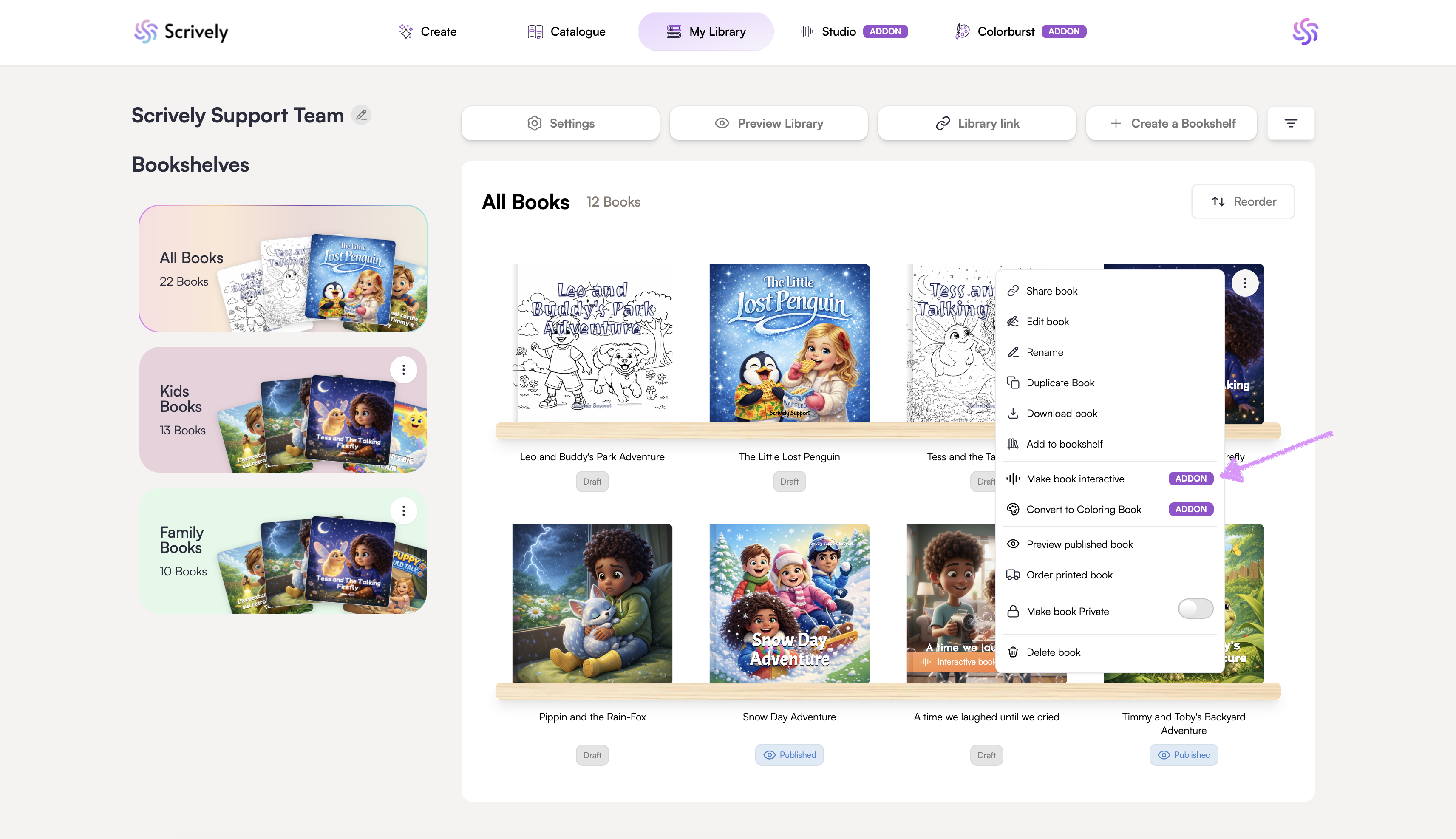 Bring your book to life with interactive features. Scrively Studio makes it easy to add voiceovers, background music and interactive elements to your books to engage readers when you share your library.
