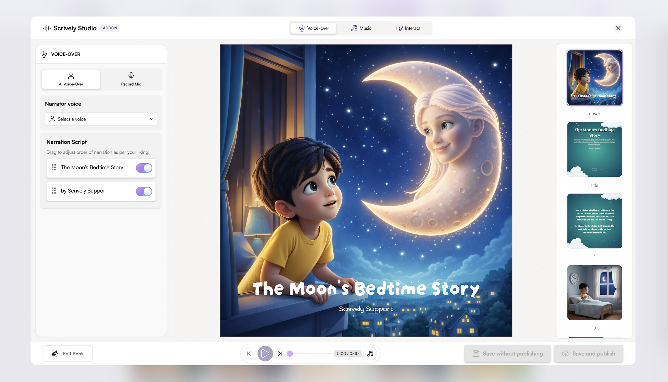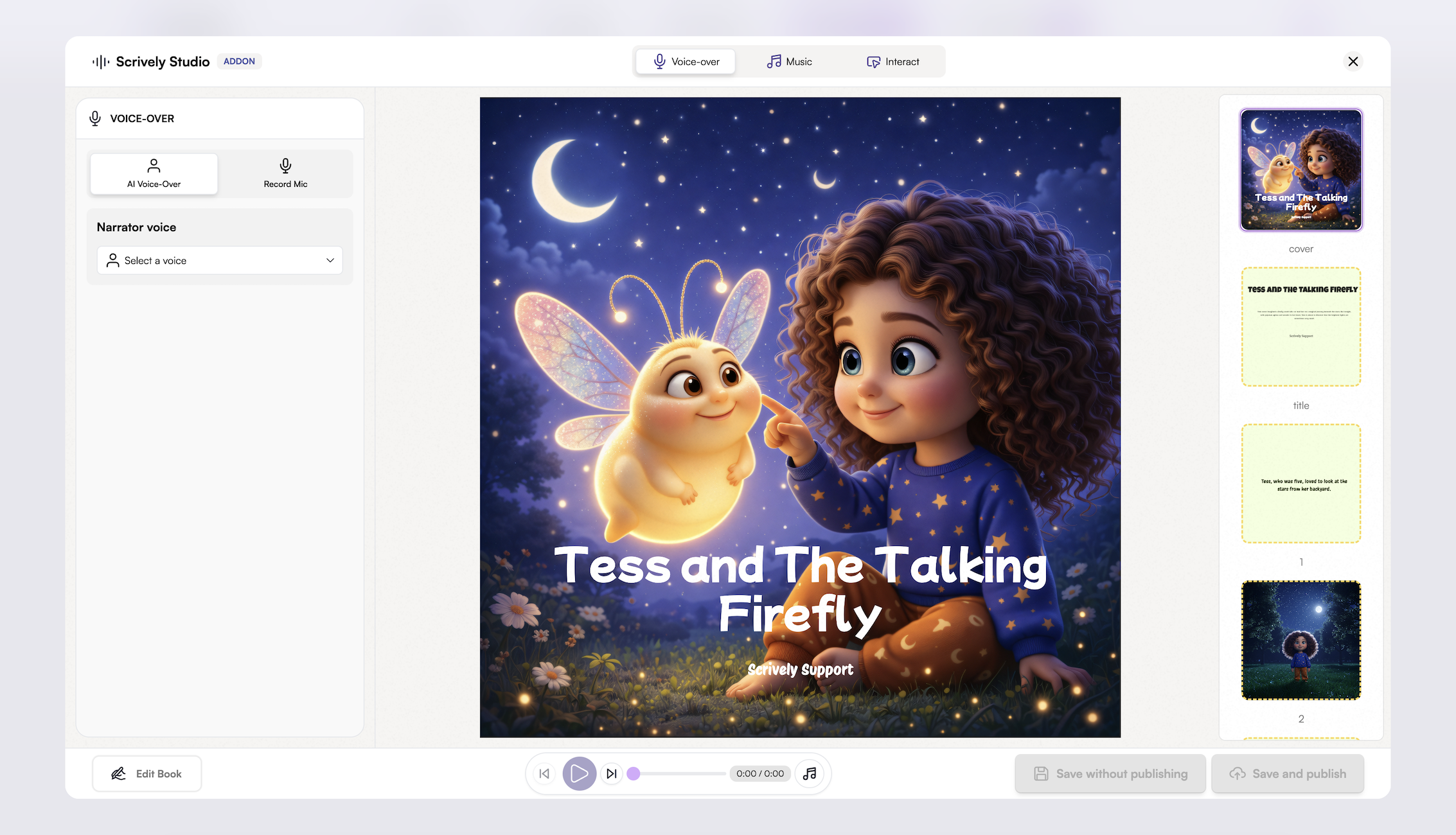 The book will open up in Scrively Studio where you can begin adding voiceovers, background music and interactive elements.