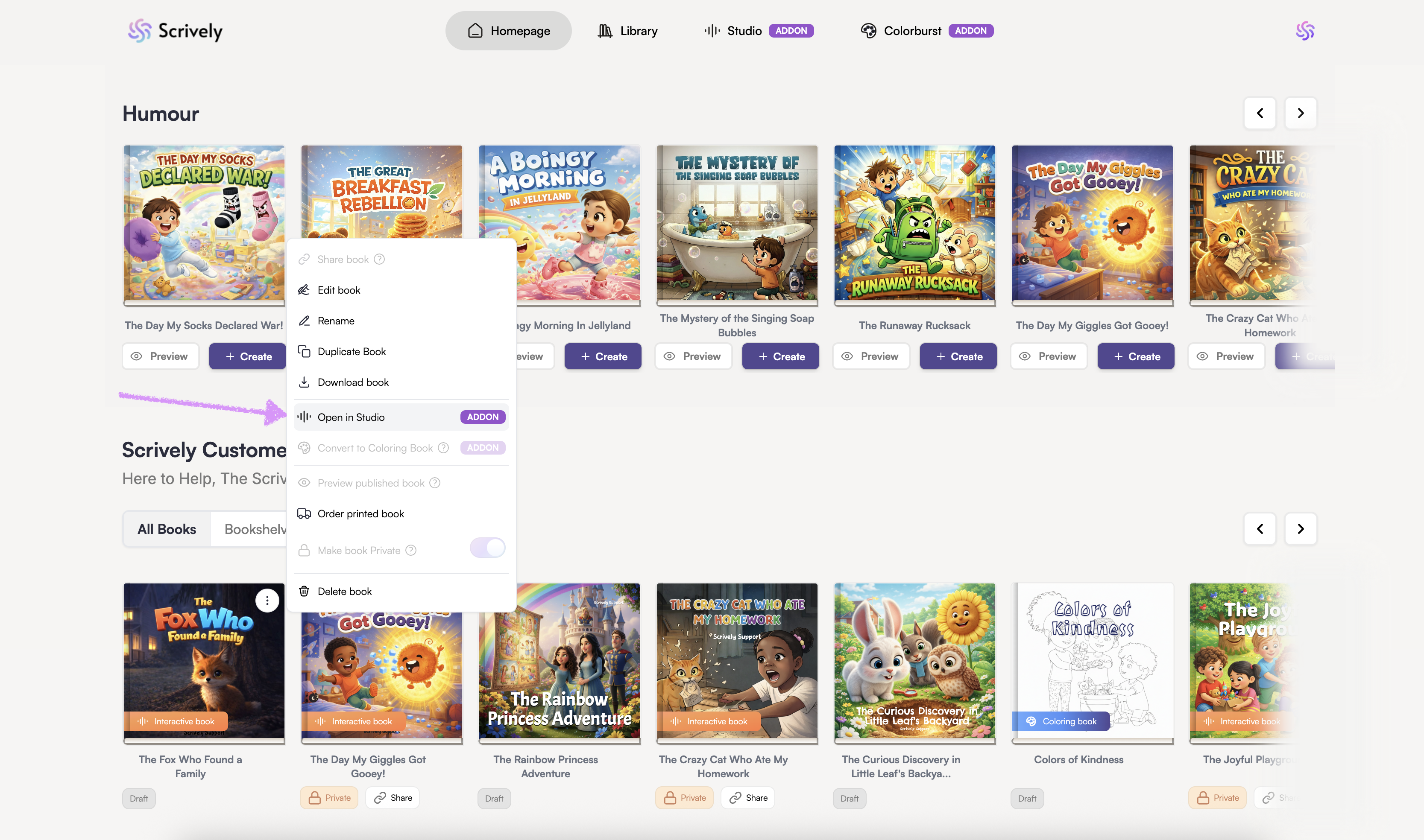 From your Scrively Homepage, scroll down to your library and hover over the book you’d like to open in Scrively Studio. Click the ellipsis (⋮) menu that appears.