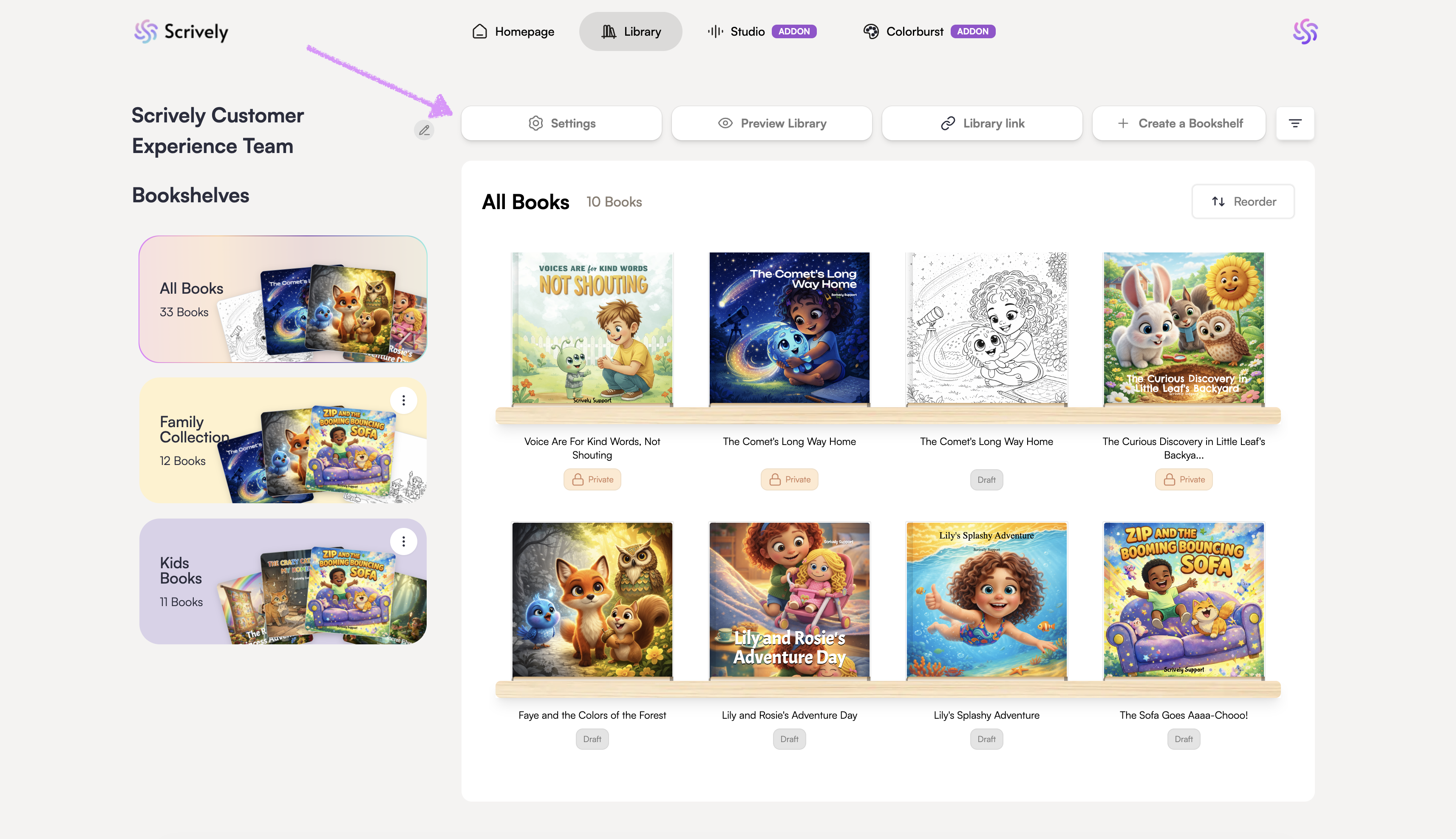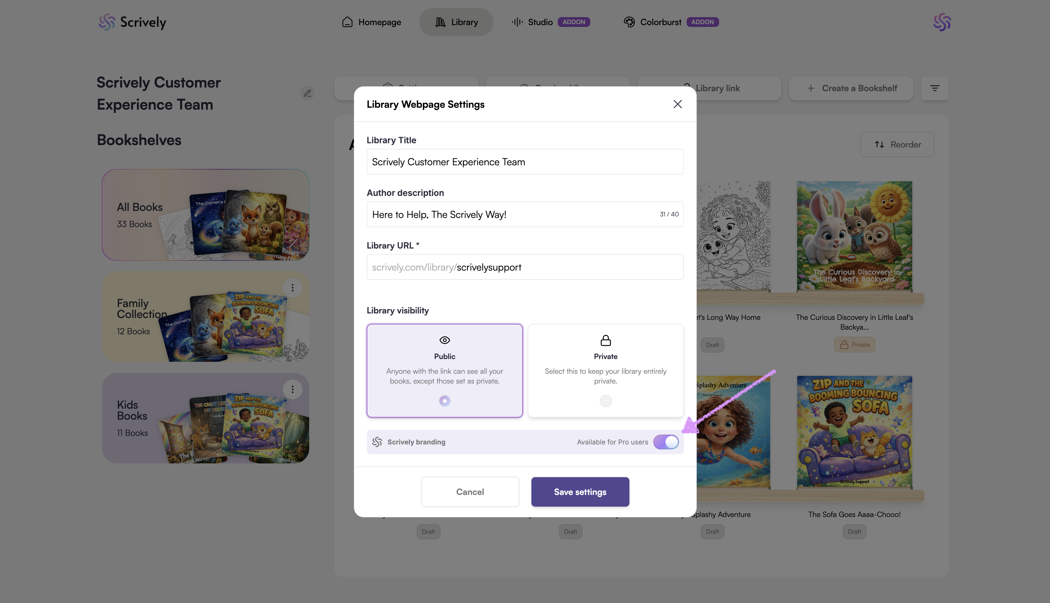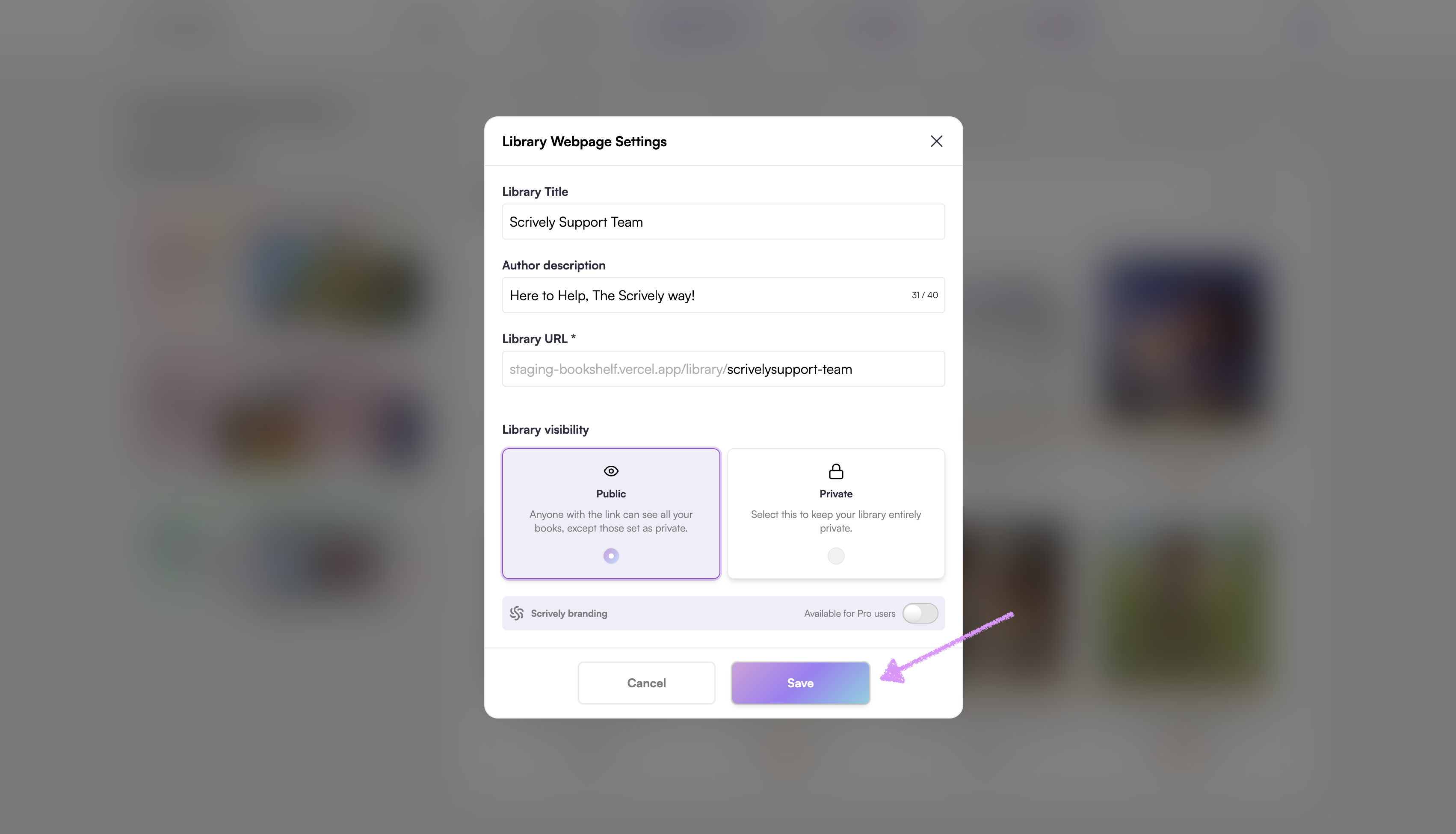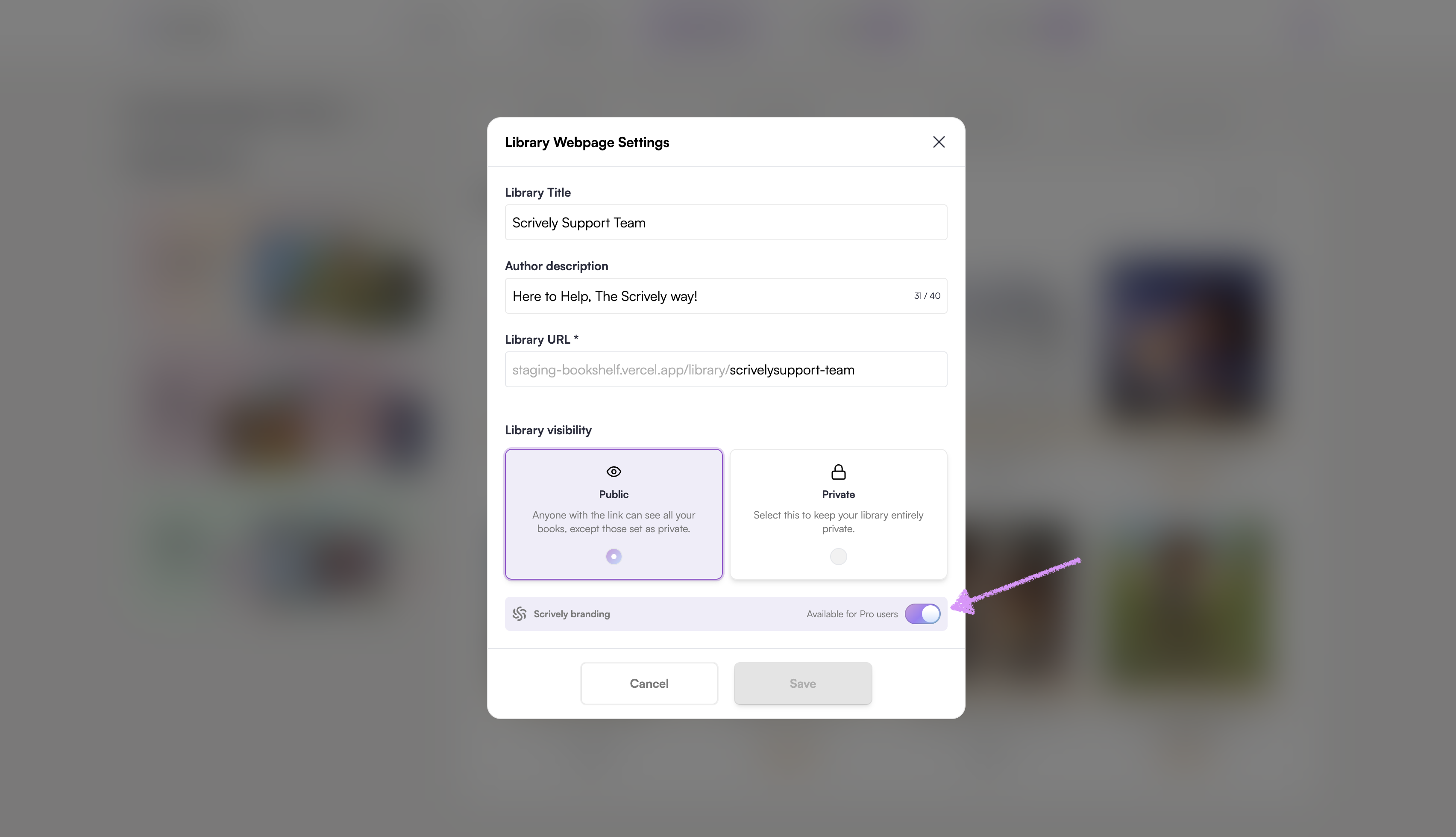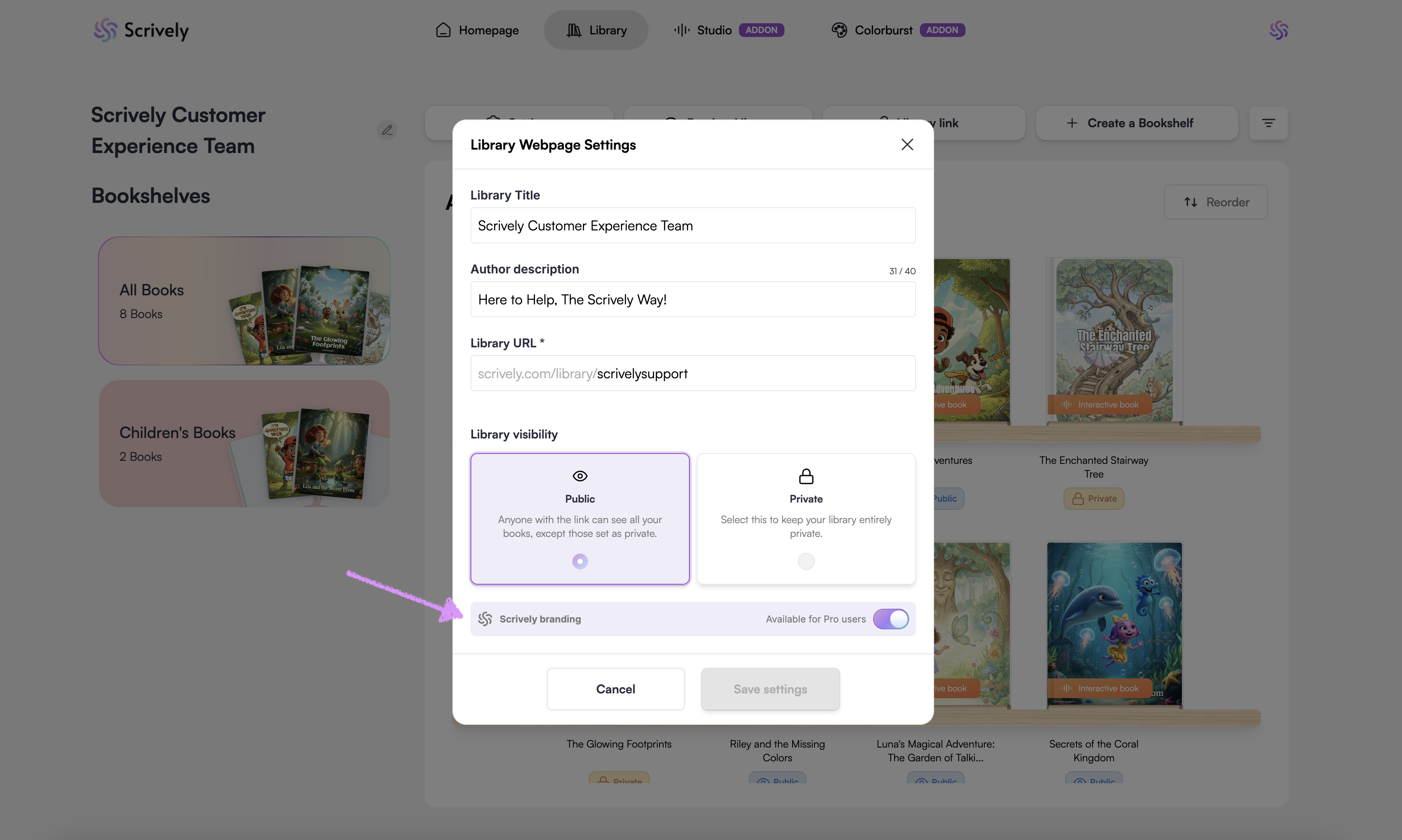 Pro users can remove the Scrively branding from their library giving it a cleaner, more professional look for readers. You can share your books without the default branding, or combine this with password protection to control access while keeping a polished presentation.