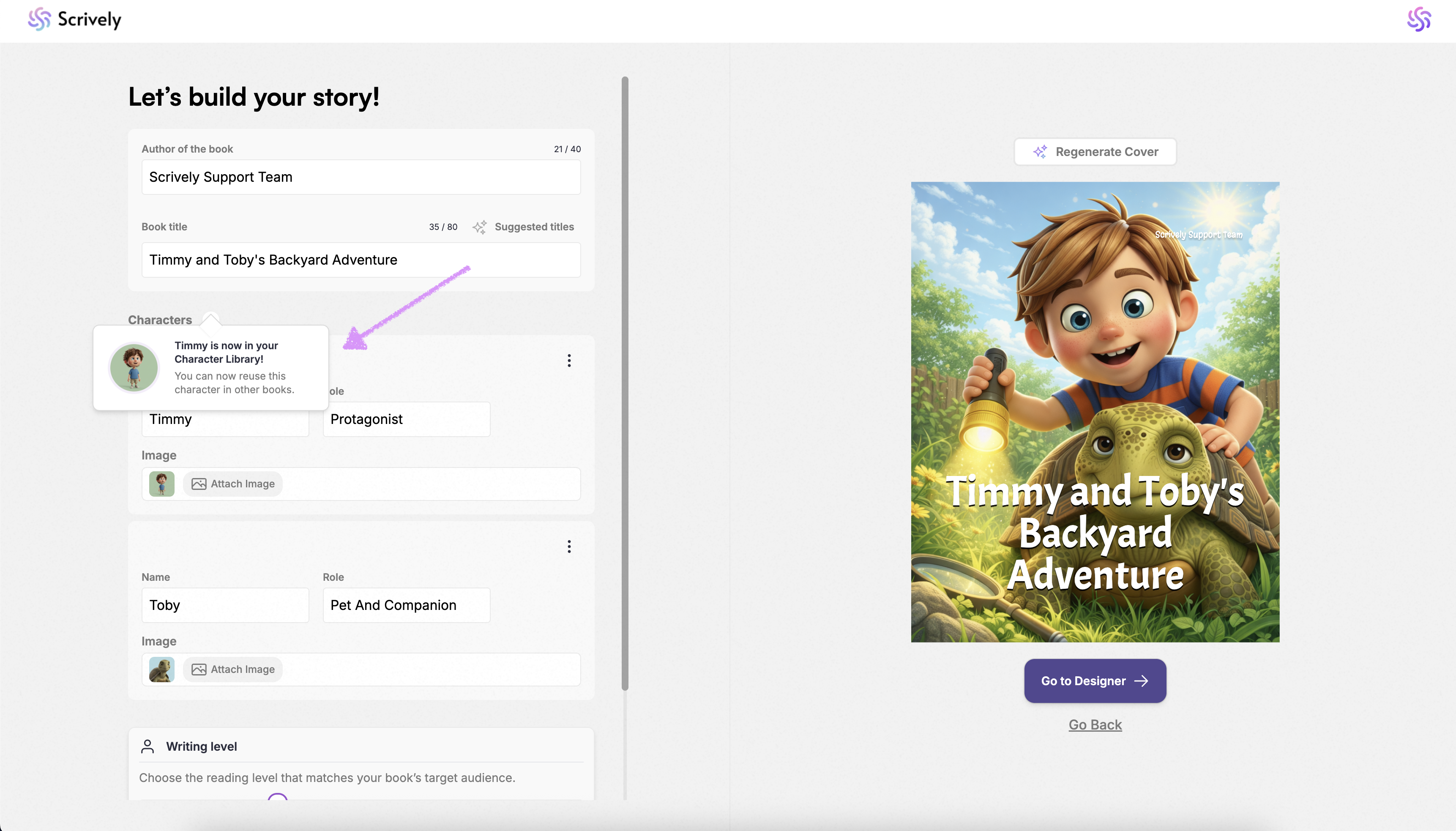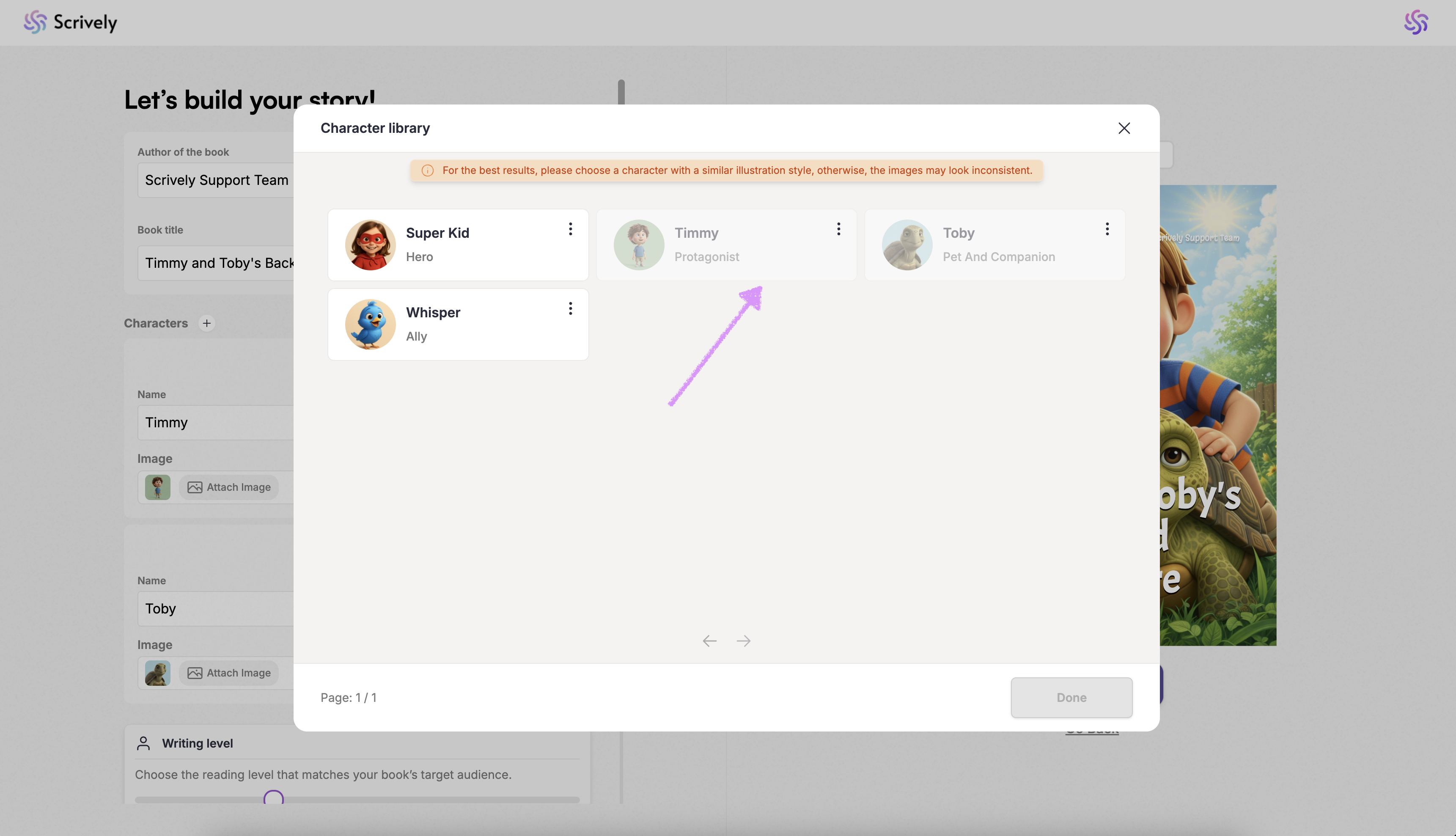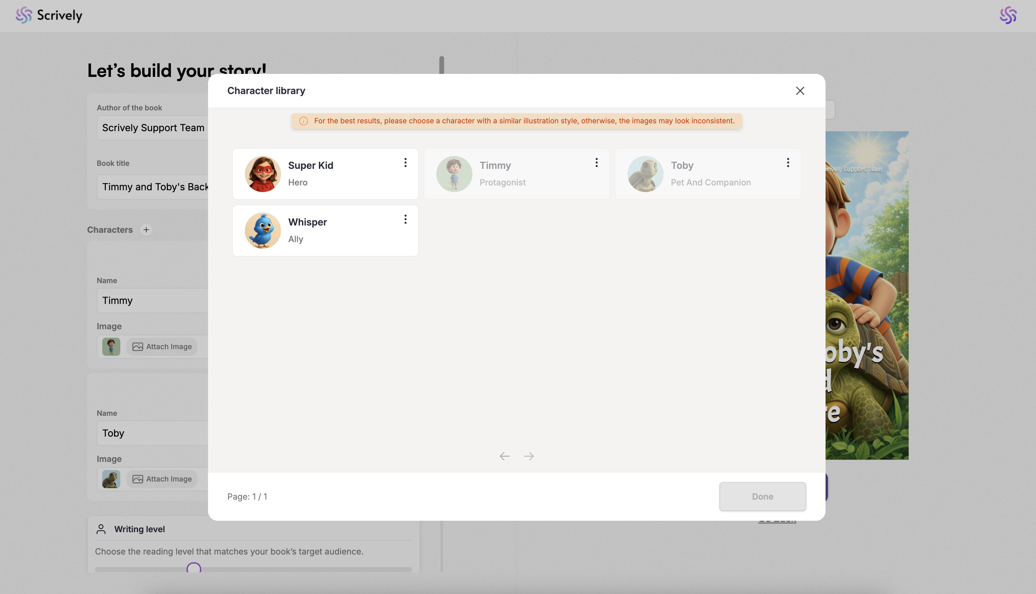 The character library lets you browse and use characters seamlessly when creating your books. With a centralized library, you can quickly find characters to use across your books, saving time and helping your stories come to life with ease.