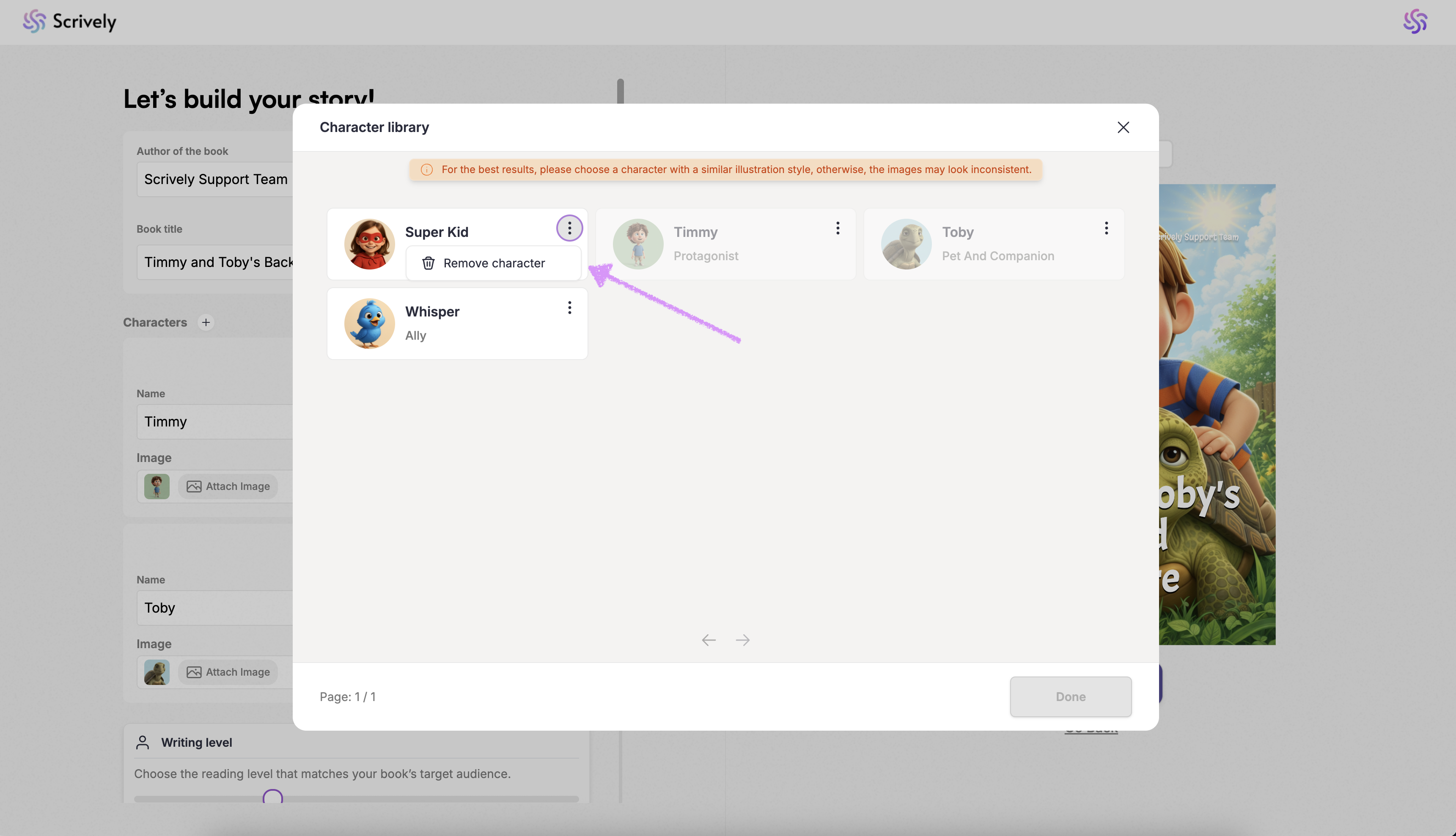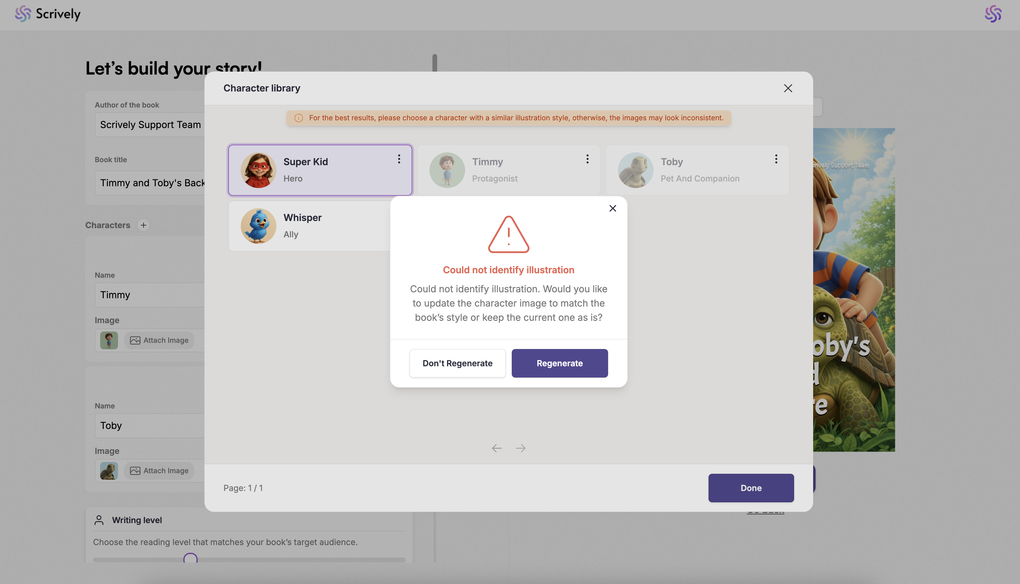 If a character’s illustration style in your library doesn’t match the selected storybook style, you’ll have the option to regenerate the character to align it or keep it as is. For a more consistent look throughout the book, we recommend regenerating the character.