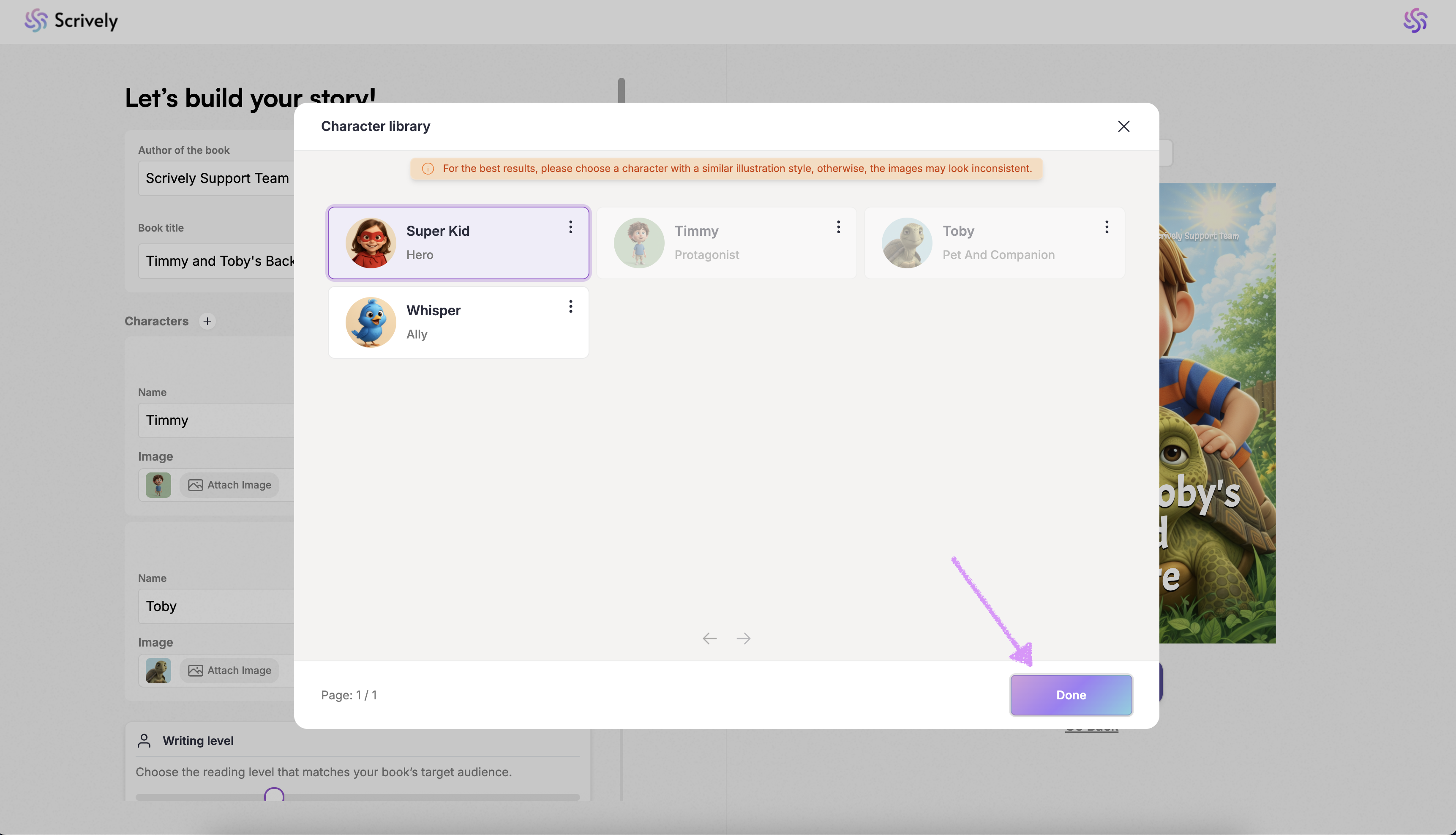 Ready to use the character in your book? Click on the character card to highlight it, then click on "Done" in the bottom-right corner to add it.