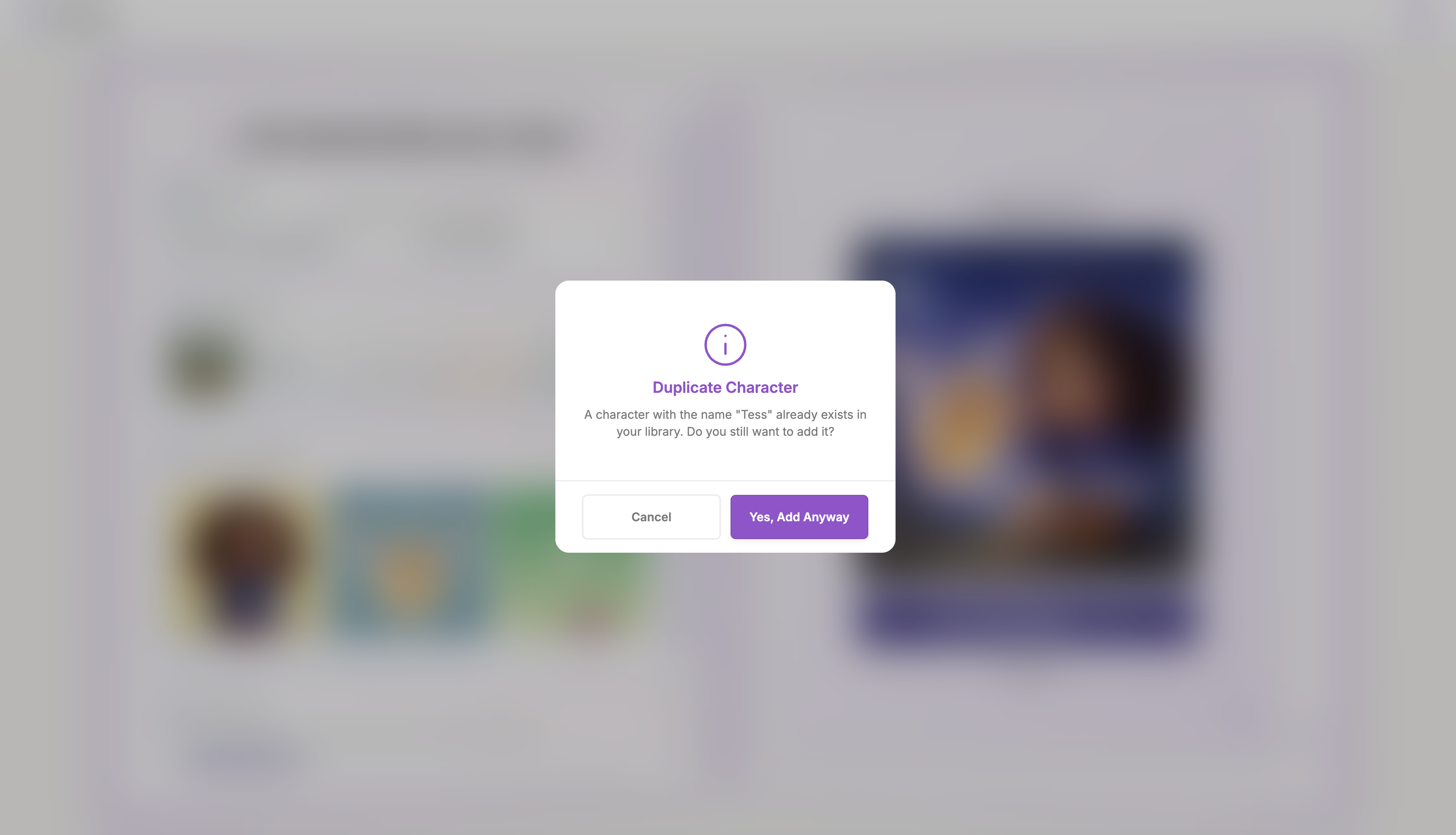 Note: If the character already exists in the library a confirmation modal will be displayed indicating that its a duplicate and asking you still want to add it to your library.