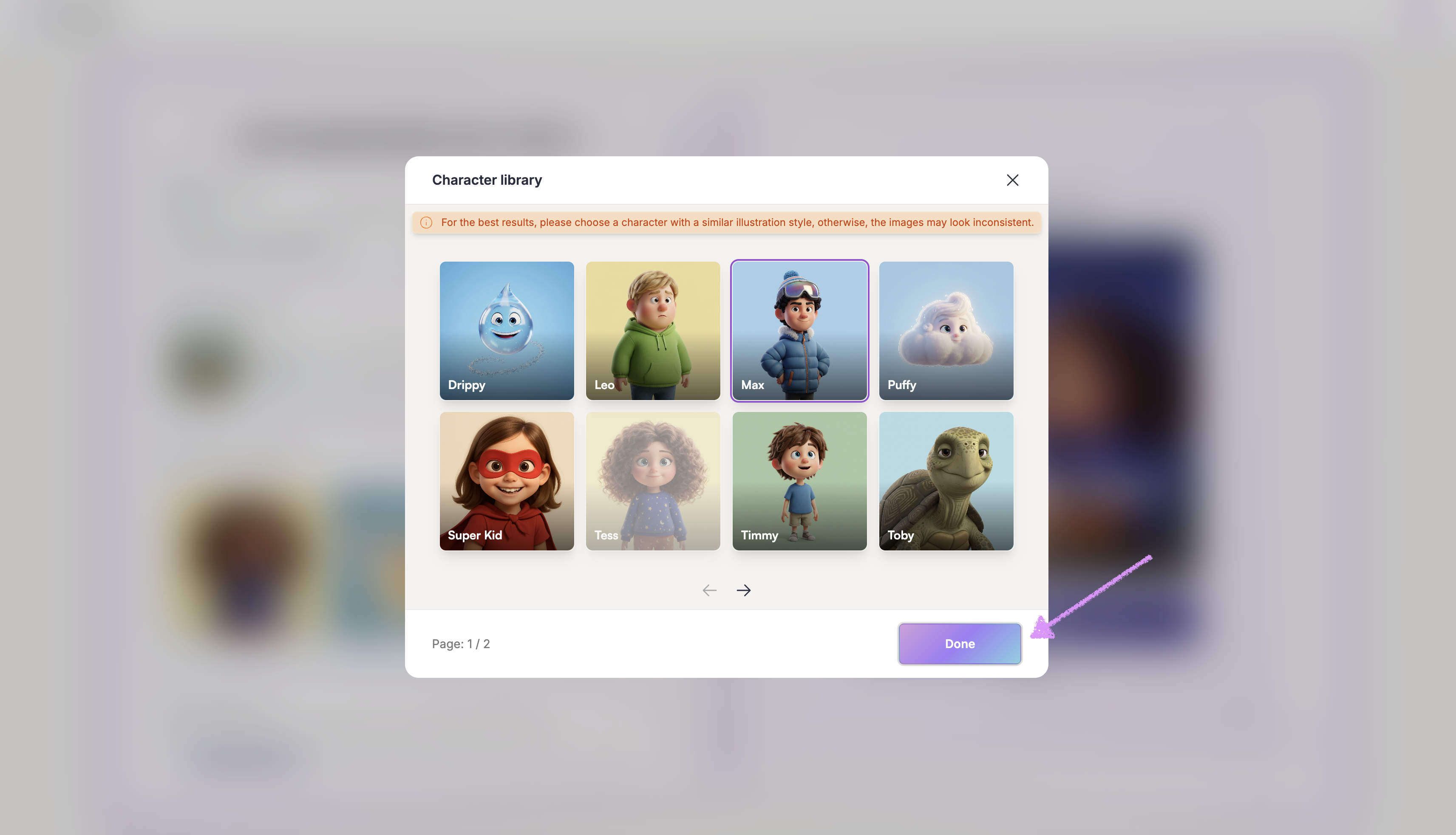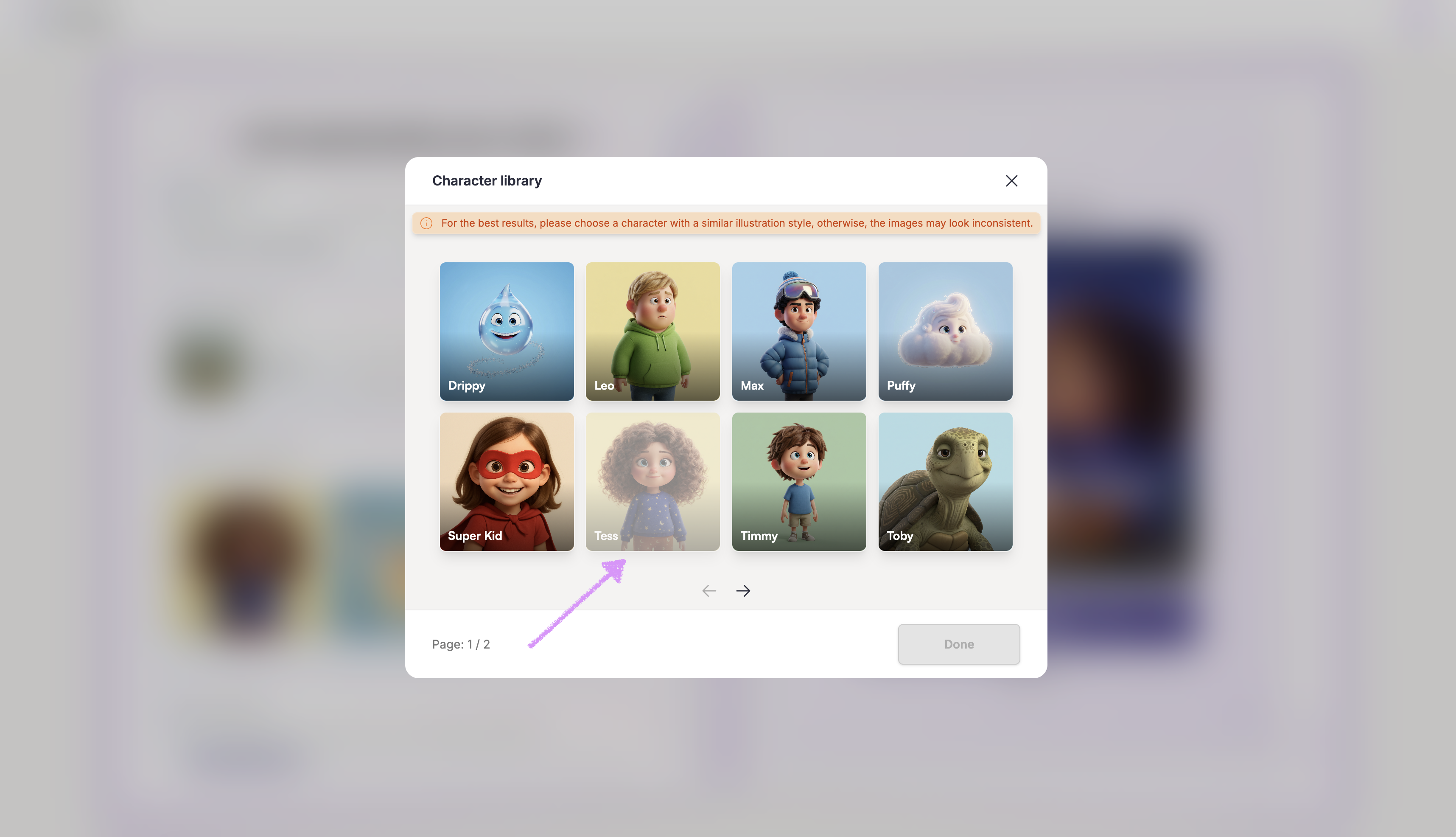 Ready to use the character in your book? Click on the character card to highlight it, then click on "Done" in the bottom-right corner to add it.