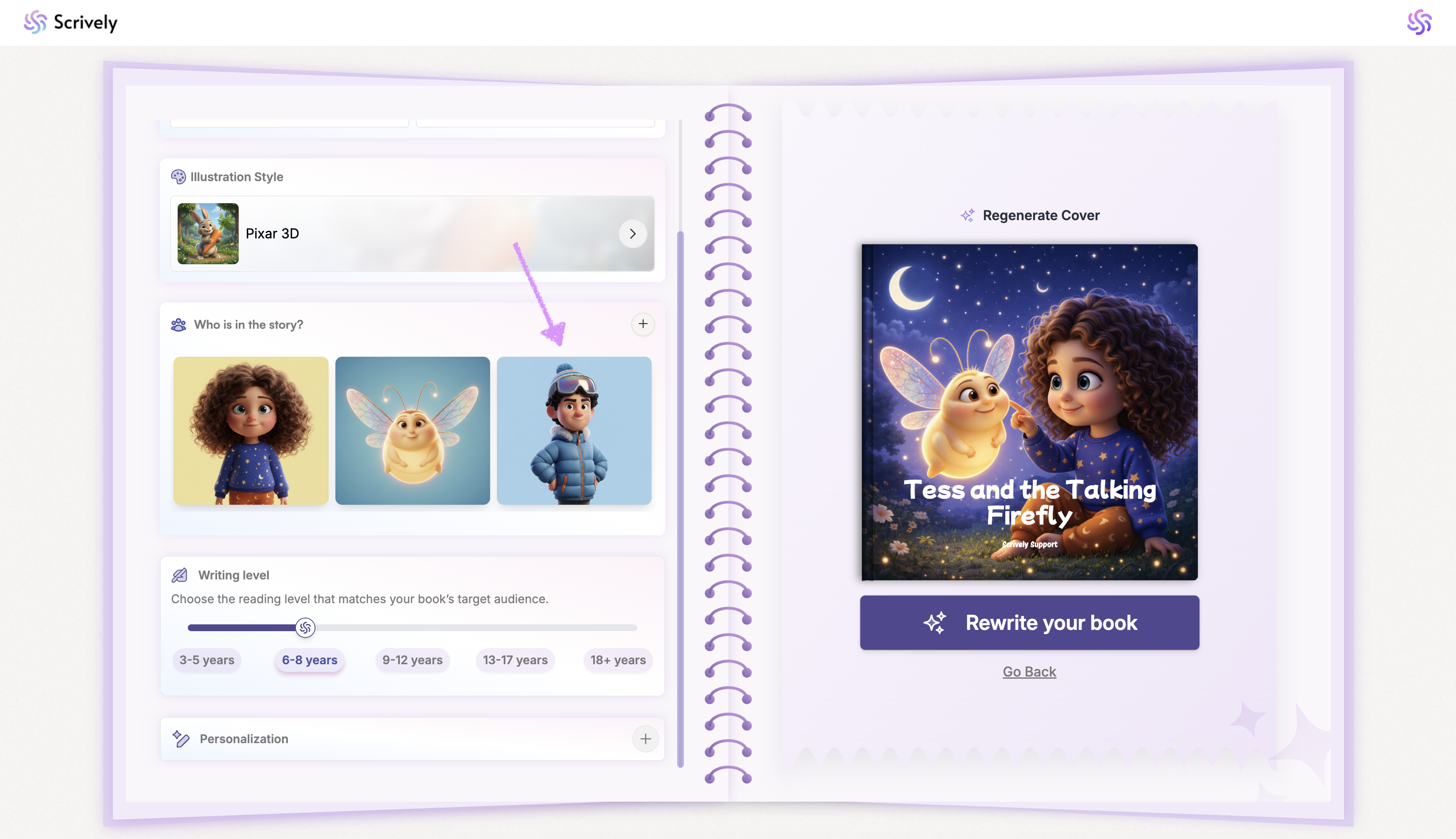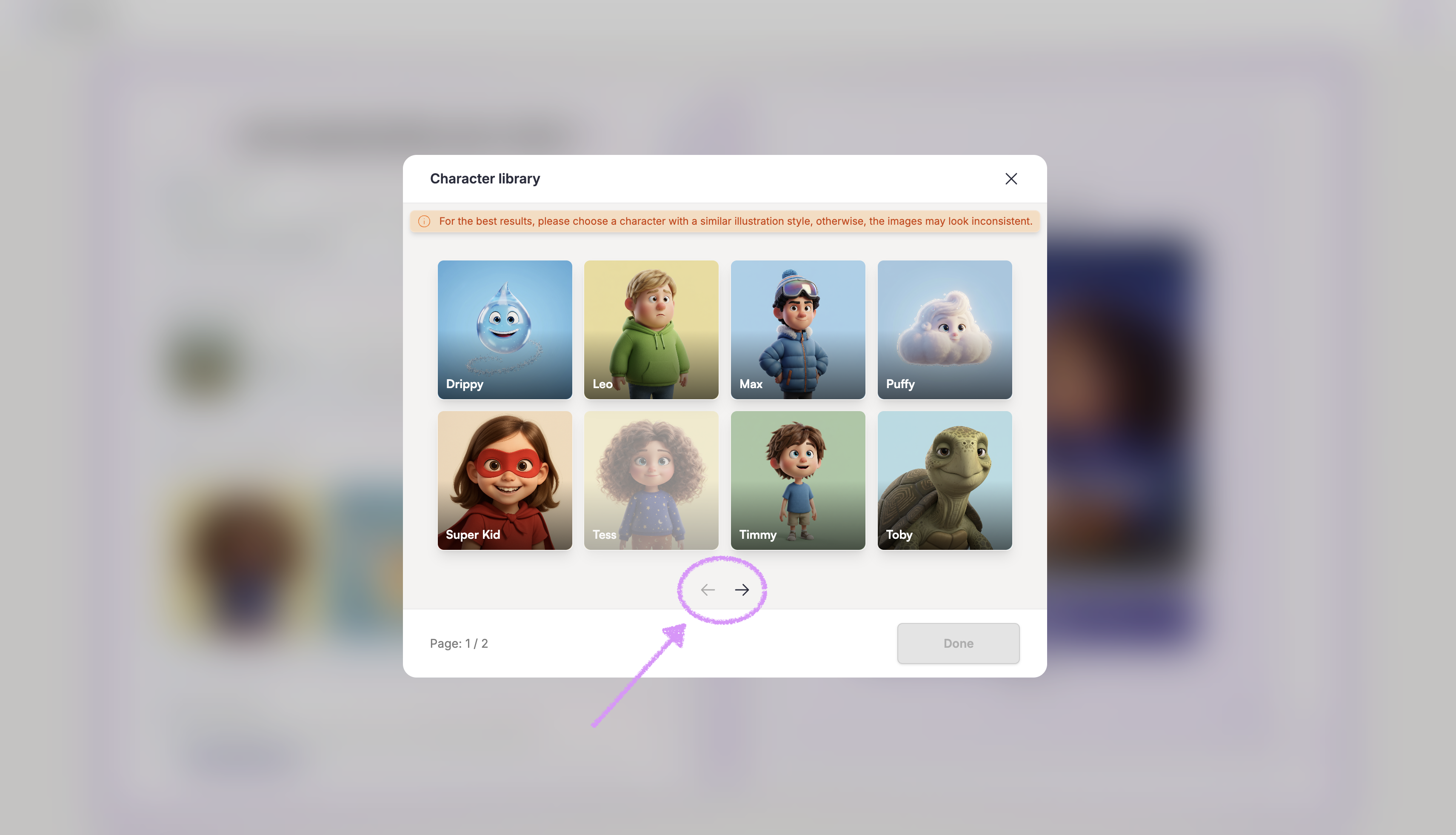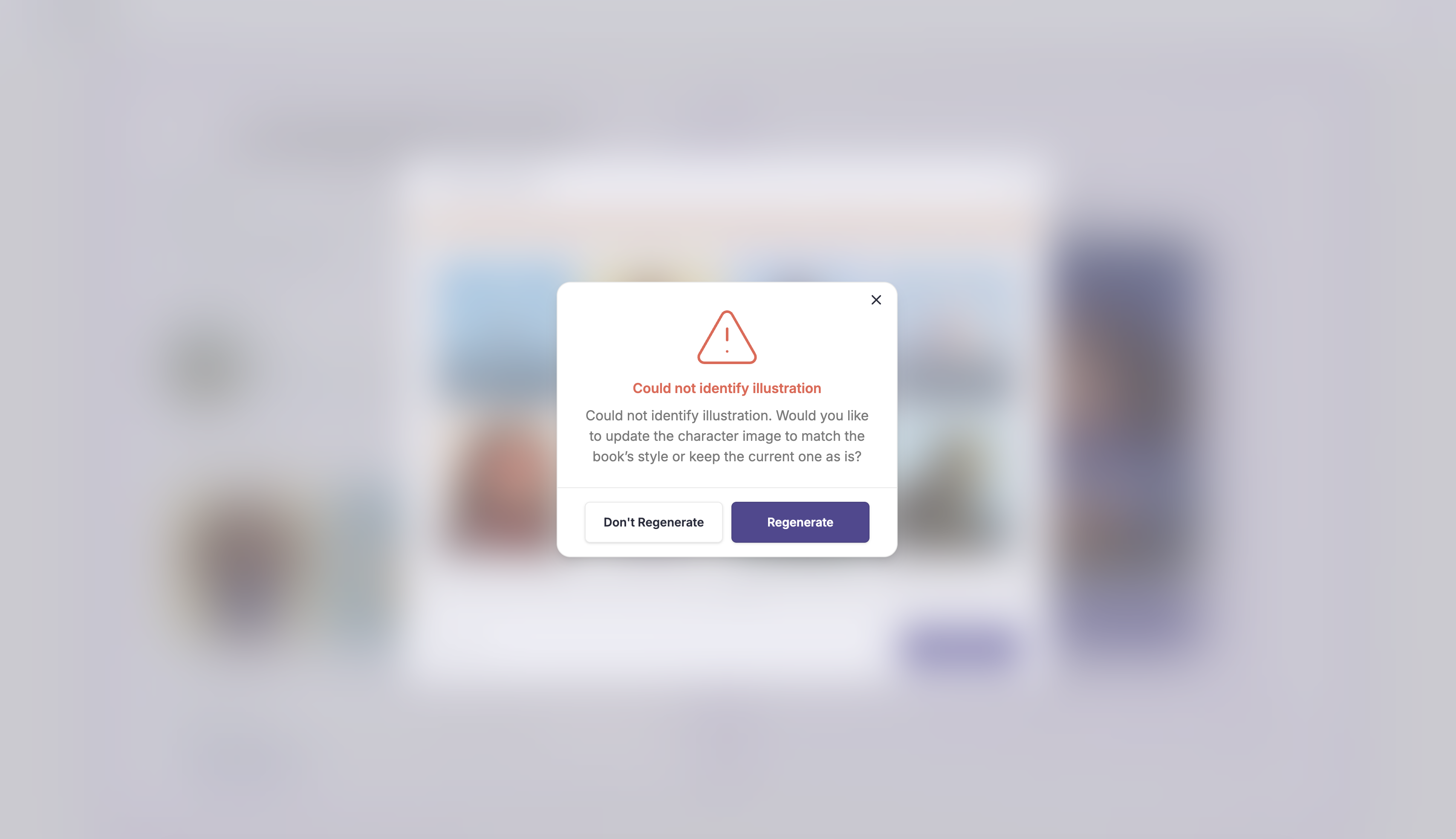 If a character’s illustration style in your library doesn’t match the selected storybook style, you’ll have the option to regenerate the character to align it or keep it as is. For a more consistent look throughout the book, we recommend regenerating the character.