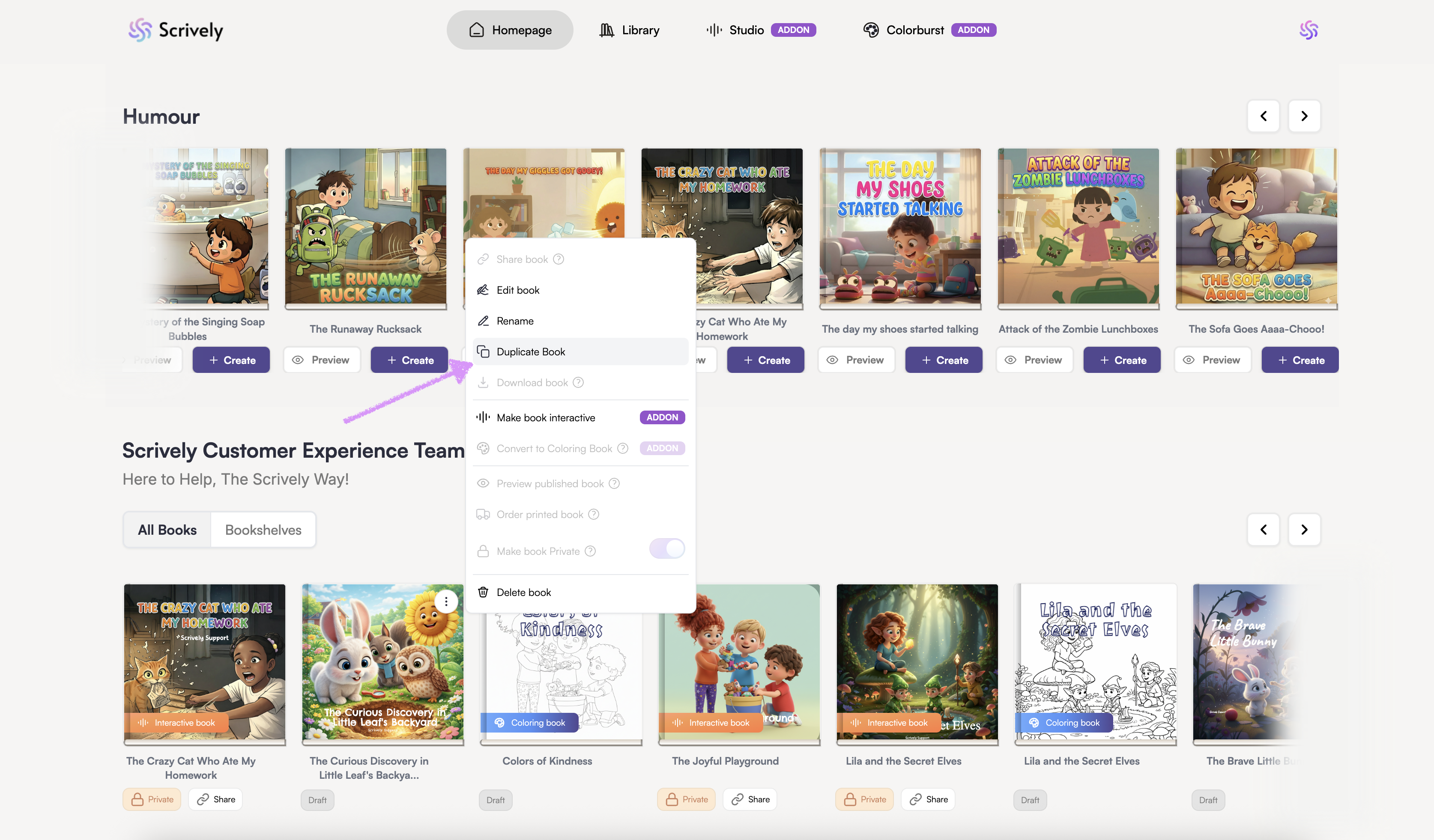 From your Scrively Homepage, navigate your library at the bottom, then hover over the book you want to duplicate. Click the ellipsis (⋮) menu that appears.