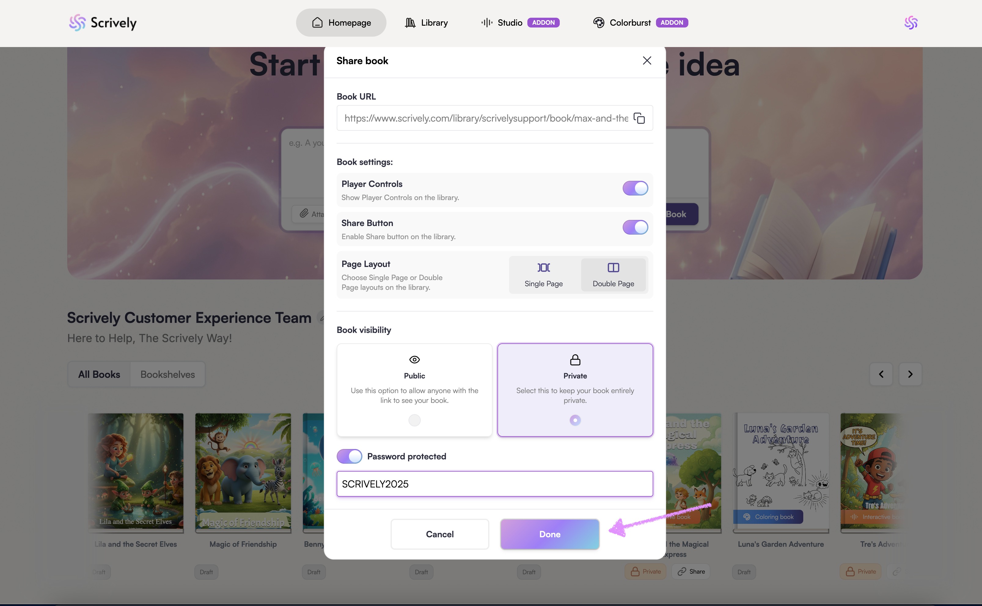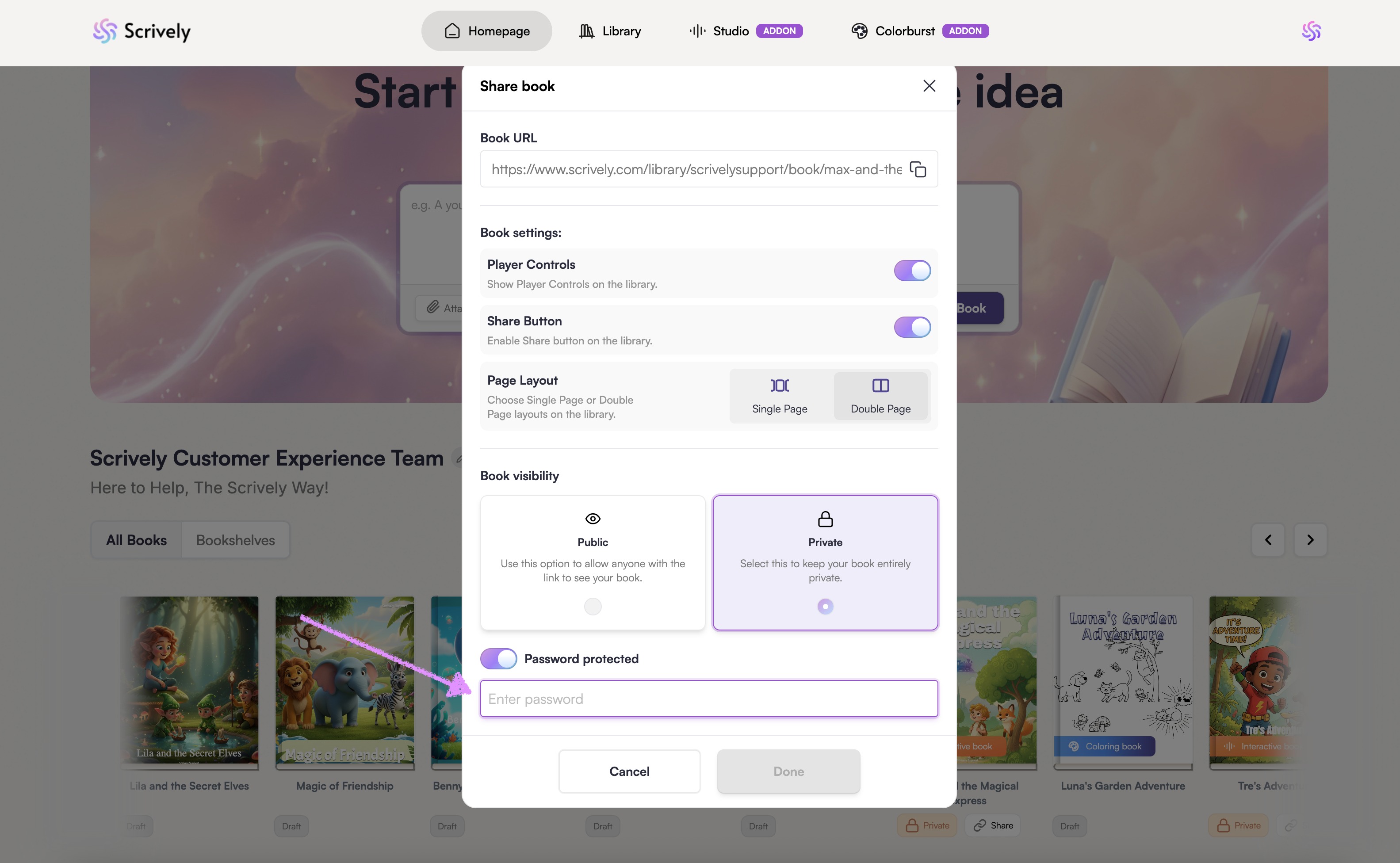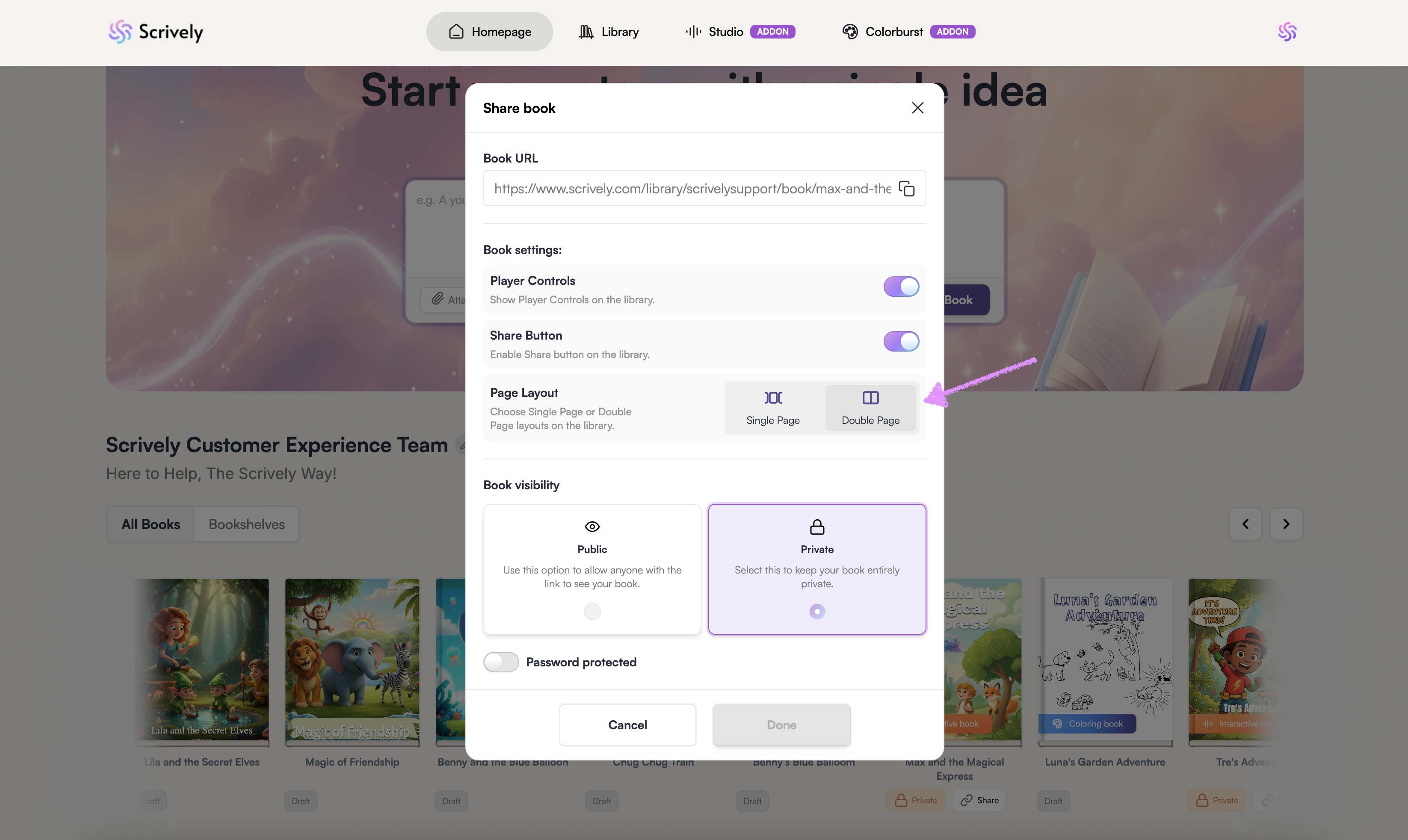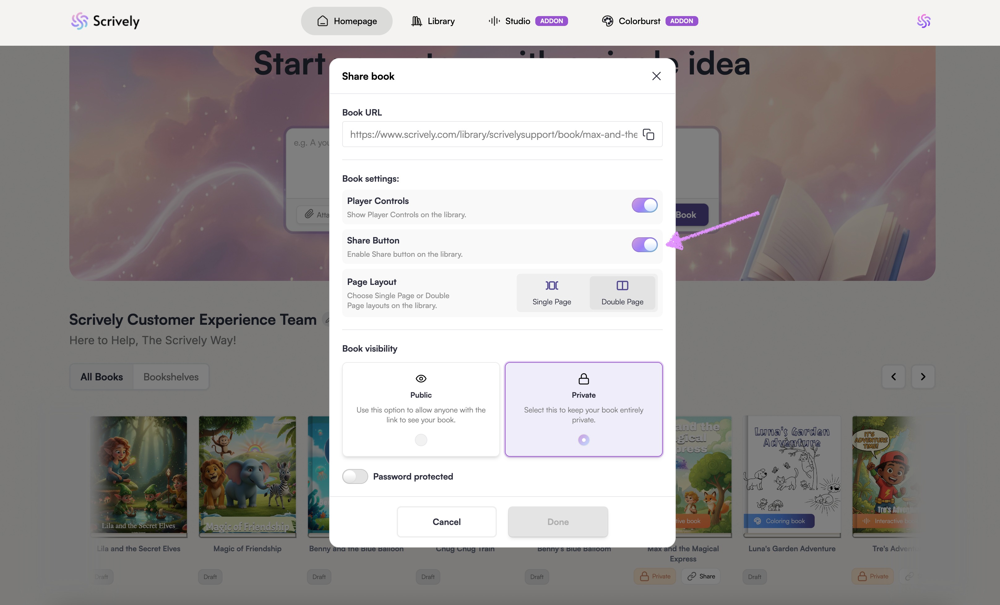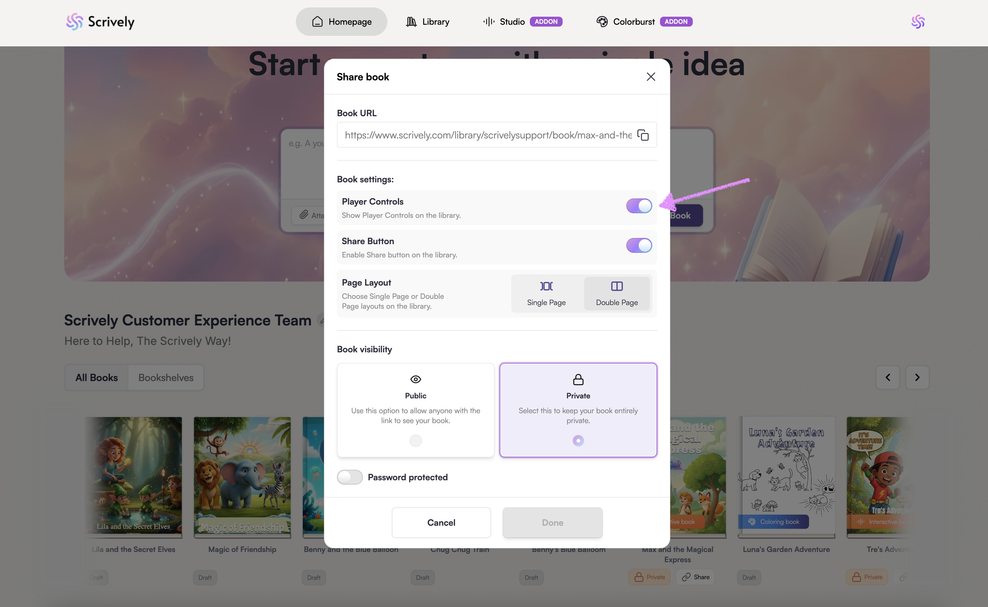 A modal will appear displaying the book’s URL along with settings for player controls, the share button, page layout, and visibility options "Public" or "Private."