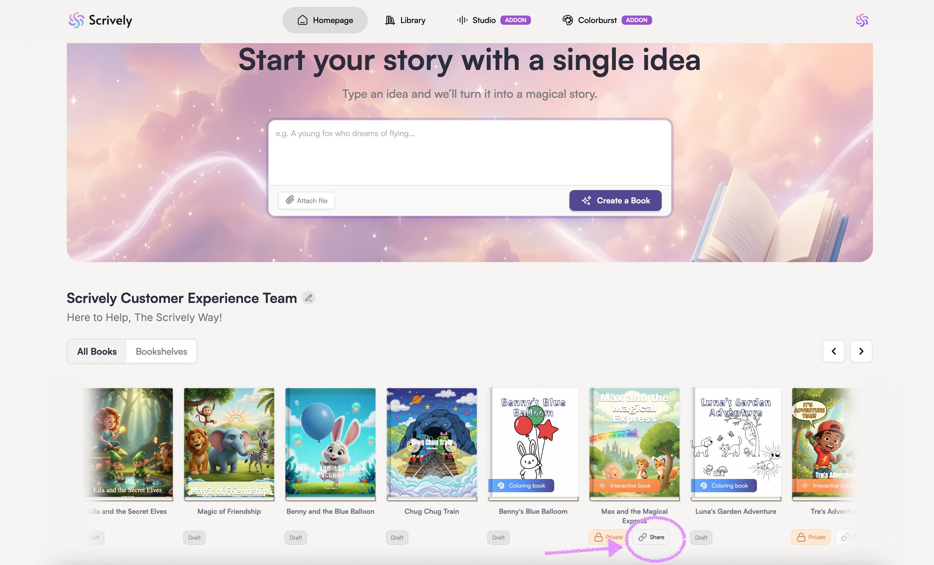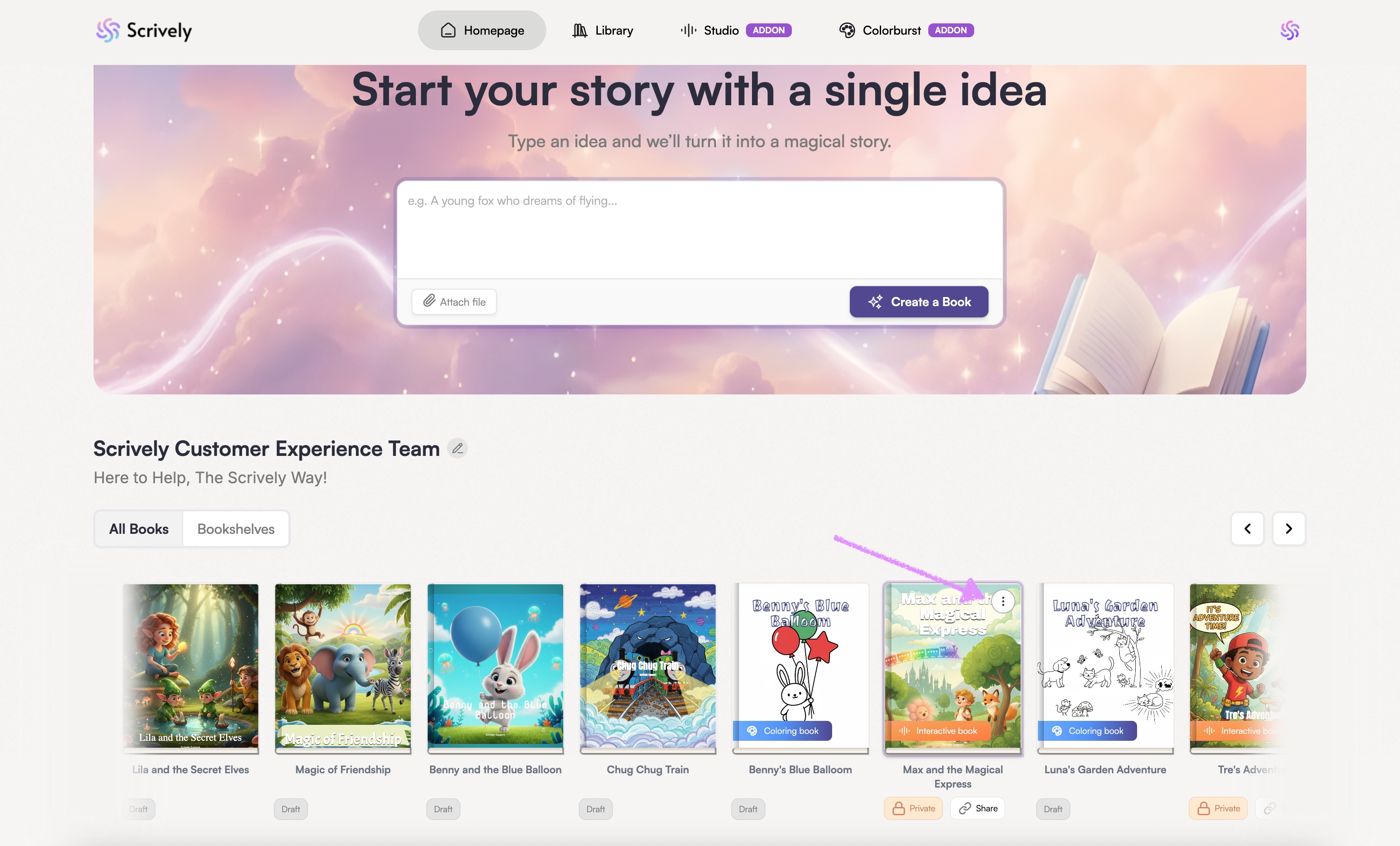 Alternatively, from your Scrively Homepage, scroll down to your library and hover over the book you’d like to share. Click the ellipsis (⋮) menu that appears.