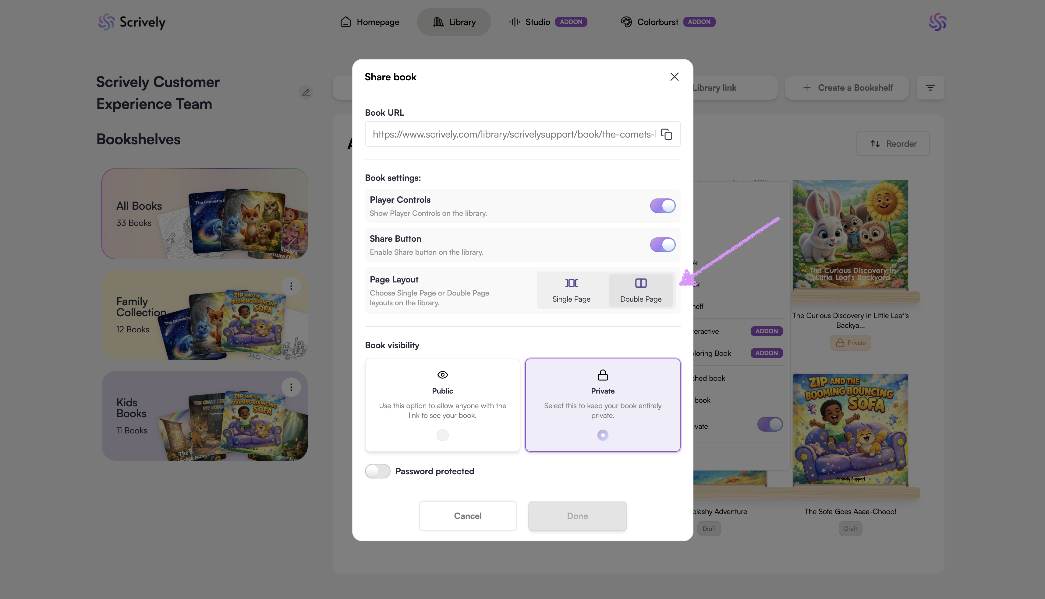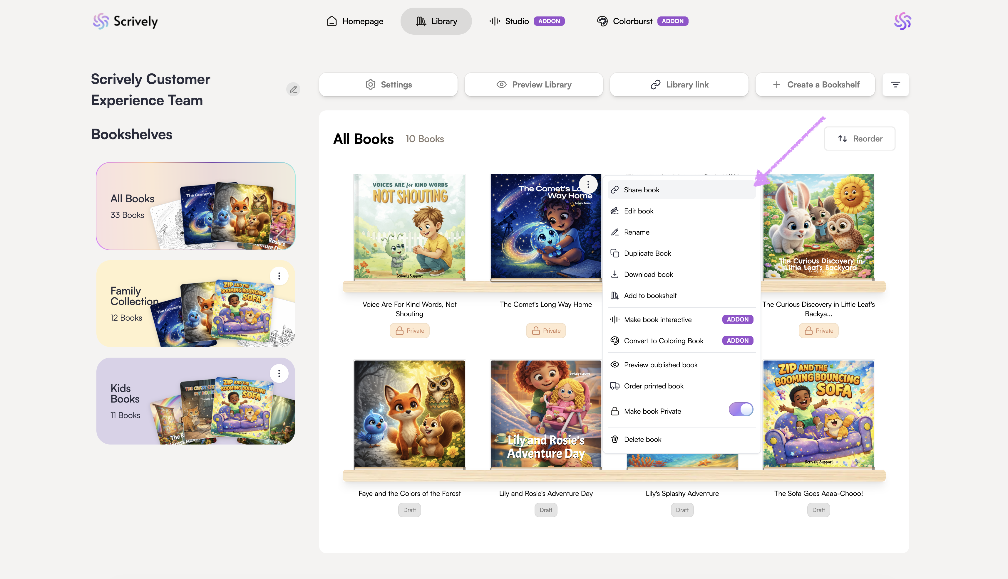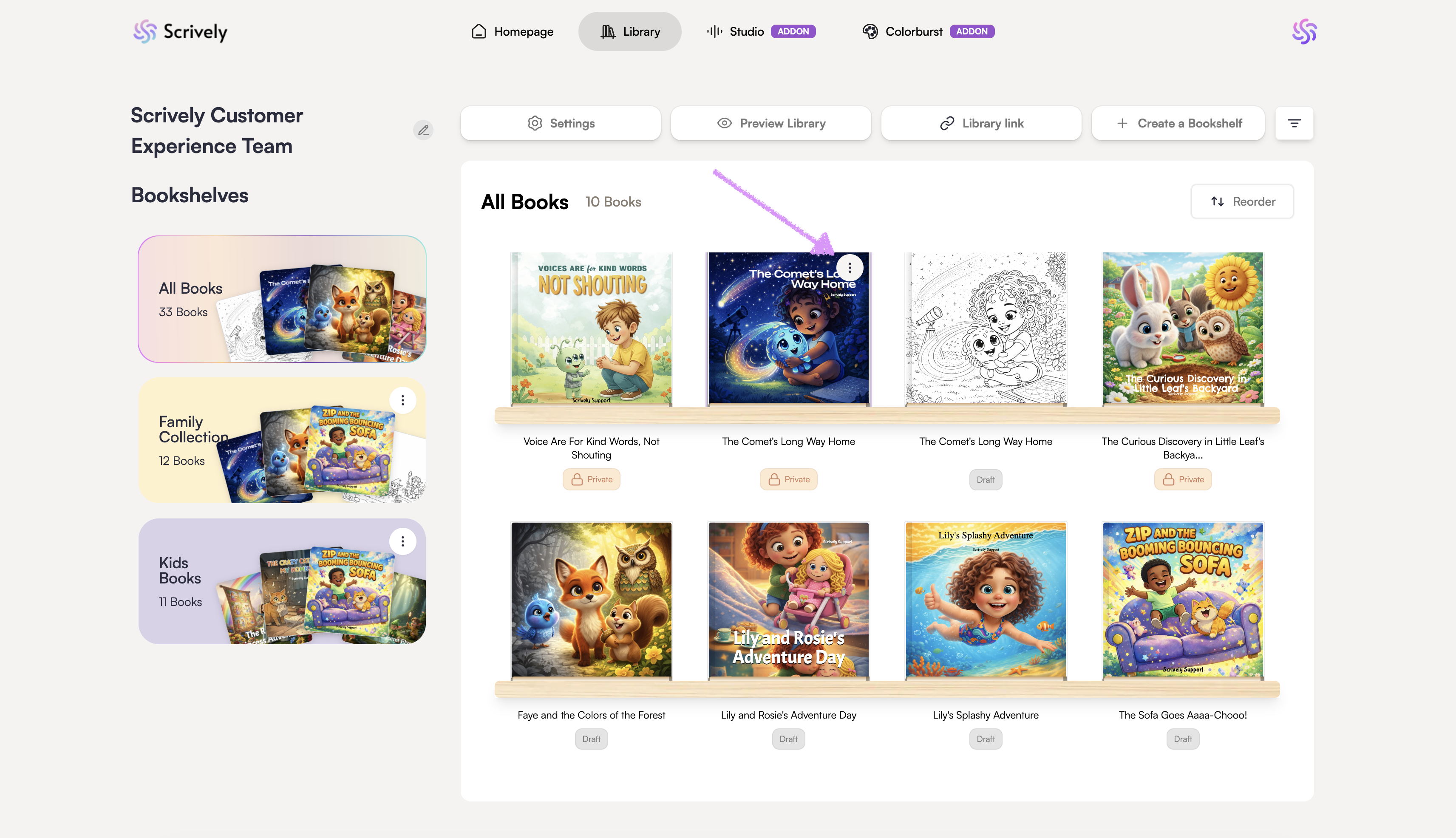 Managing individual book settings on your Scrively library gives you full control over each project. These settings are especially handy when working on adventure books or other interactive stories letting you seamlessly combine features like buttons, page jumps, and more (learn about those here).