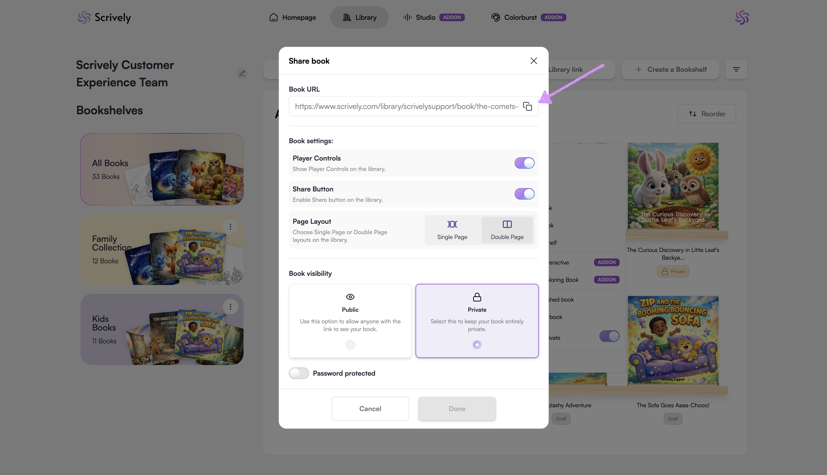 A modal will appear displaying your book’s settings, starting with the book’s URL.