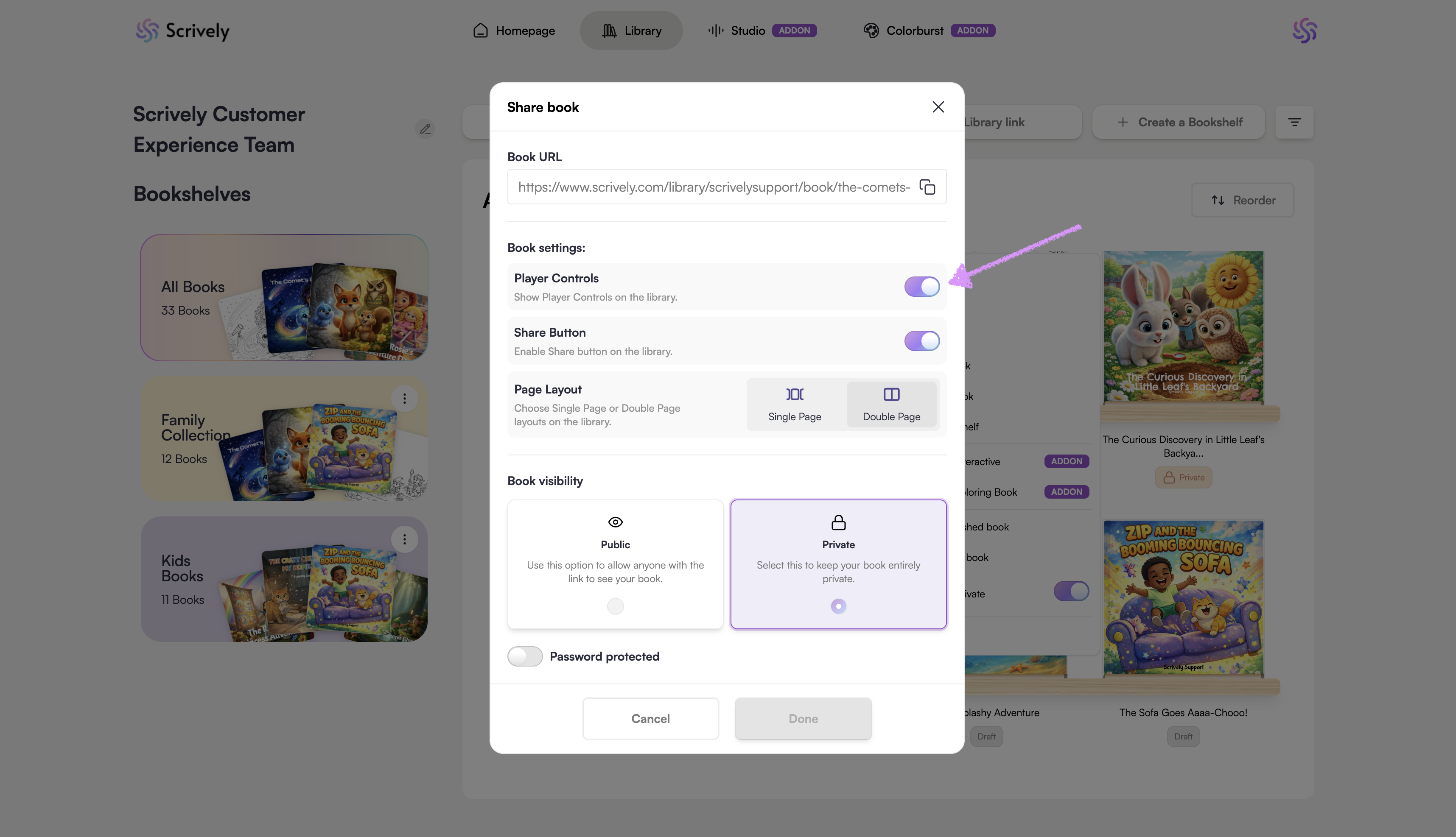 Toggle “Share Button” on or off. Turning this off prevents readers from sharing the book in your library.