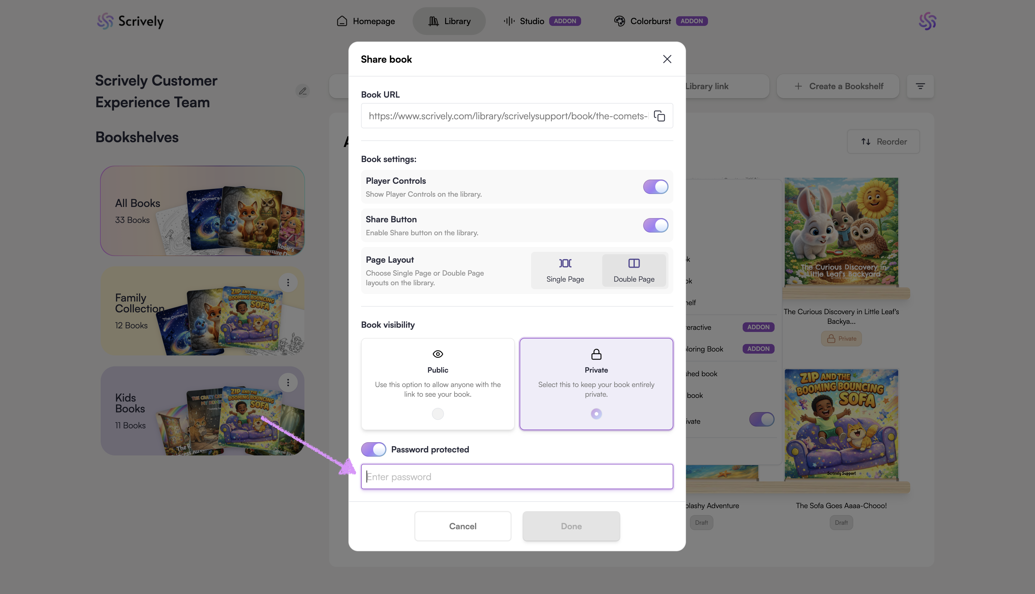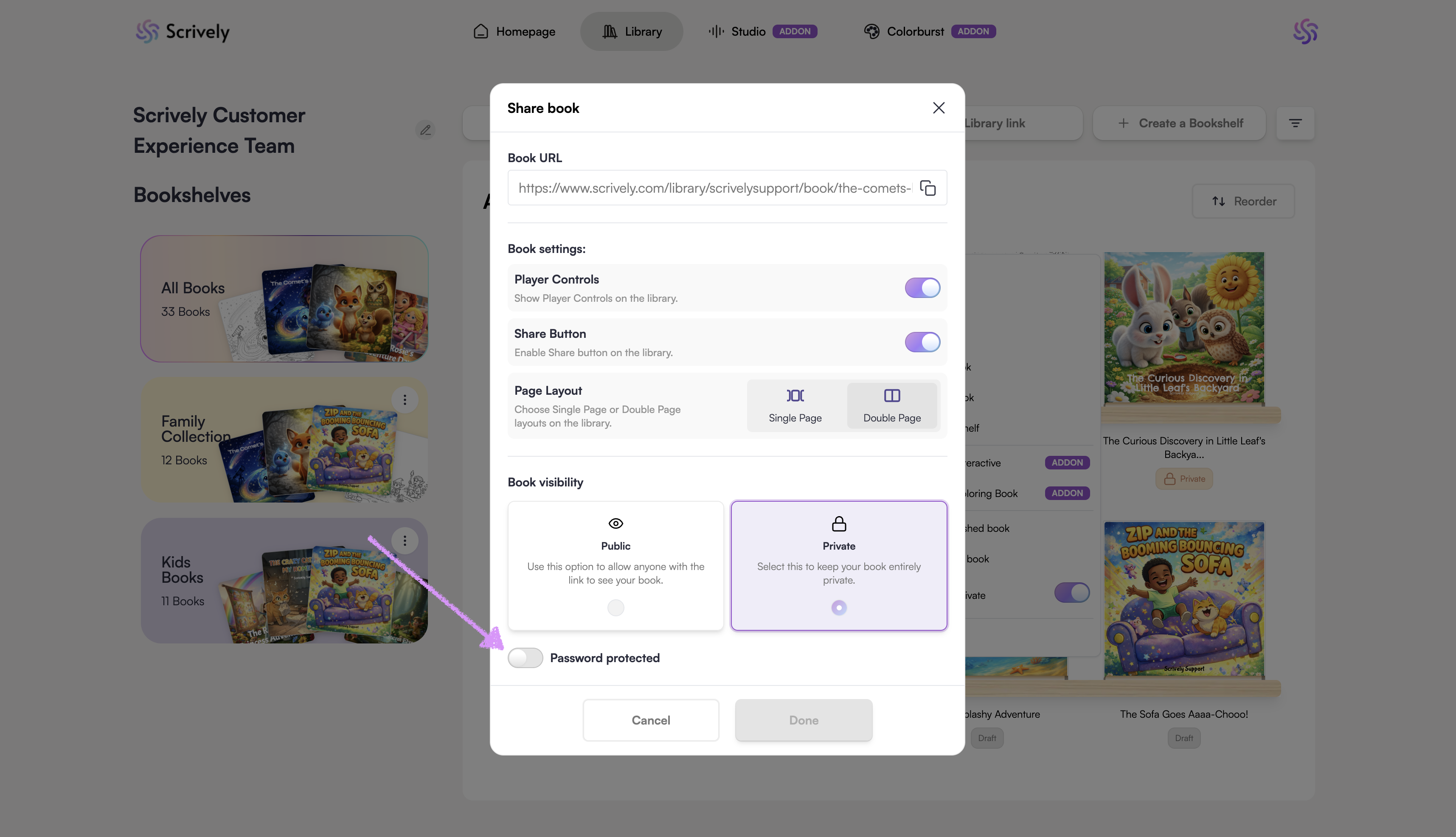 When you set the book visibility to "Private" a "Password protected" toggle will be displayed.