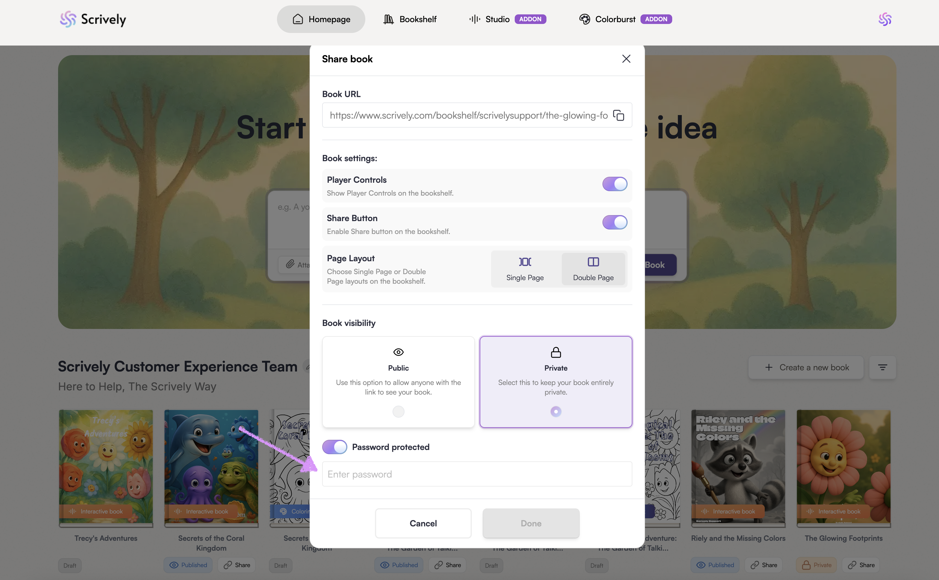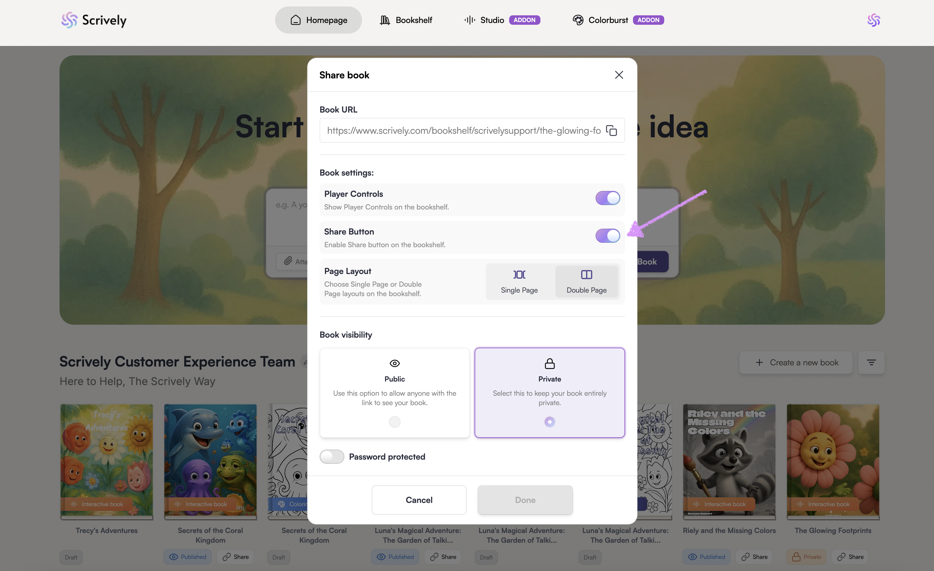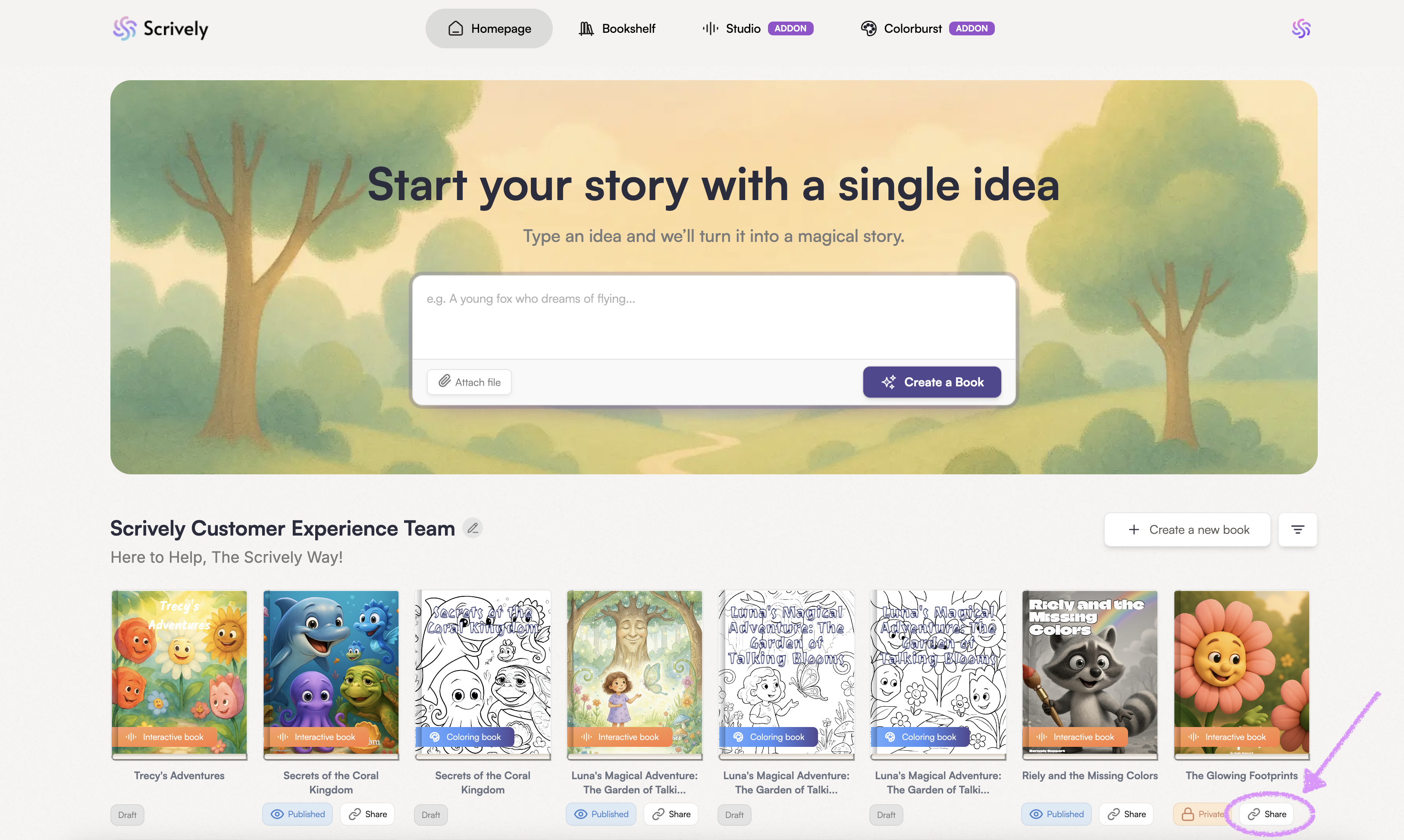 From your Scrively Homepage, go to your bookshelf and click “Share” below the book you want to share.