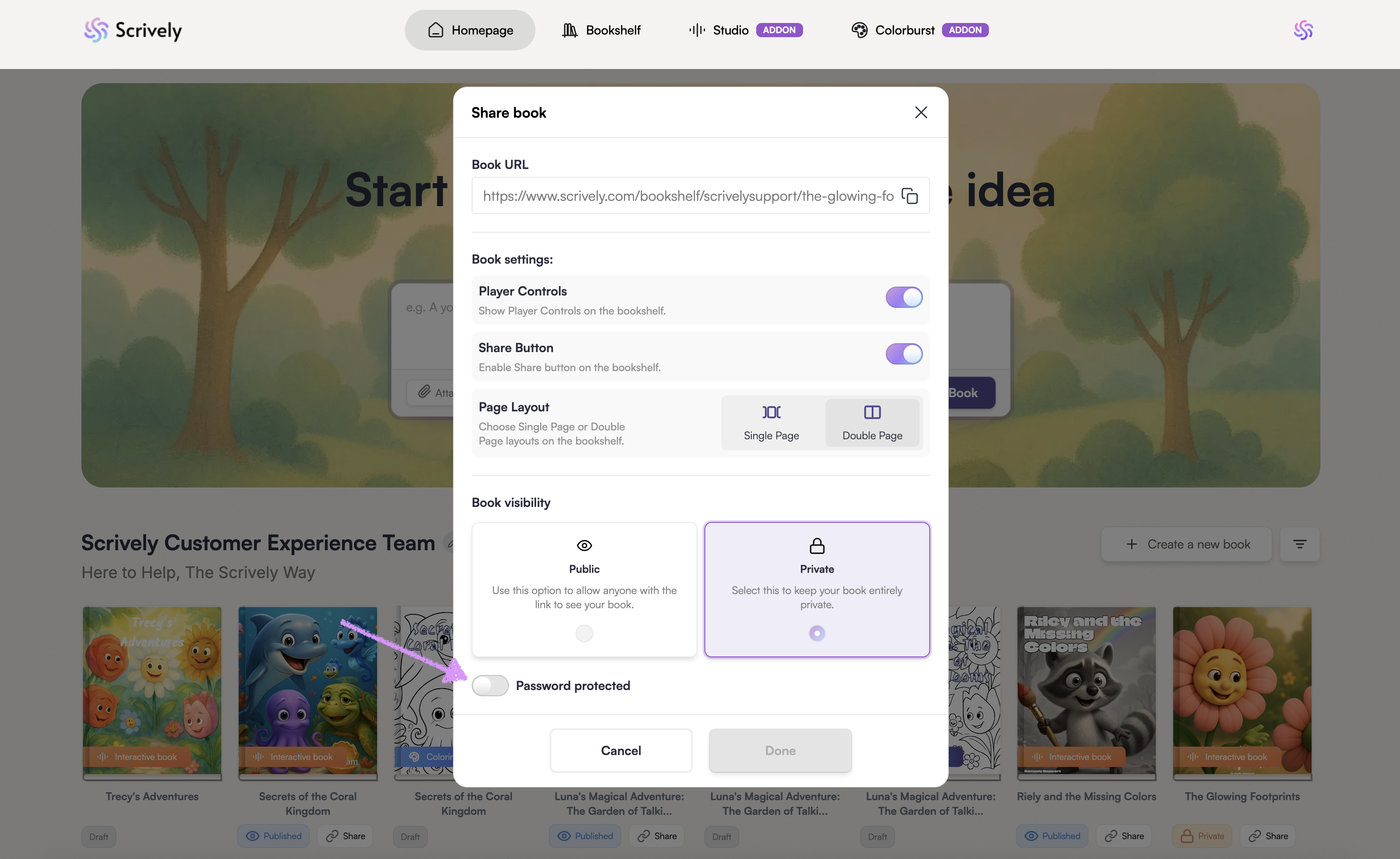 When you set the book visibility to "Private" a "Password protected" toggle will be displayed.