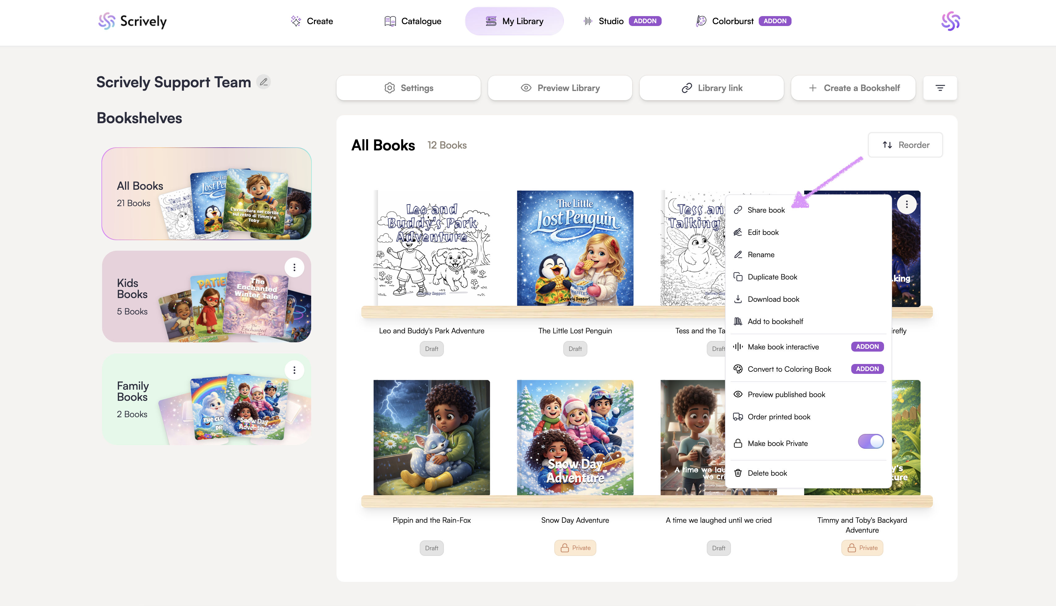 Managing individual storybook settings on your Scrively library gives you full control over each project. These settings are especially handy when working on adventure books or other interactive stories letting you seamlessly combine features like buttons, page jumps, and more (learn about those here).